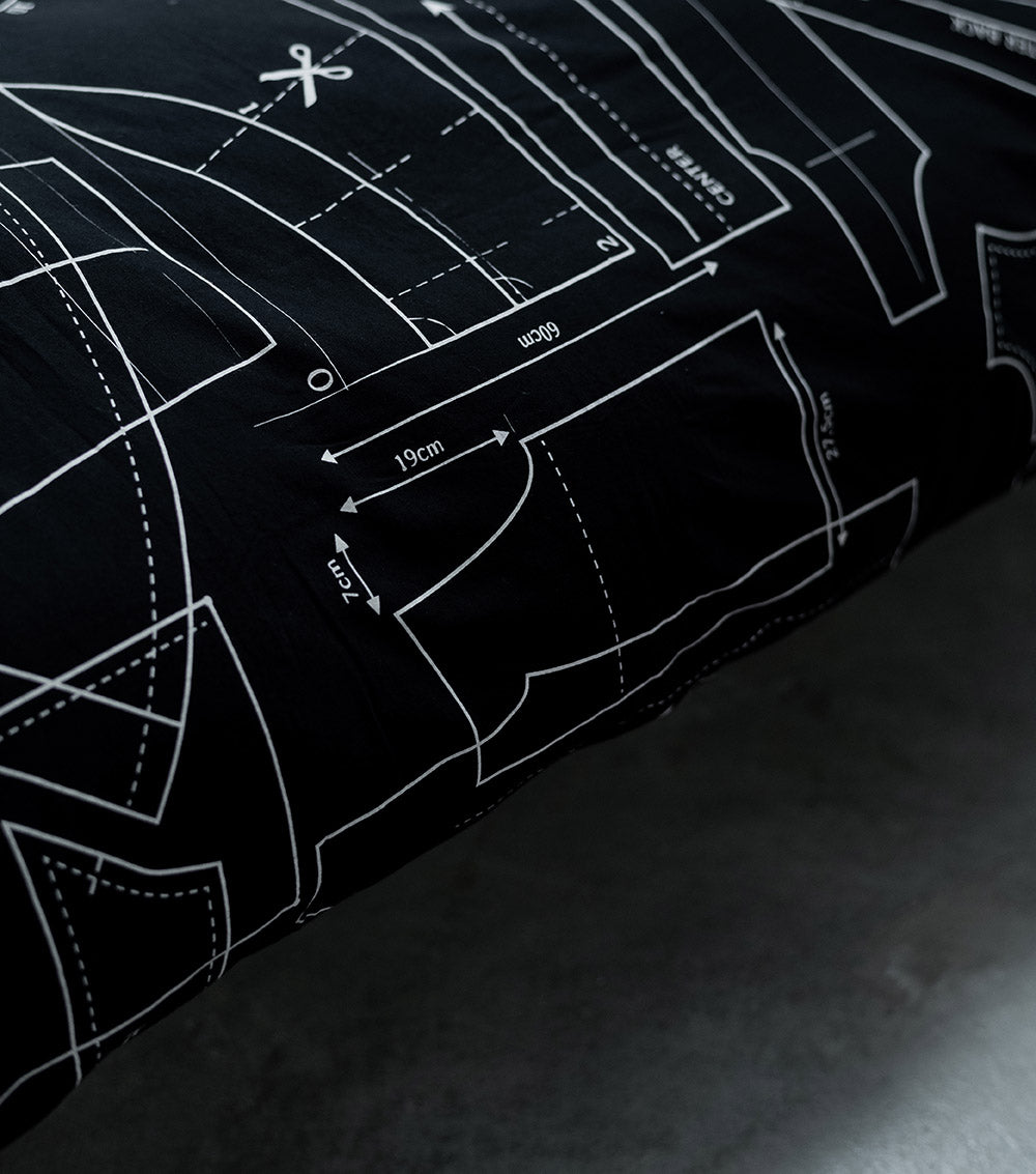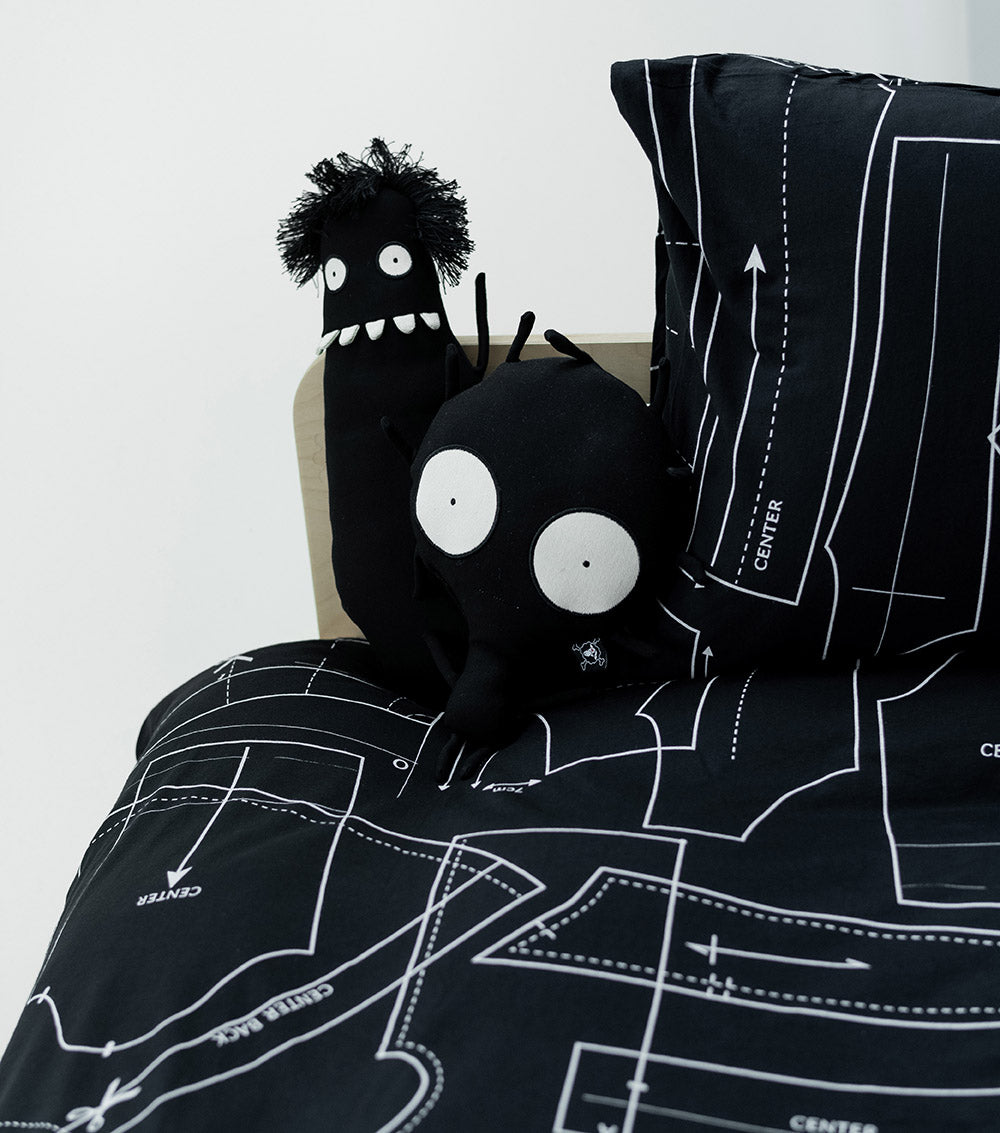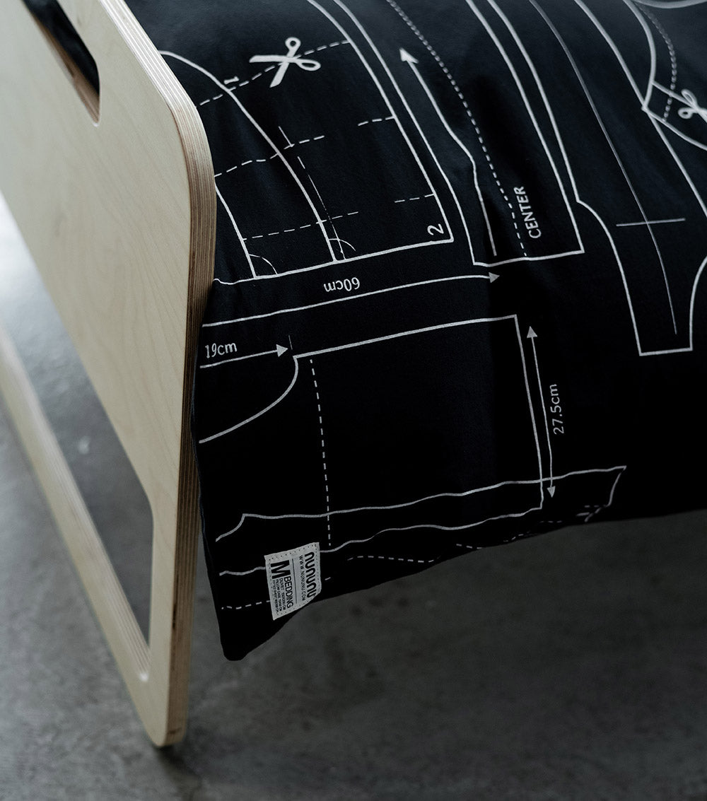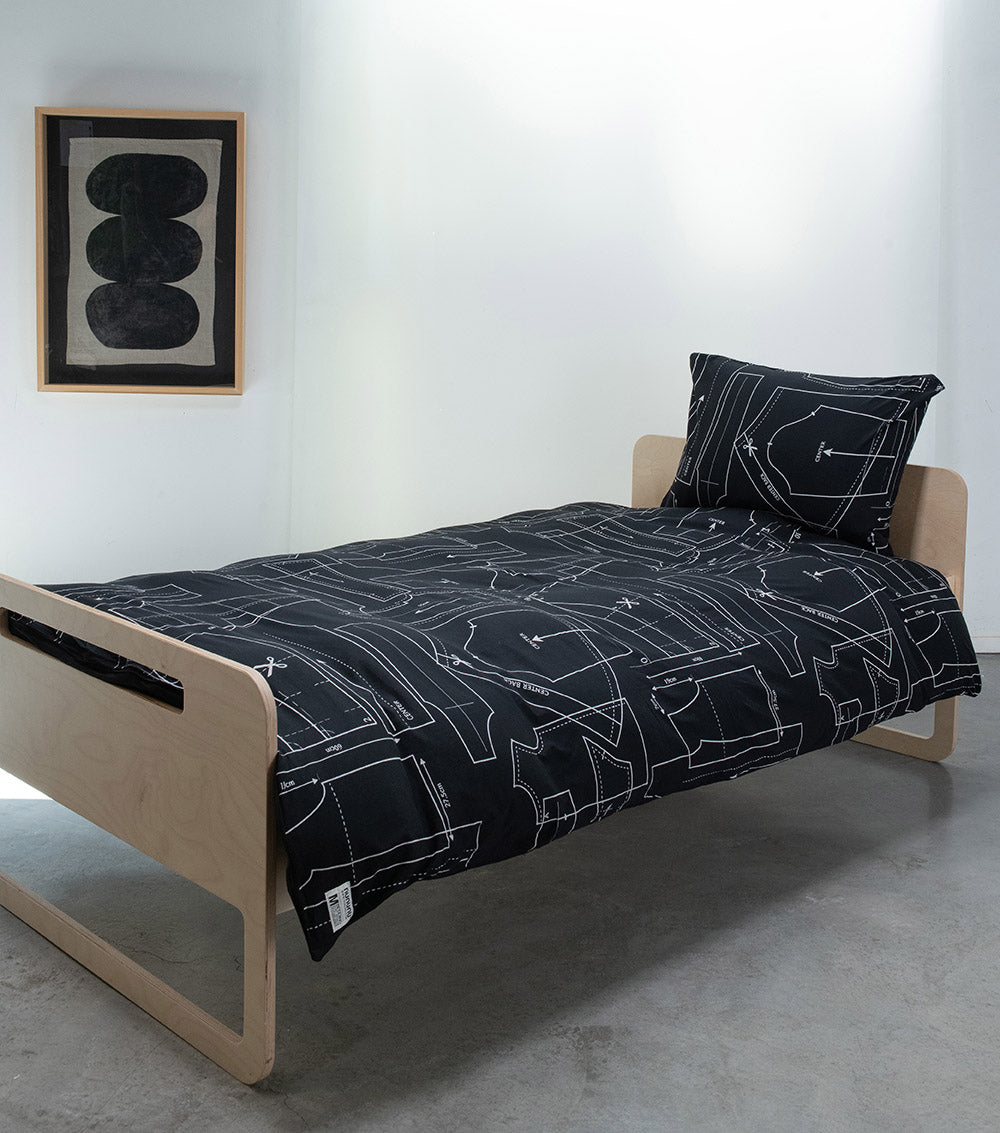 nununu kids will rest easy on our bedding set. this one features our black sewing pattern print, a manifestation of our current obsession with getting back to the basics of fashion. the boys’ & girls’ bedding set is available in white or black, which both work well with any bedroom decor scheme. the set includes a fitted sheet & printed duvet & pillow, a full look for their nununu lifestyle. needless to say, all our bedding sets are made from our signature super soft cottons turning bedtime into a real cloud like event!