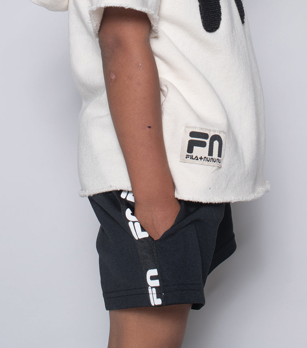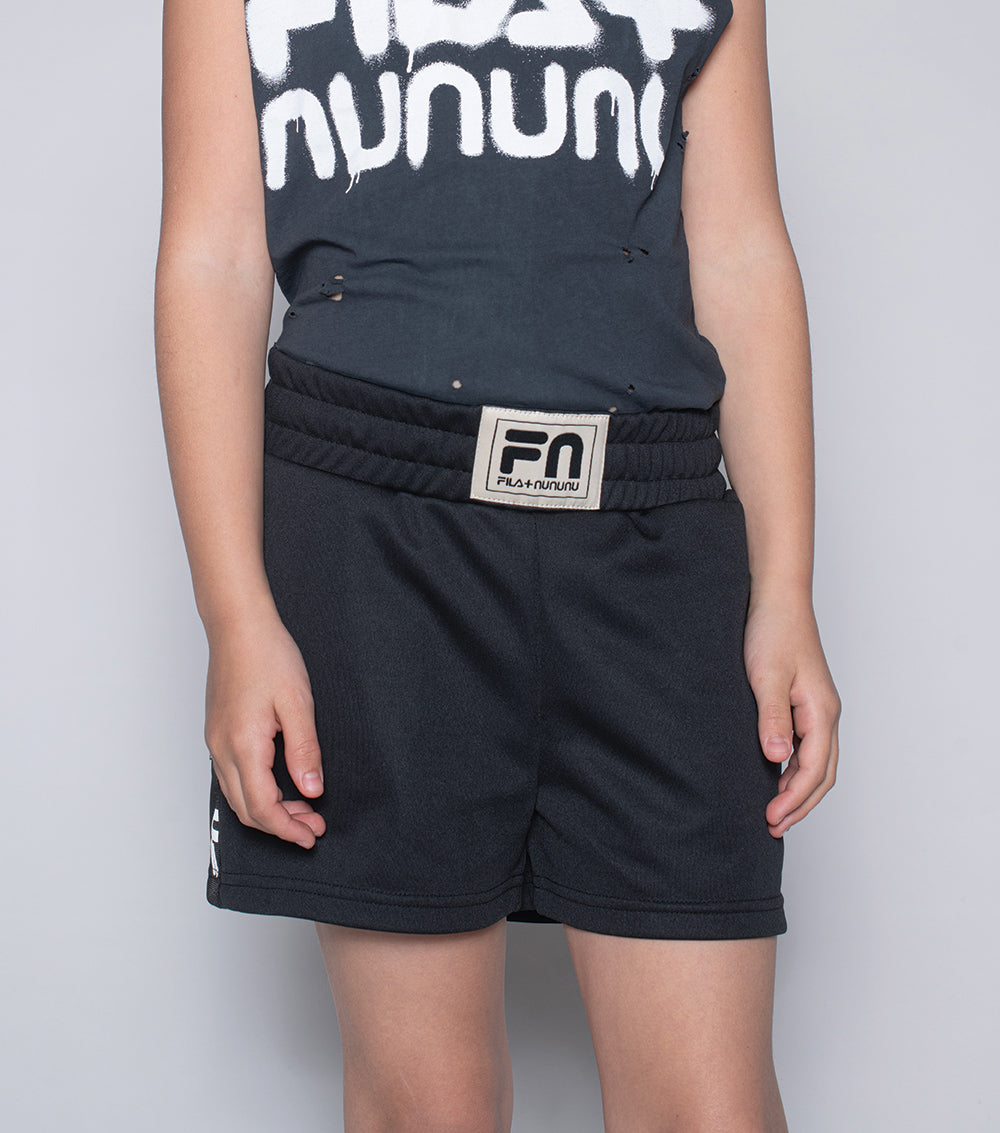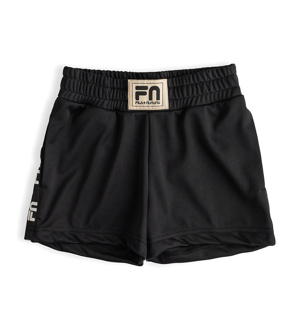 for major rocky vibes, try these unisex black boxing shorts, part of our collabo with FILA. cut in a cool, slightly flared shape, they’ve got that old school feel, with sporty stripes down the sides featuring our mashup FILA+nununu logo. a wide elastic waistband keeps them in place, with a logo tag in front.