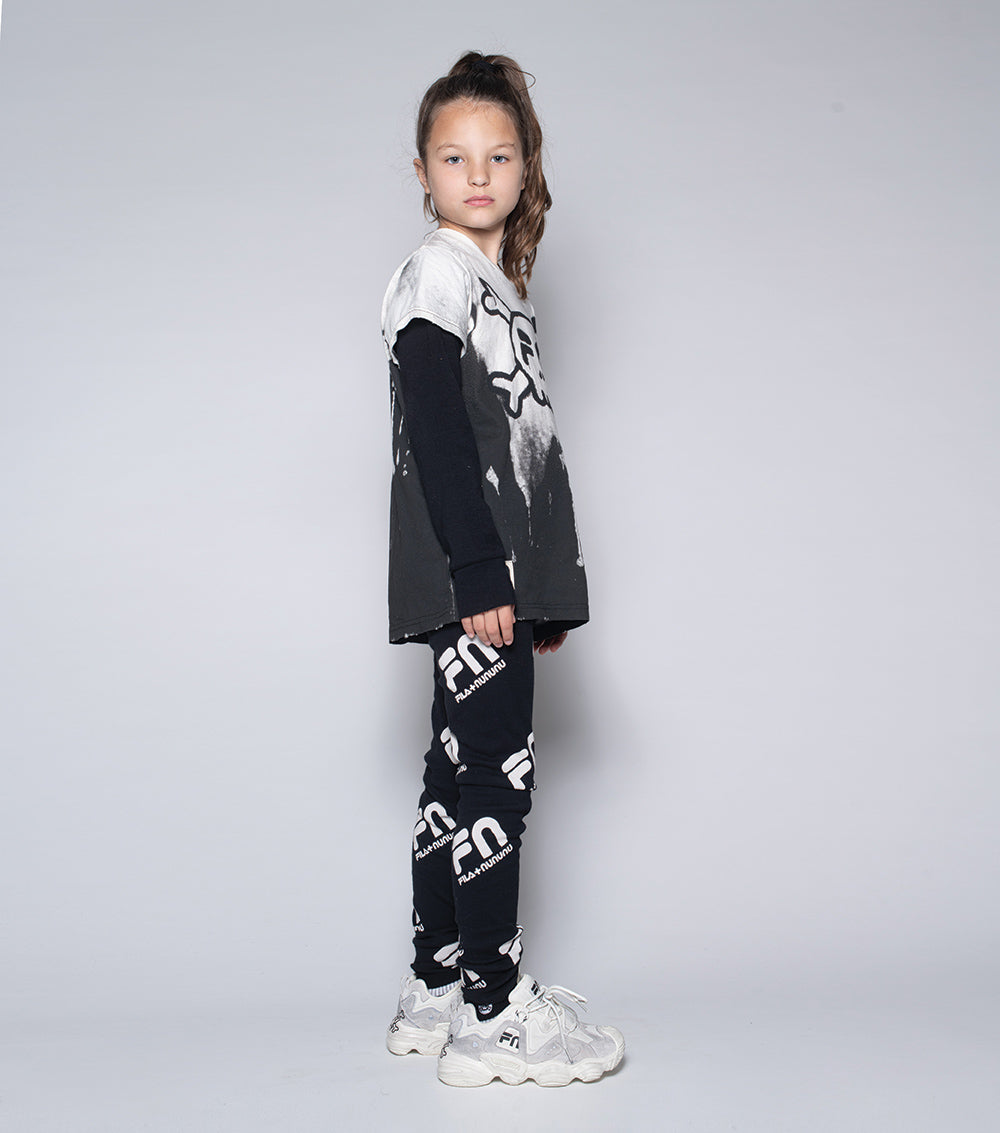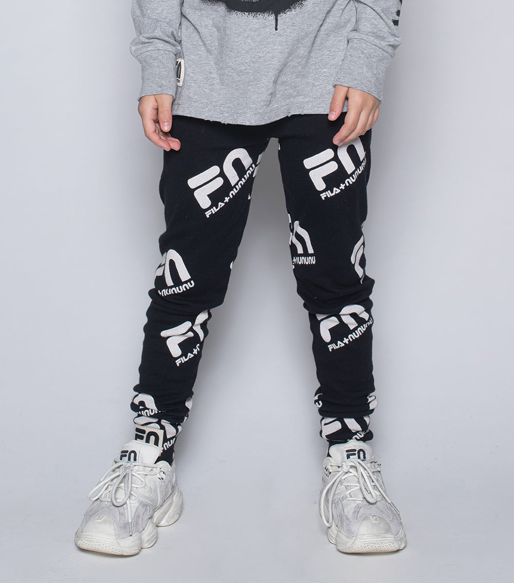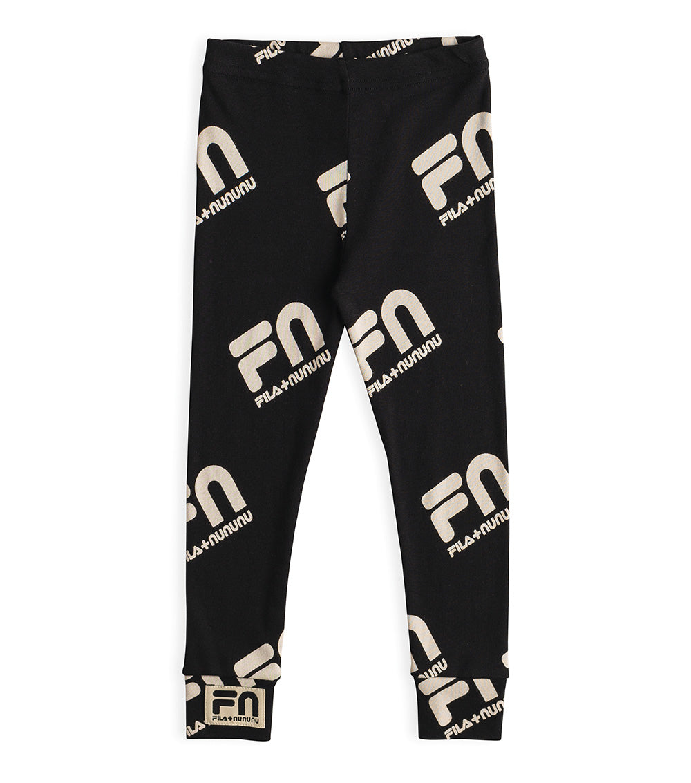 the FILA+nununu mashup logo dances all over this classic nununu item, our classic black leggings for boys & girls. a product of our collabo with the coolest sportswear brand we know, they’re a good look for any day of the week, with tees, hoodies & dresses layered on top. super-soft nununu cotton makes it easy for boys & girls to play, run, and take over the world. the tag is on the outside near the cuff because we don't feel like we need to do things like everyone else & hey, the kids agree.