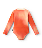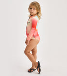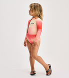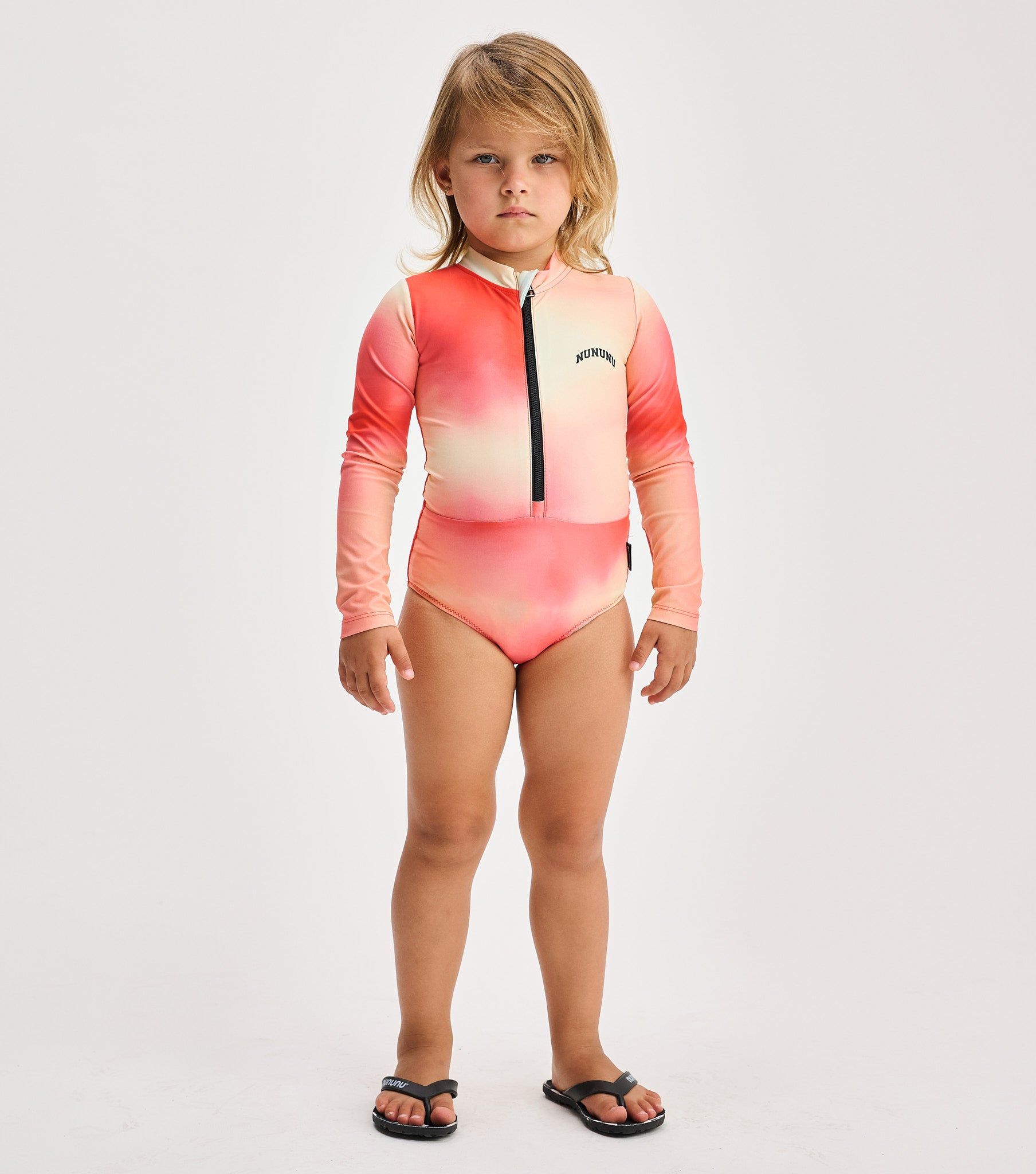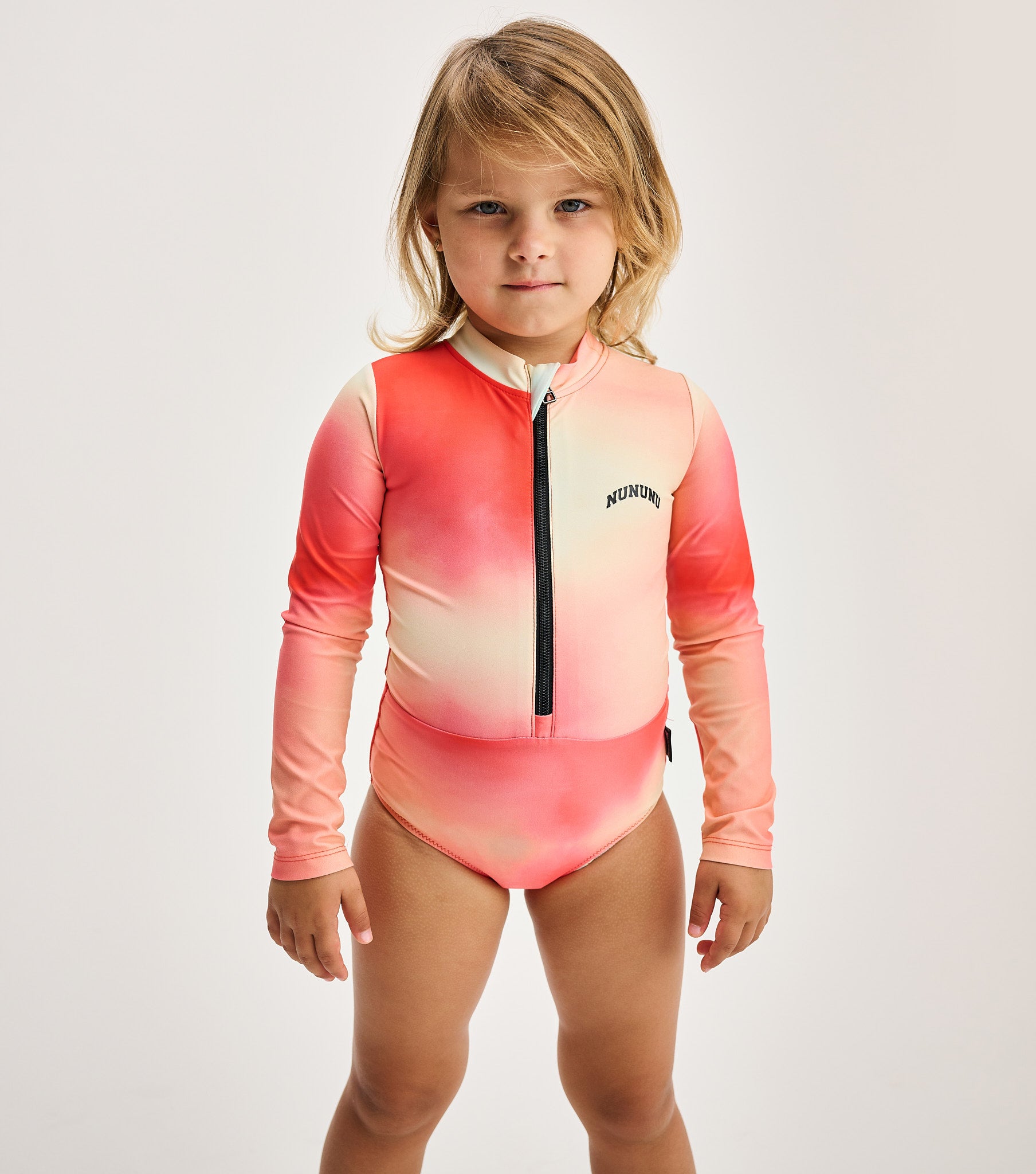 channel all your mermaid vibes with this bright swimsuit. it’s a blend of sunset colors fading from hot coral to light peach & a light pastel turquoise. a comfy covered zip runs from neck to belly where it meets up with a horizontal seam. ideal for riding waves at the beach or creating them in the pool. our logo makes an appearance on the chest in black, keeping the look sporty in arched collegiate style letters. yep, your kid will want to wear this all summer long.