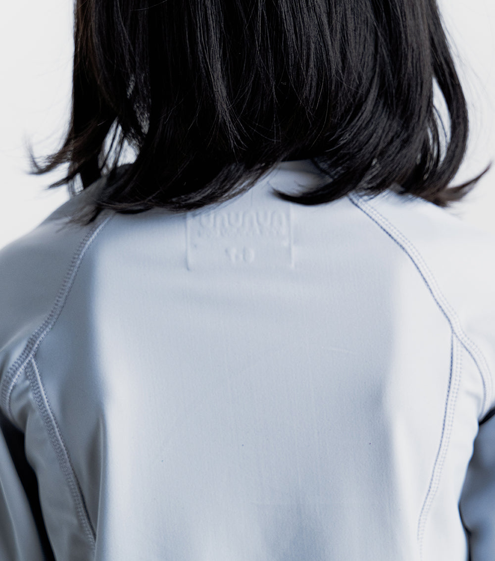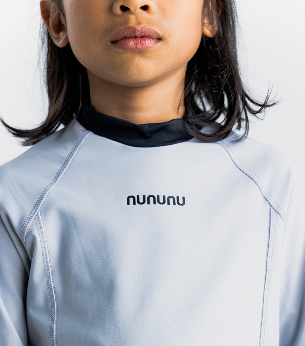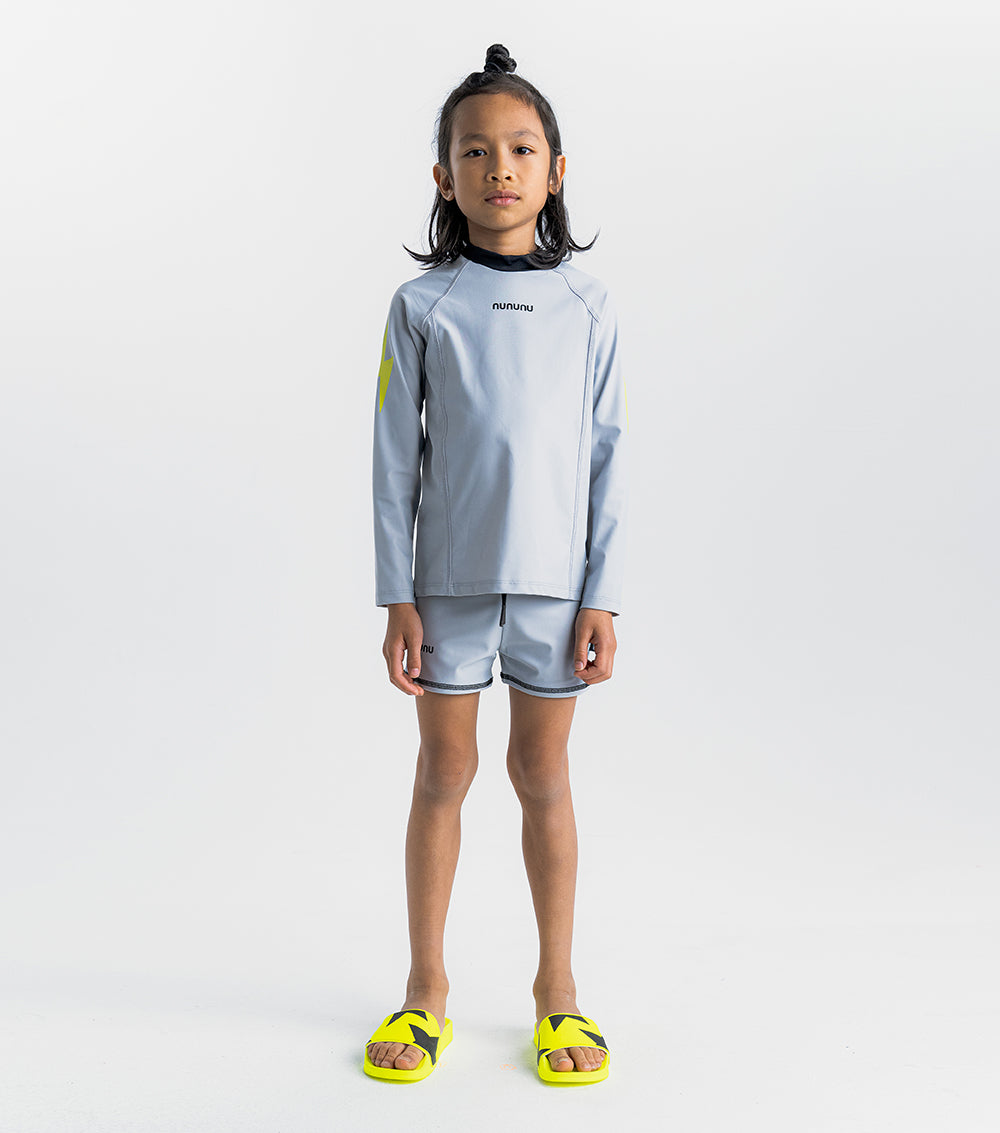 your kid can hit the sand & the surf with a sleek & simple look that will still turn heads. we’re talking about this lunar grey long sleeve rashguard for boys & girls. with a black collar for contrast & a hot lime lightning bolt on the sleeve for that extra strike of energy. oh yeah and it says nununu on the chest so that everyone on the boardwalk won’t have to wonder where you got it.