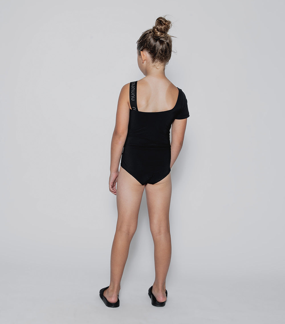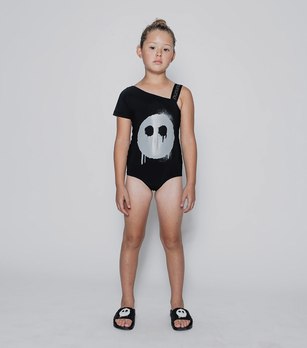 it’s going to be tough to find a more unique swimwear look than this black single sleeve suit. one shoulder is short sleeved, while the other pops out with our wide elastic logo strap. black performance material is the backdrop for our new “melting mask” graphic, a highly rebellious take on the smiley face. classic cut legs give plenty of coverage & stay put for every adventure in & out of the water.