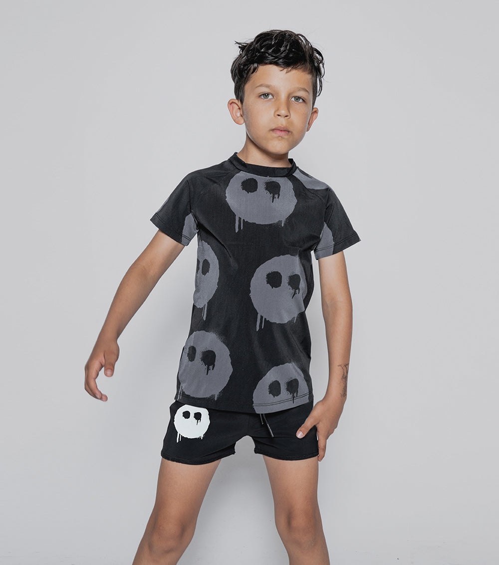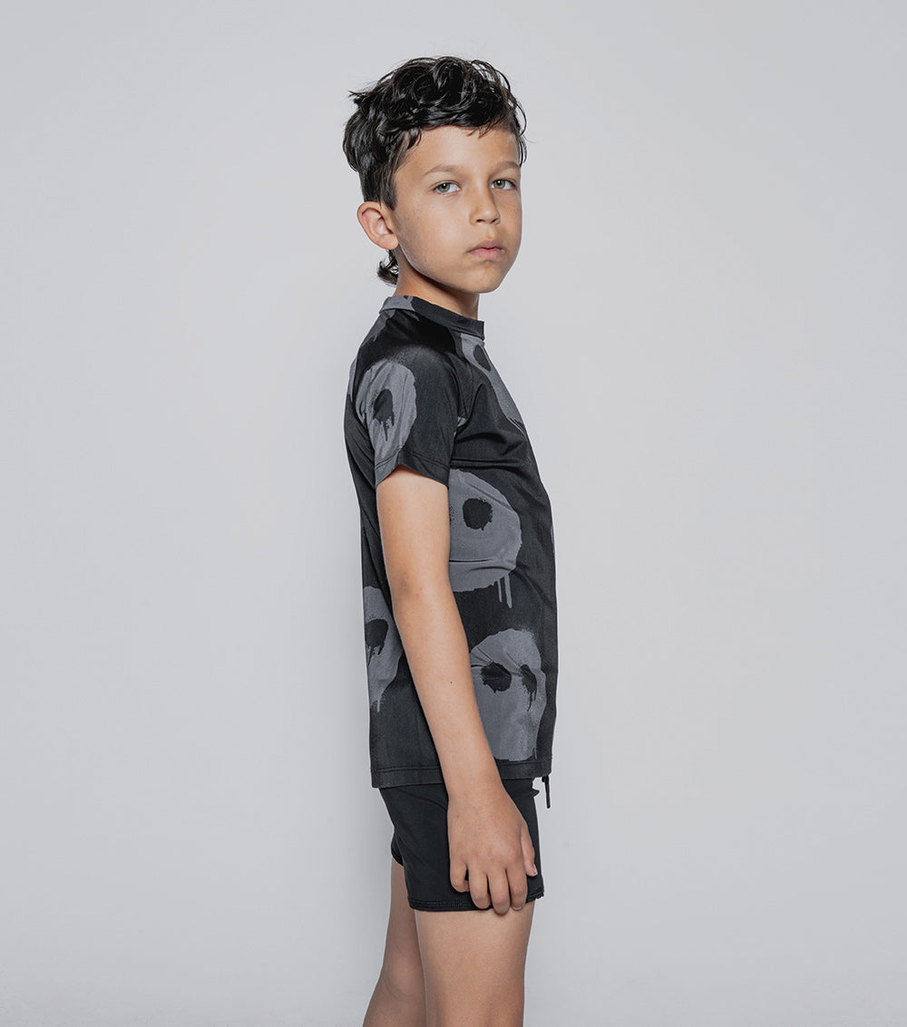 this short sleeved unisex rashguard comes in classic black with our new melting mask print all over. it brings a bit of a “beach goth” feel to the whole resort scene—a clever take, if you ask us. apart from the dopeness of the design, our rashguards are great for sun protection & paddling out on the boogie board. pairs with any shorts or swimsuit for high-style looks at the beach and beyond.