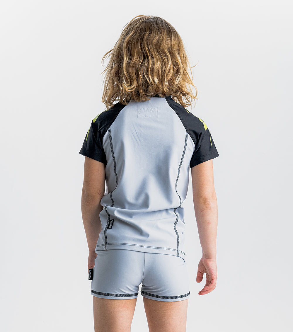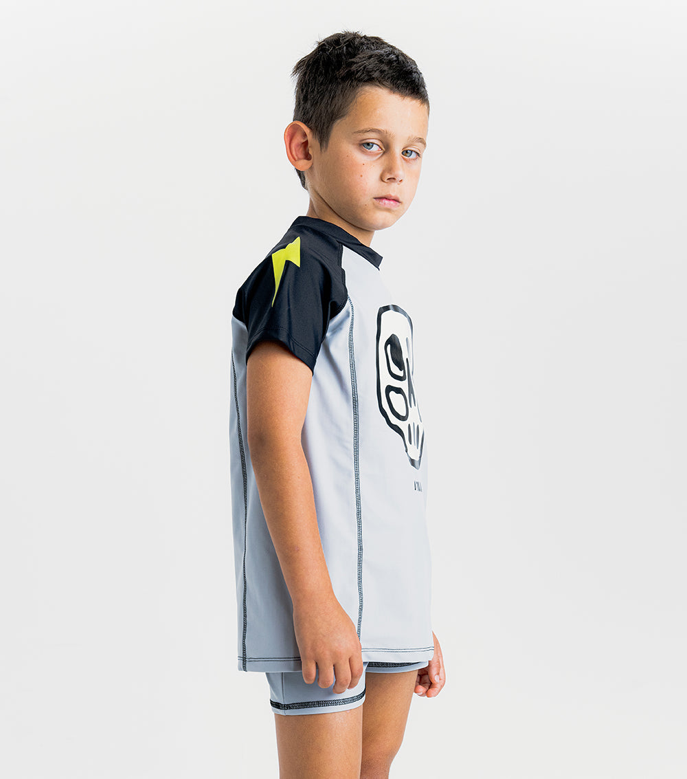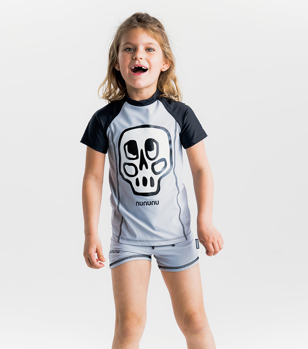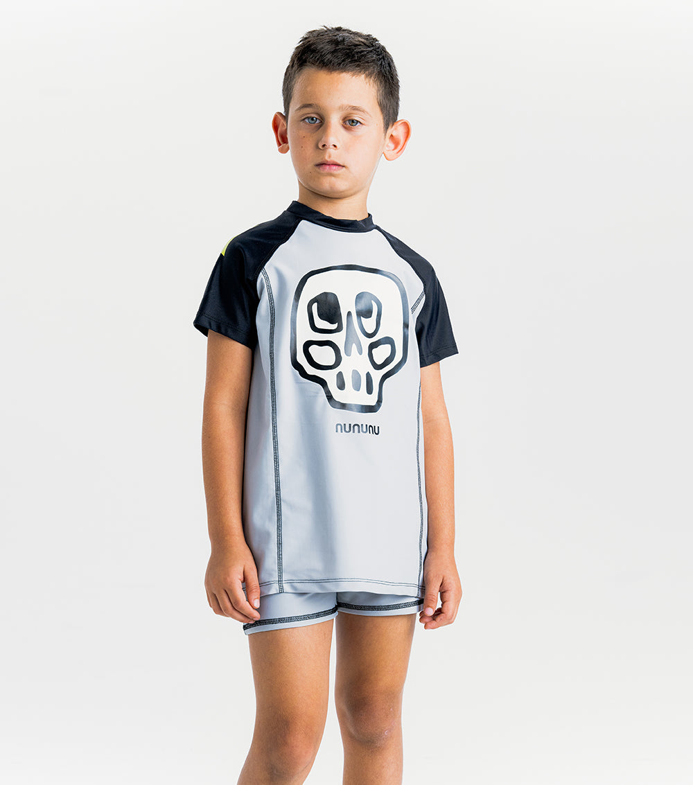 need a swim shirt that gives off a little bit of badass energy? we got you. your kid will be the boldest on the beach in this unisex short sleeve rashguard. it’s a lunar grey color outlined in black for added interest & contrast. that’s why we’ve got an obvious black stitching detail too. to crank up the awesome even more, it’s got a hot lime lightning bolt on each sleeve giving that pop of color & brilliance that your kid totally deserves. but the star of the show is the black & white skull silhouette created in collab with international artist shai id alony. right underneath, it says nununu, because this fit was too rad not to sign.
