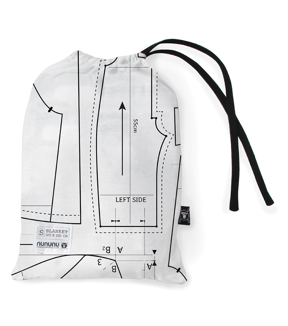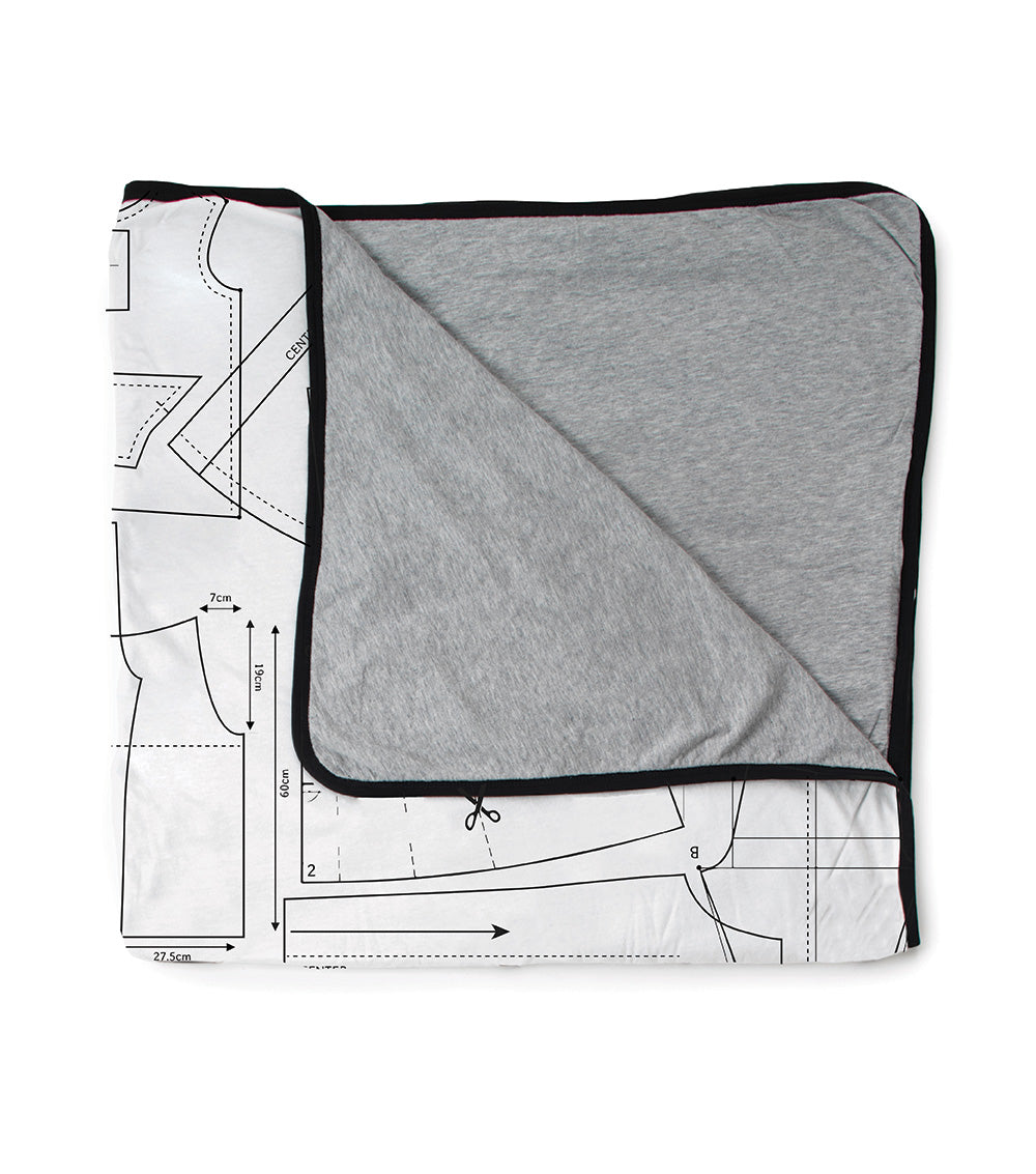 this super soft white blanket features our sewing pattern print, a manifestation of our current obsession with getting back to the basics of fashion. one side is printed, and the other stays solid grey for a minimalist moment. the whole thing folds up into a drawstring sack for travel & easy storage.