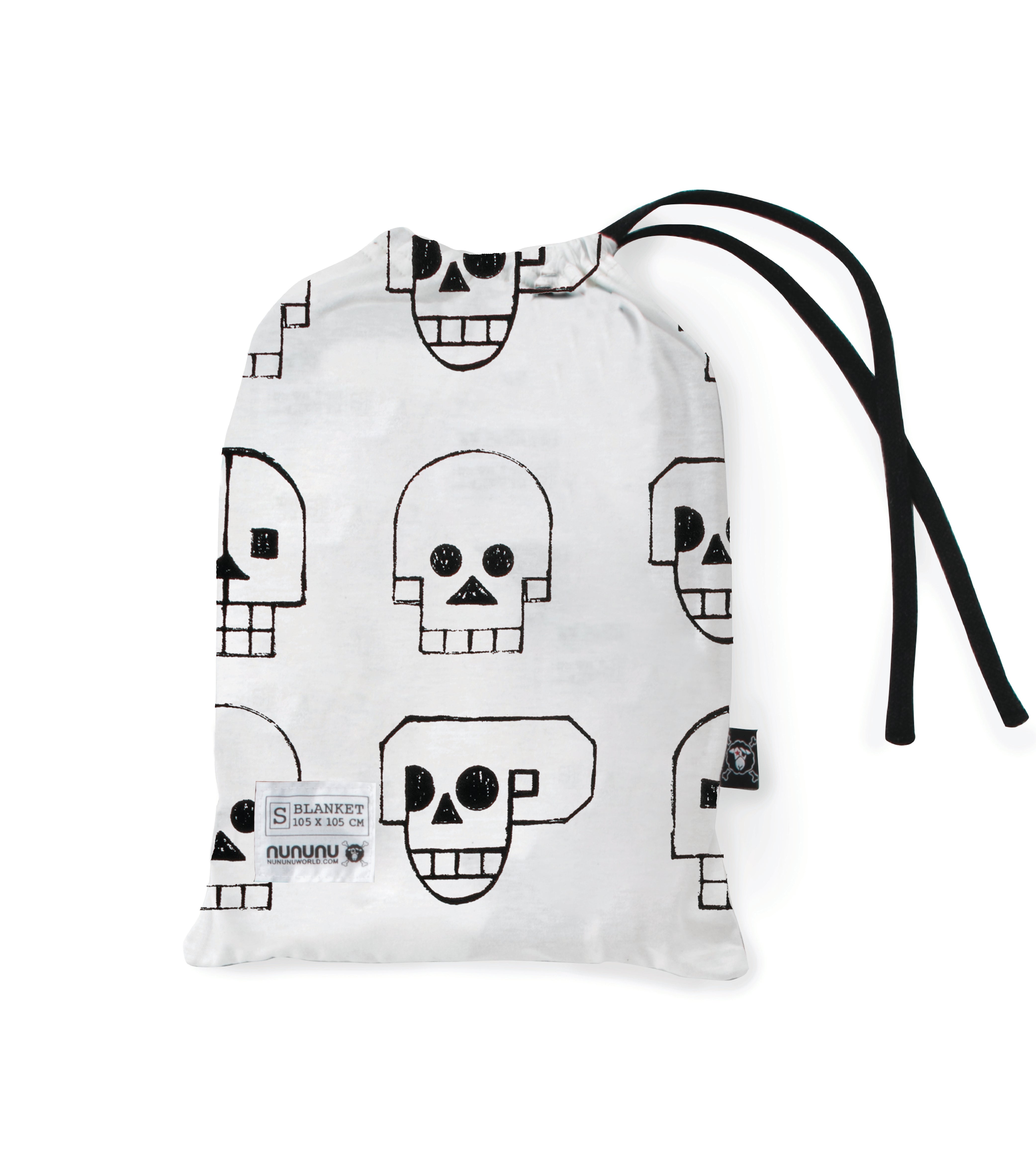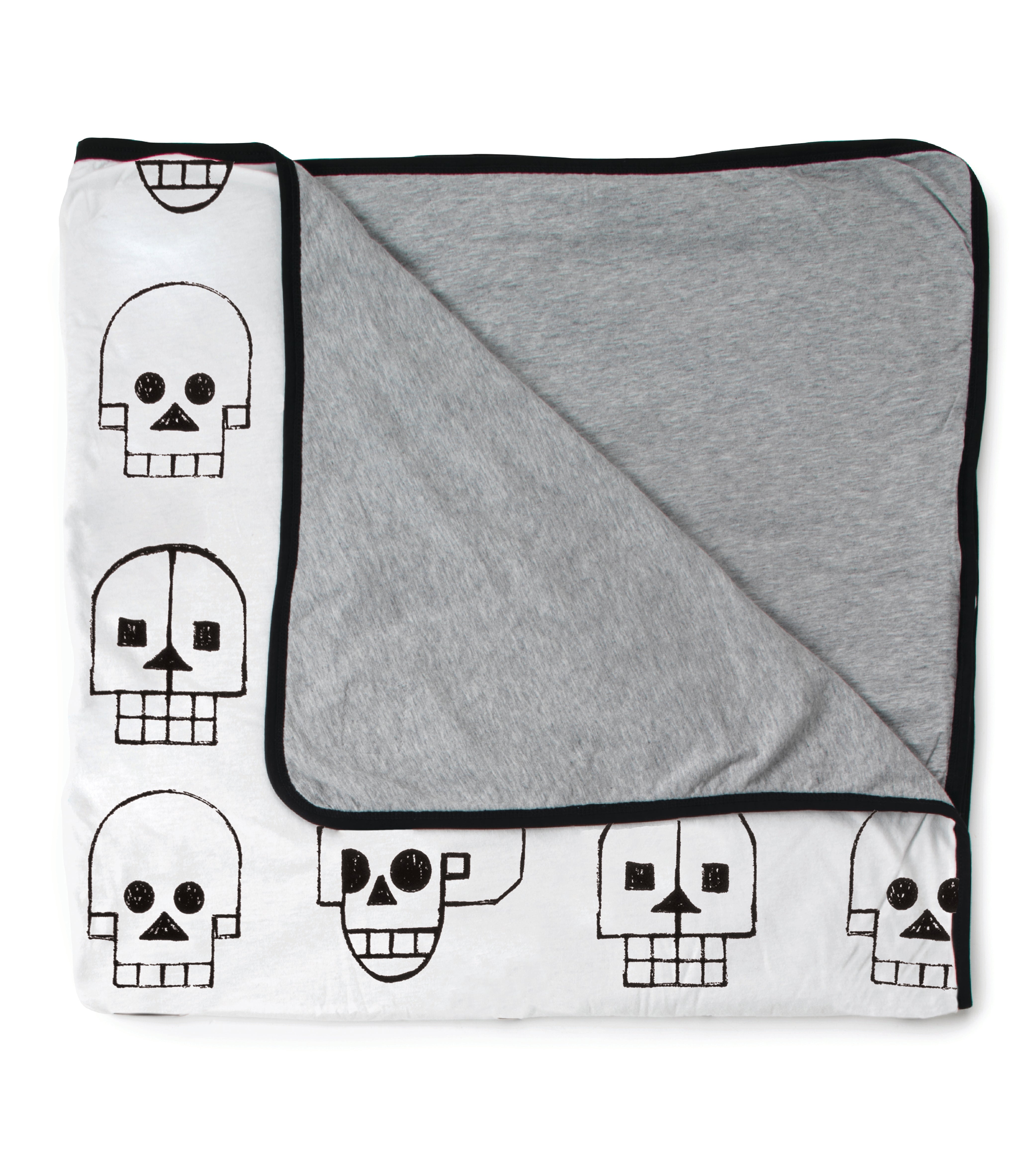 this super soft white blanket comes spangled in our skull robot print, a collaboration with shay id alony. the opposite side is like a cozy grey t-shirt. the whole thing folds up into a drawstring sack for travel & easy storage