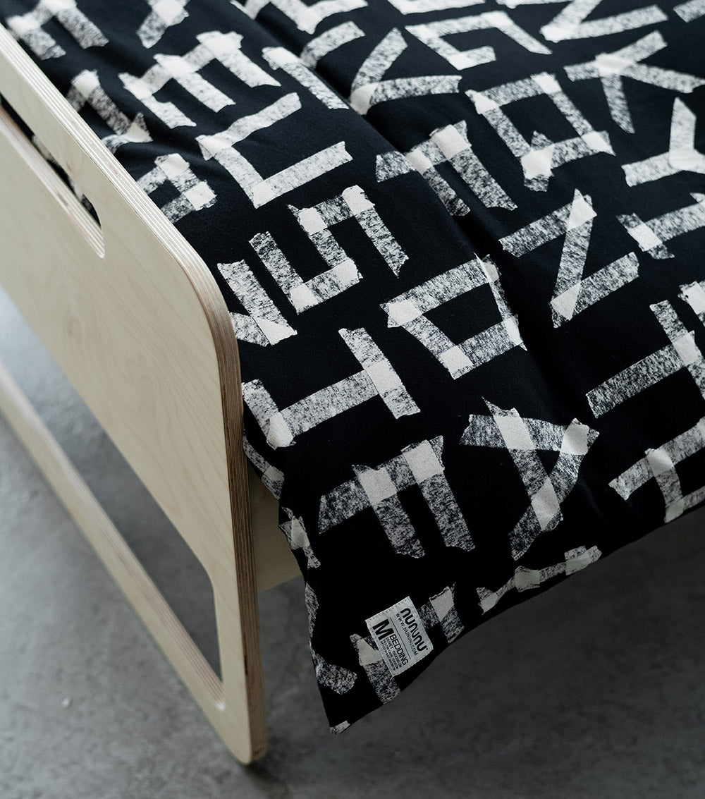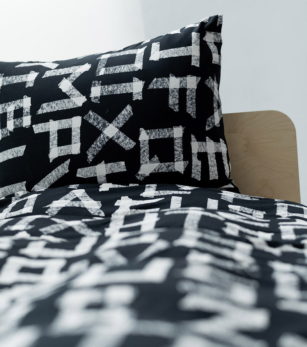 this black bedding set features a bunch of random letters in our masking-tape effect, which is our way of saying it’s cool to have fun & express yourself with whatever is lying around the house. the print is all over the duvet cover & pillowcase, while a solid fitted sheet gives the whole set a finished look. needless to say, all our bedding sets are made from our signature super soft cottons turning bedtime into a real cloud like event!