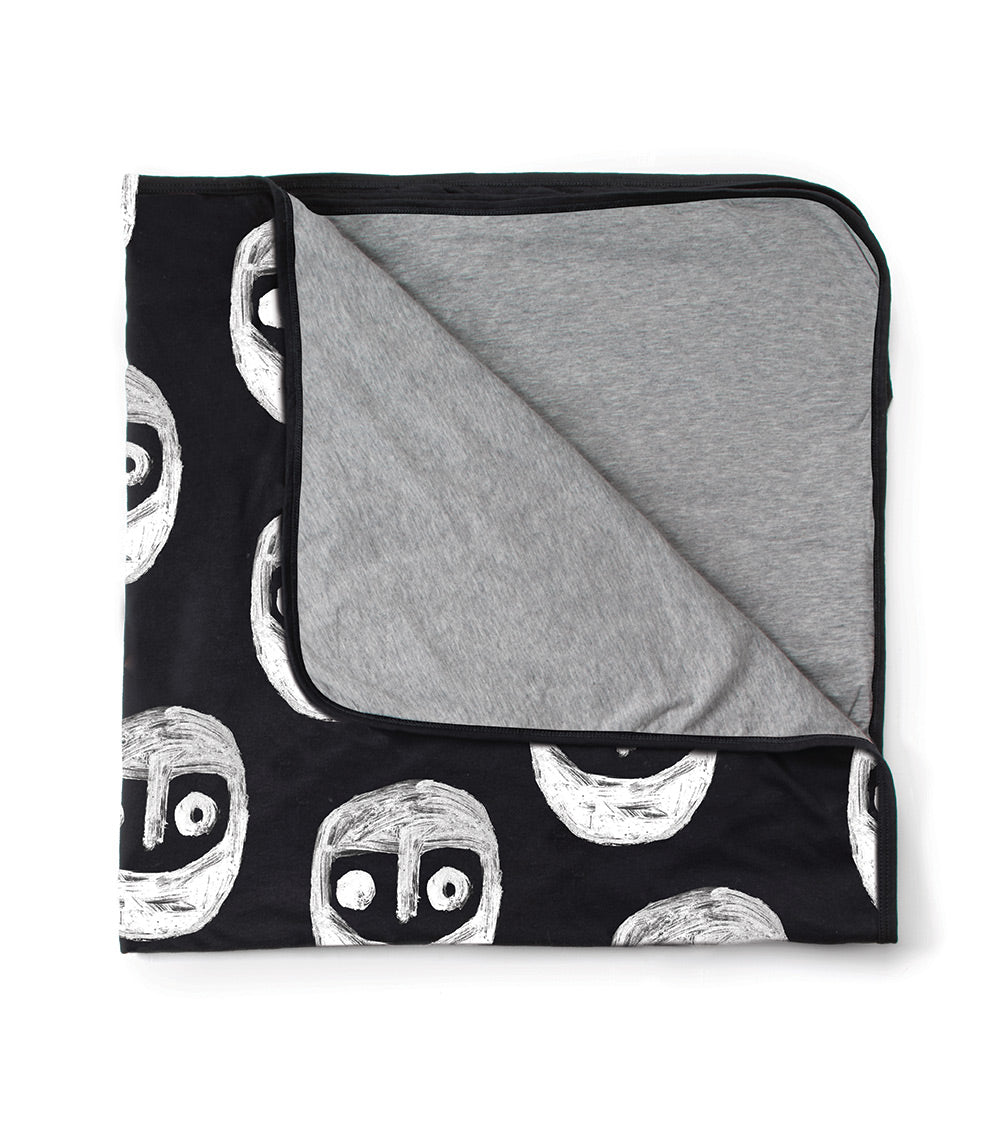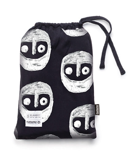 enter: the warrior. this very nununu design —a collaboration with artist shay id alony— is a fun take on the global culture of face-covering that defines our times. we’ve always been fans of the eyes-only look anyway and this scribbly guy lets the boys & girls lean into it while enjoying a strange sense of human unity. this super soft black blanket has the warrior all over one side, and the other side is solid grey for a minimalist moment. the whole thing folds up into a drawstring sack for travel & easy storage.