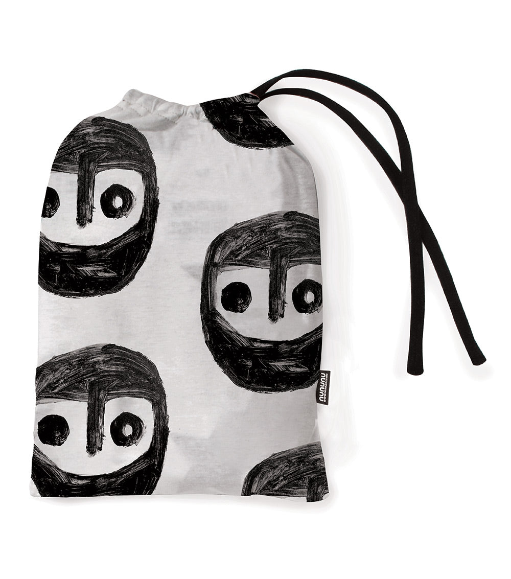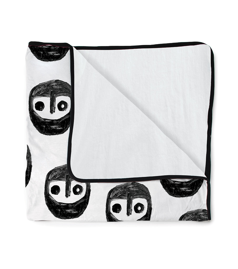 enter: the warrior. this very nununu design —a collaboration with artist shay id alony— is a fun take on the global culture of face-covering that defines our times. we’ve always been fans of the eyes-only look anyway and this scribbly guy lets the boys & girls lean into it while enjoying a strange sense of human unity. this super soft white blanket has the warrior all over one side, and the other side is solid grey for a minimalist moment. the whole thing folds up into a drawstring sack for travel & easy storage.