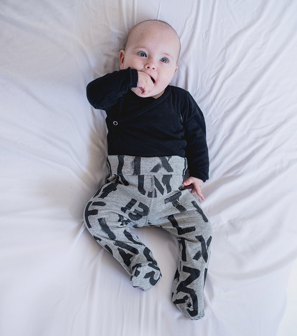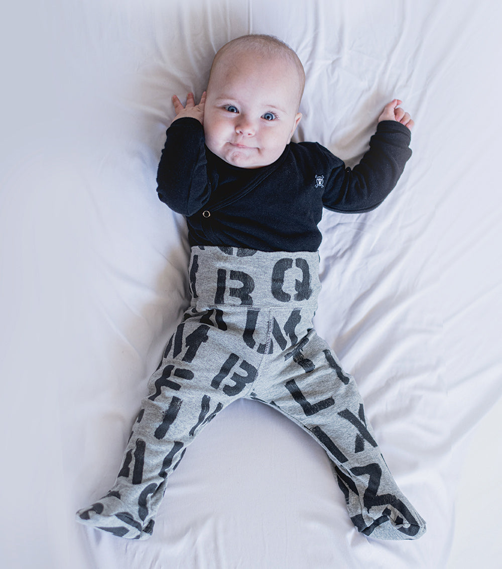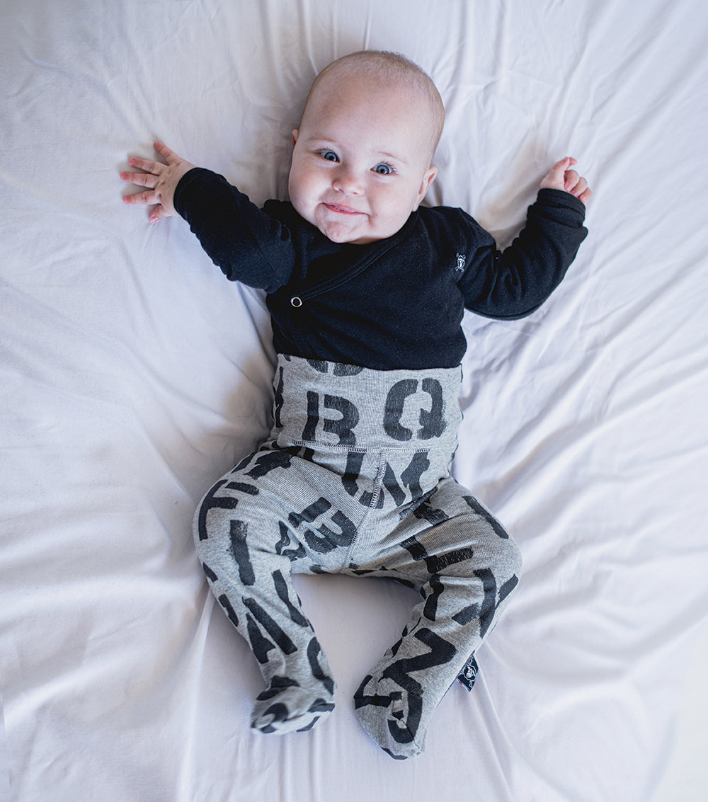since we think nerd is the new cool, we put drippy, stenciled letters all over these heather grey dope footed legging, why wait eh? they’re super comfy & high waisted, so you can fold down the top or keep it up for more snugness. style ‘em with a onesie or nununu sweatshirt for extra swag. they don’t require shoes, so that’s one less thing.