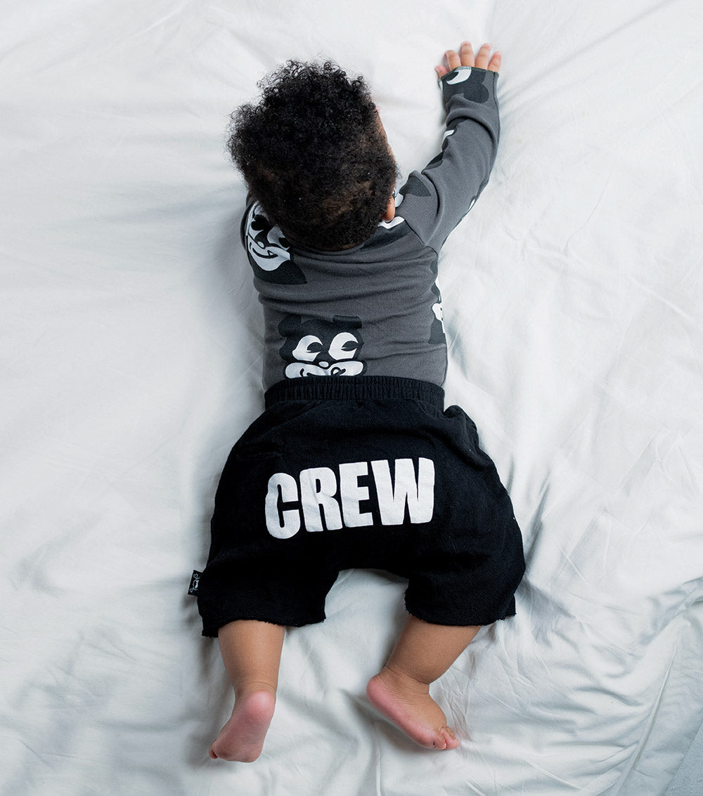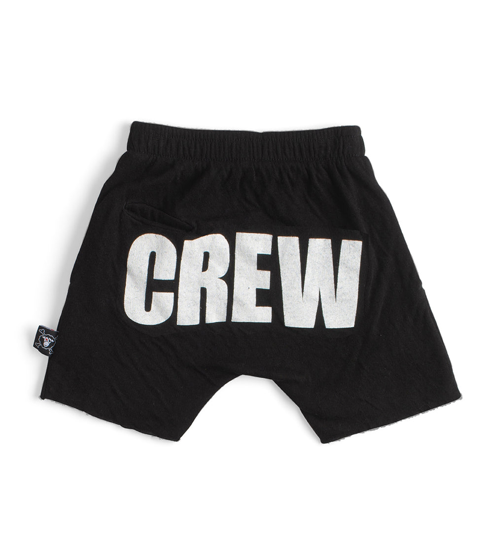a good pair of swaggy, drop-crotch shorts is a style necessity, even for a baby. these black super-soft, double-single cotton shorts are a long & roomy, with raw cutoff edges & an elastic drawstring waistband so the kid can squirm & explore freely without losing their pants. on the butt, the word “crew” is in big block letters, so everyone knows they’re a part of the team. the tag rides on the outside, because we don’t do things like everyone else.