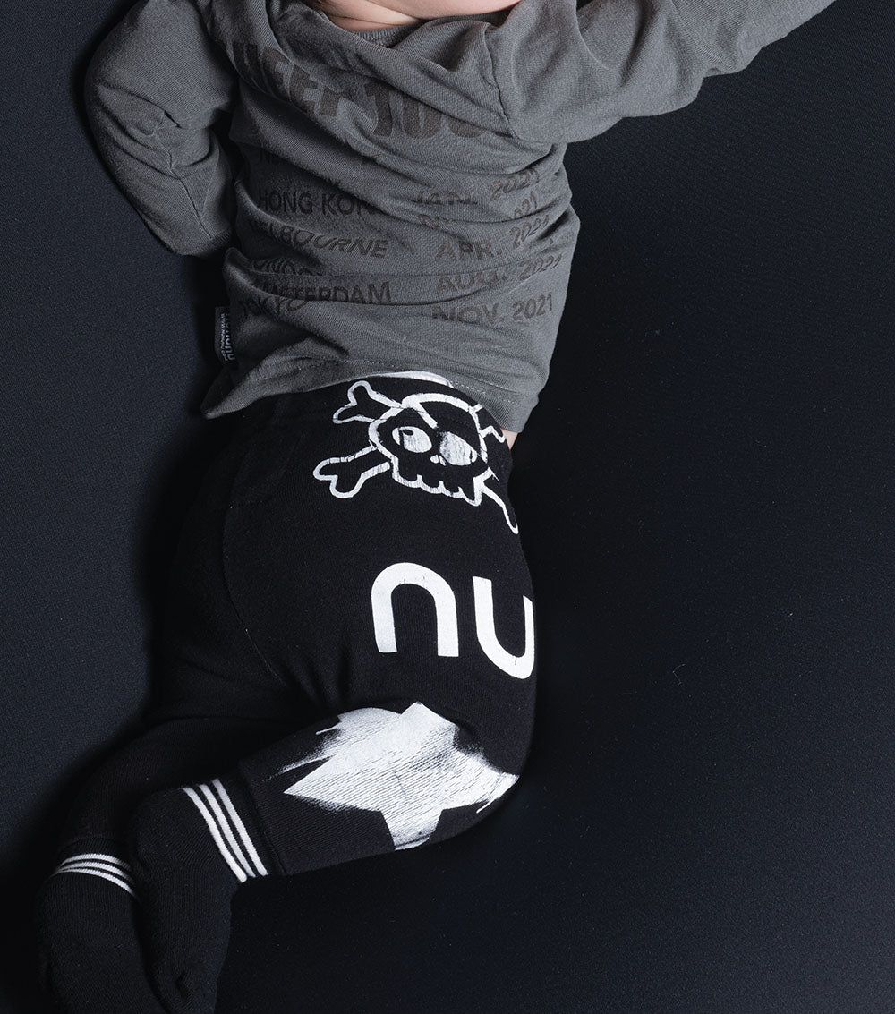socks get lost. all the time. so we thought we’d attach them to these awesome black baby pants and add sport stripes—they’ll never know! down one side, we have an array of nununu symbols: the falling star, the monogram & the skull logo. a tiny black sheep patch lives at the opposite hip. style ‘em with a onesie or matching nununu sweatshirt. luxurious, super soft cotton keeps the kid nice & cozy, like a constant hug, as they take in their strange new surroundings, blissfully unaware.