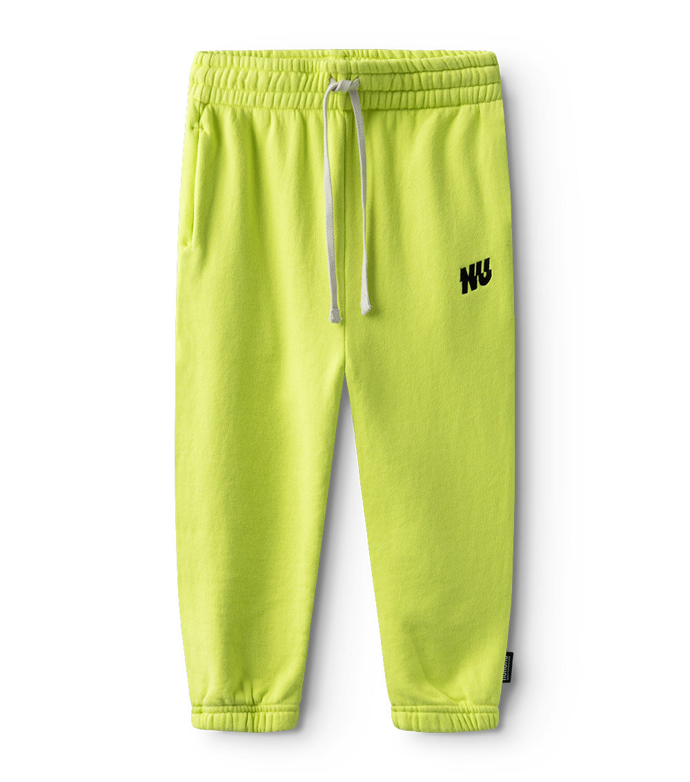 simple, chic, & comfy as ever, this classic gender-neutral sweat pant made of super soft hot lime french terry. the letters NU are running off them in a print that looks like the kid is too fast for it to keep up and cinched elastic cuffs & a drawstring waistband are comfy enough for setting their new personal best. because speed is key for acting like a rebel without getting caught.
