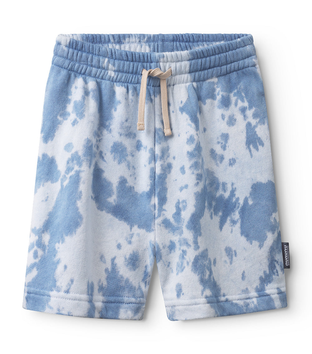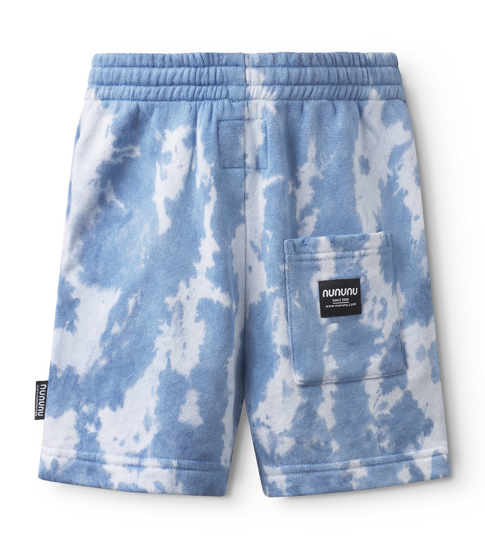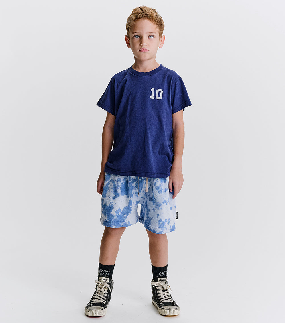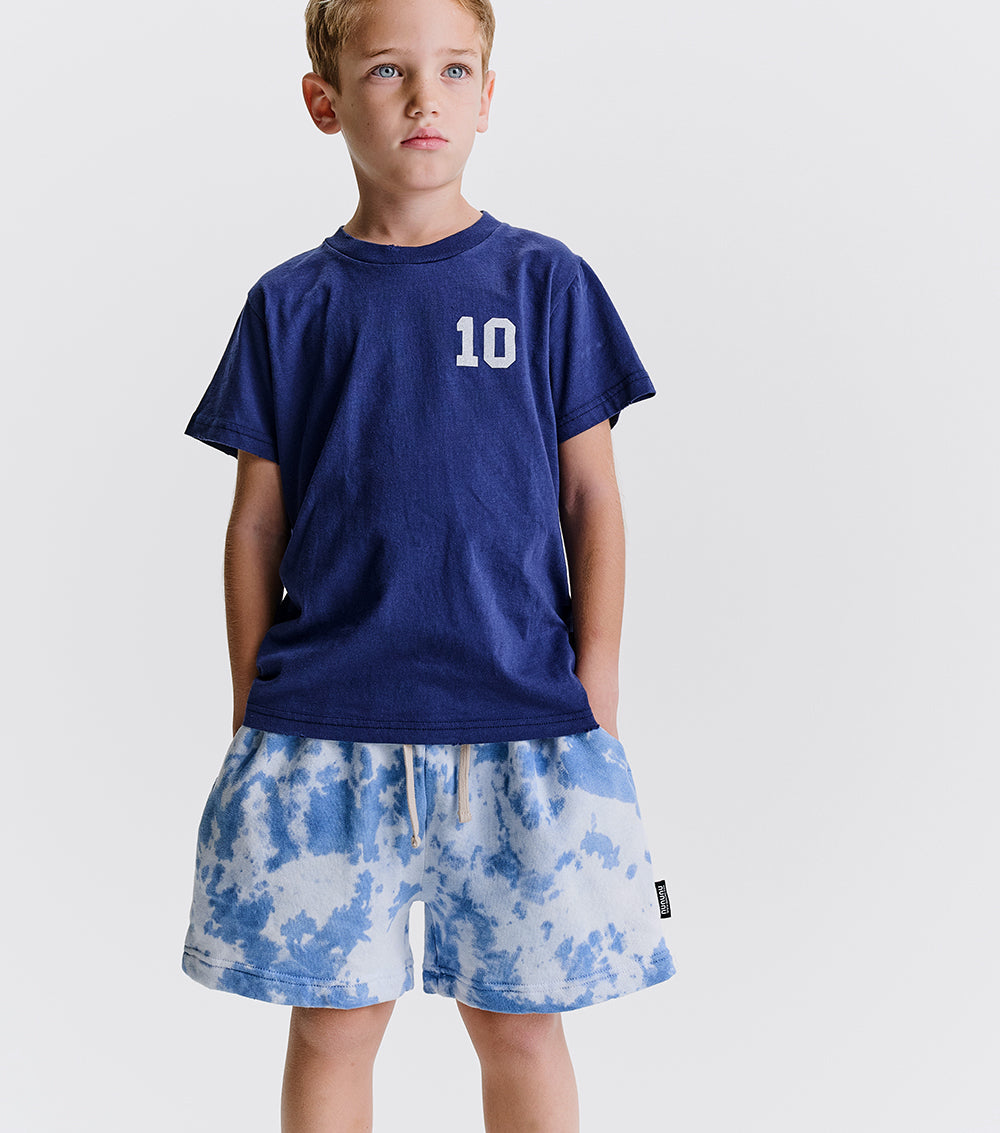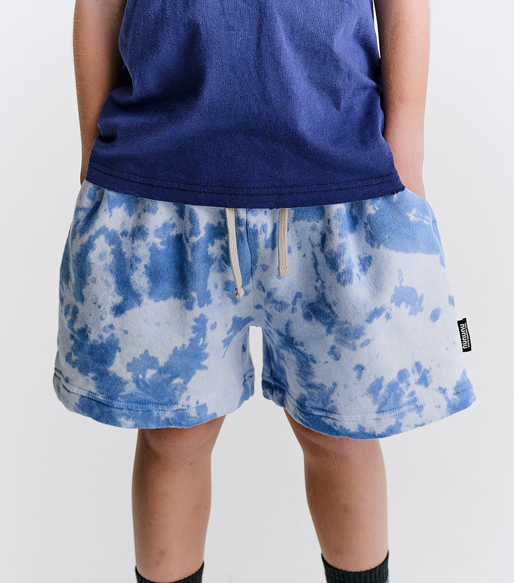 picture this. the train for funkytown is leaving and your kid is ready to board. of course, they'd be wearing these groovy shorts. they’re a gender neutral cut made of psychedelically soft indigo french terry with a mega cool tie die pattern. they’ve got roomy pockets on the sides & a compact pocket on the back for carrying goodies carefree. the stretchy waistband keeps them up without stress and the custom deconstruction shows off how often they’ll want to wear them. so, basically constantly.