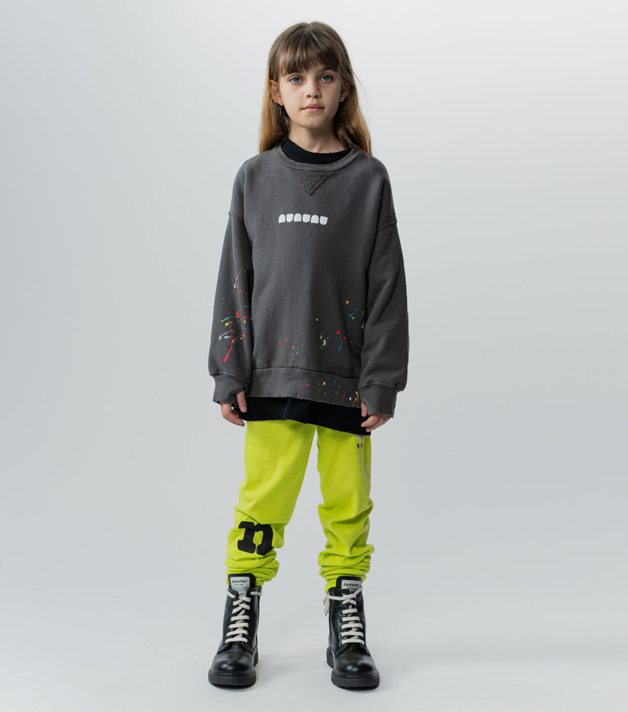 get ready to go bananas for a pair of leggings that were made to play. they’re crafted from hot lime fine rib with a big n for nununu printed in a classic typewriter font and NU01 to remind you who’s number one. plus the funny monkey print was designed in collab with artist shay id alony. an elastic waistband & comfy ankle cuffs keep them up so this kid can keep playing hard.