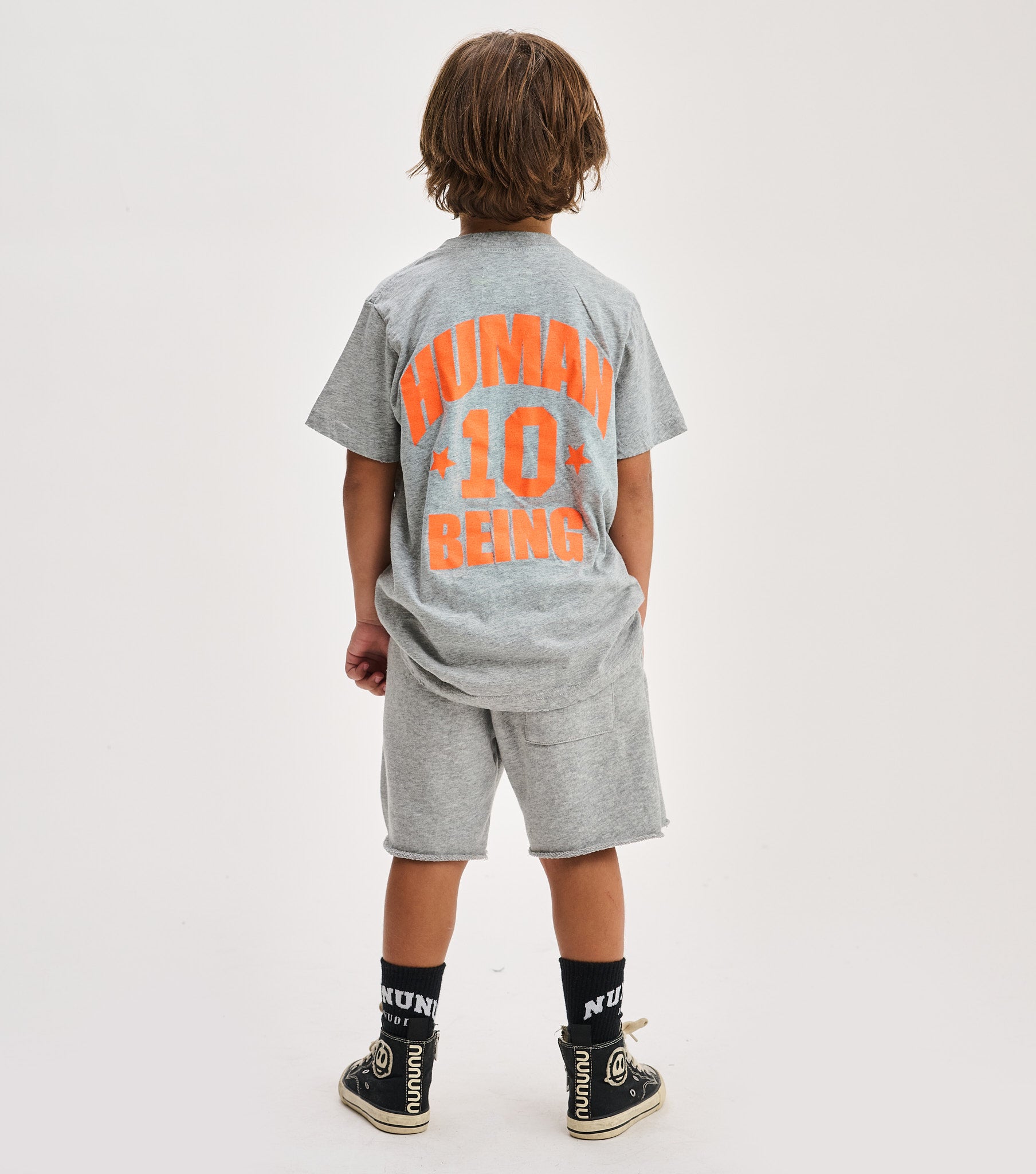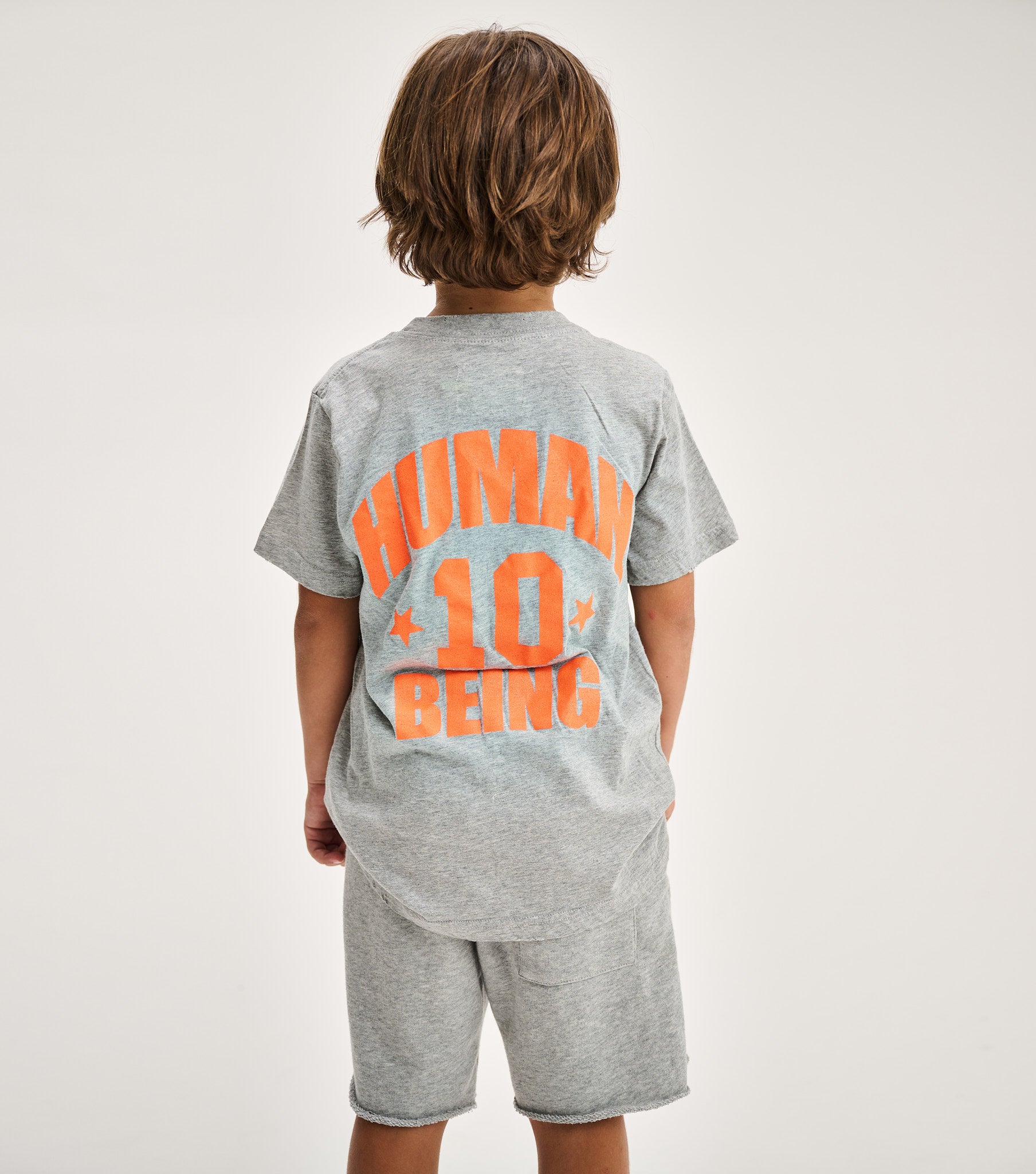 welcome to team nununu, your kid is number 10. that’s why we’ve got this rad number featured twice: small on the front & big on the back of this gender neutral tee in bold orange print that contrasts with the heather grey single cotton. of course, it also says human being on the back along with two little stars because that’s our mascot. and with a personality like your kid’s, being human is cooler than ever.