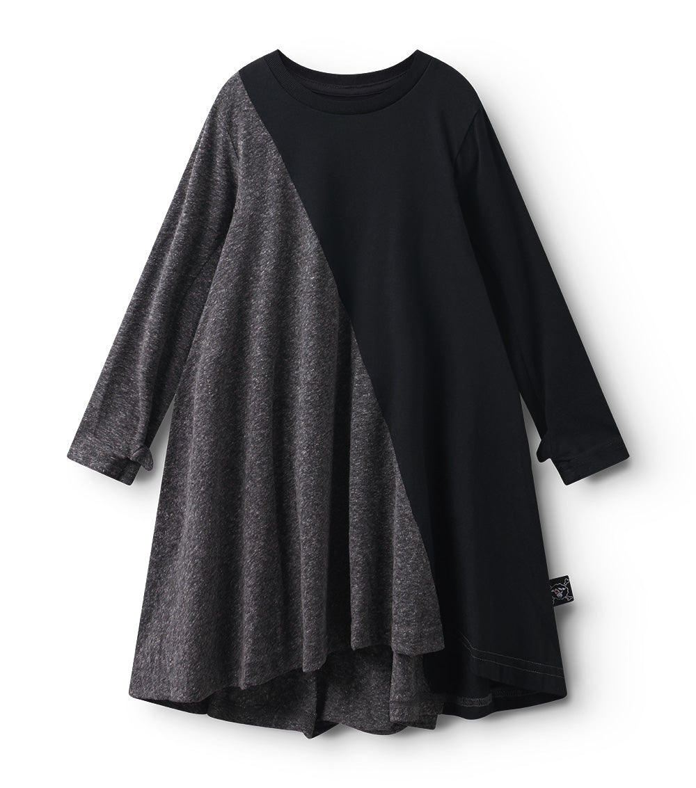 the classic nununu 360 dress is now updated with ½-&-½ black/charcoal color blocking that creates this cool visual effect when a girl twirls around, which is the whole point of this dress, basically. long & full but not bulky, the 360 is super comfy with thumb sleeves to keep her hands cozy while she deals with the dizzies.