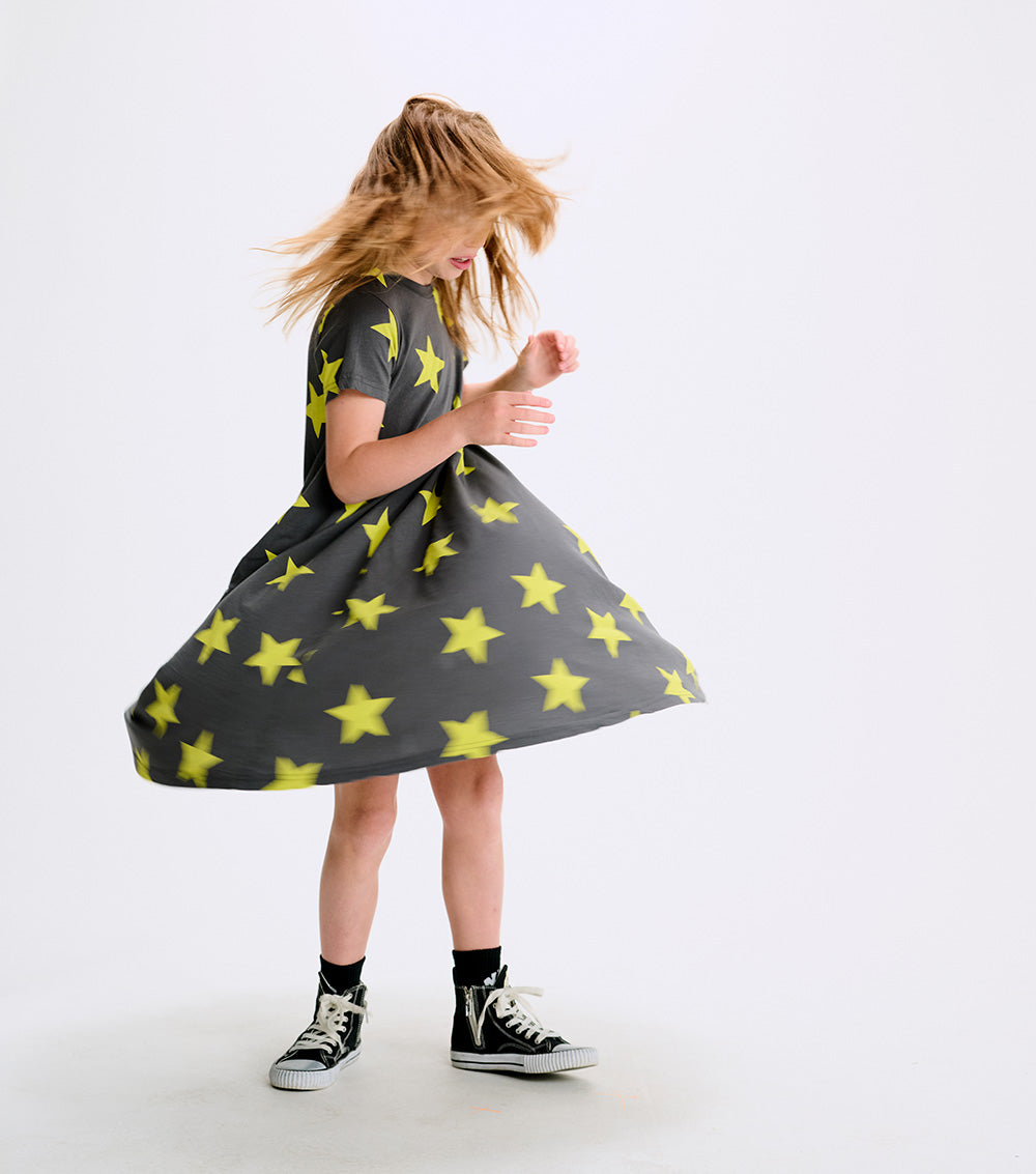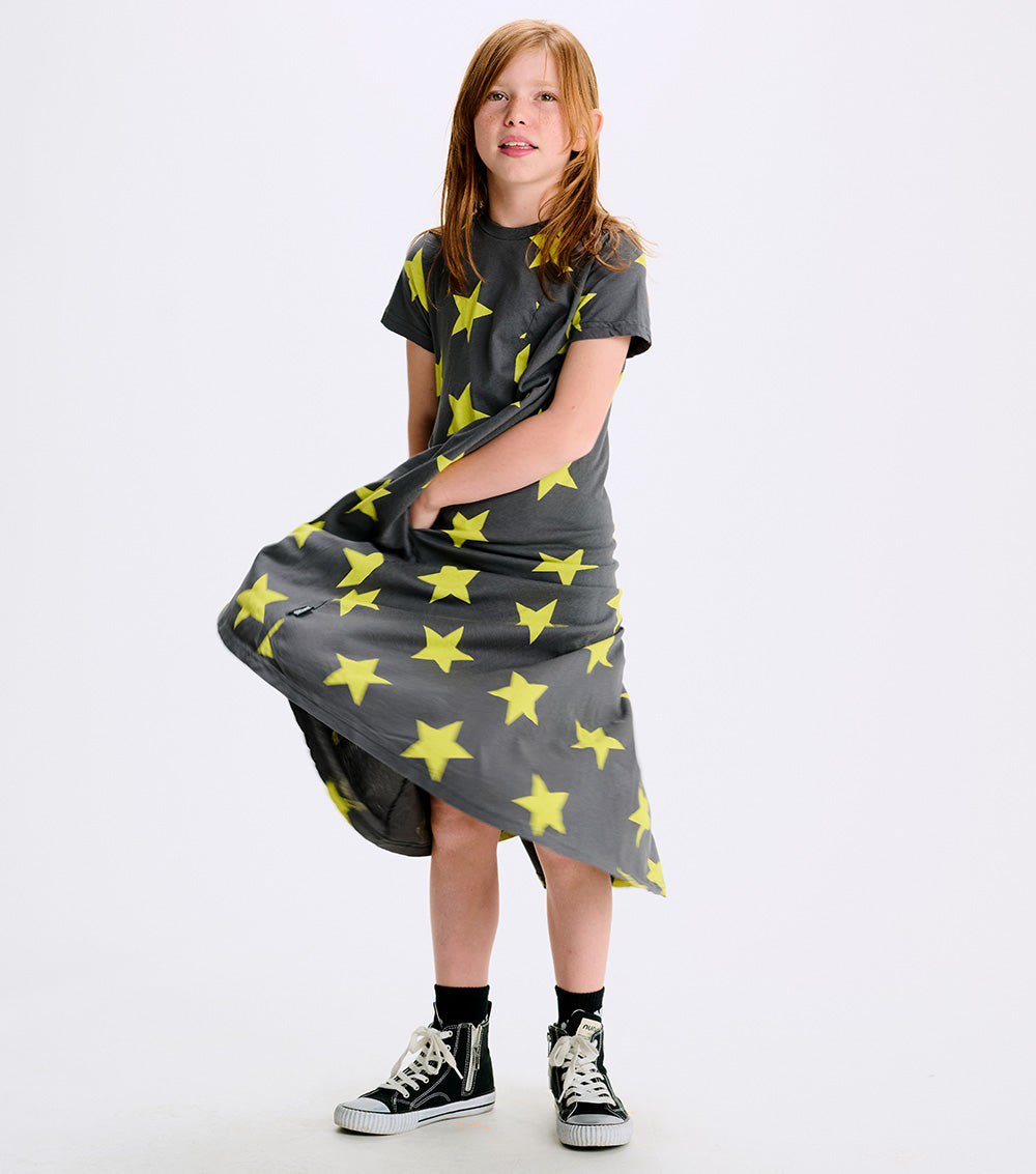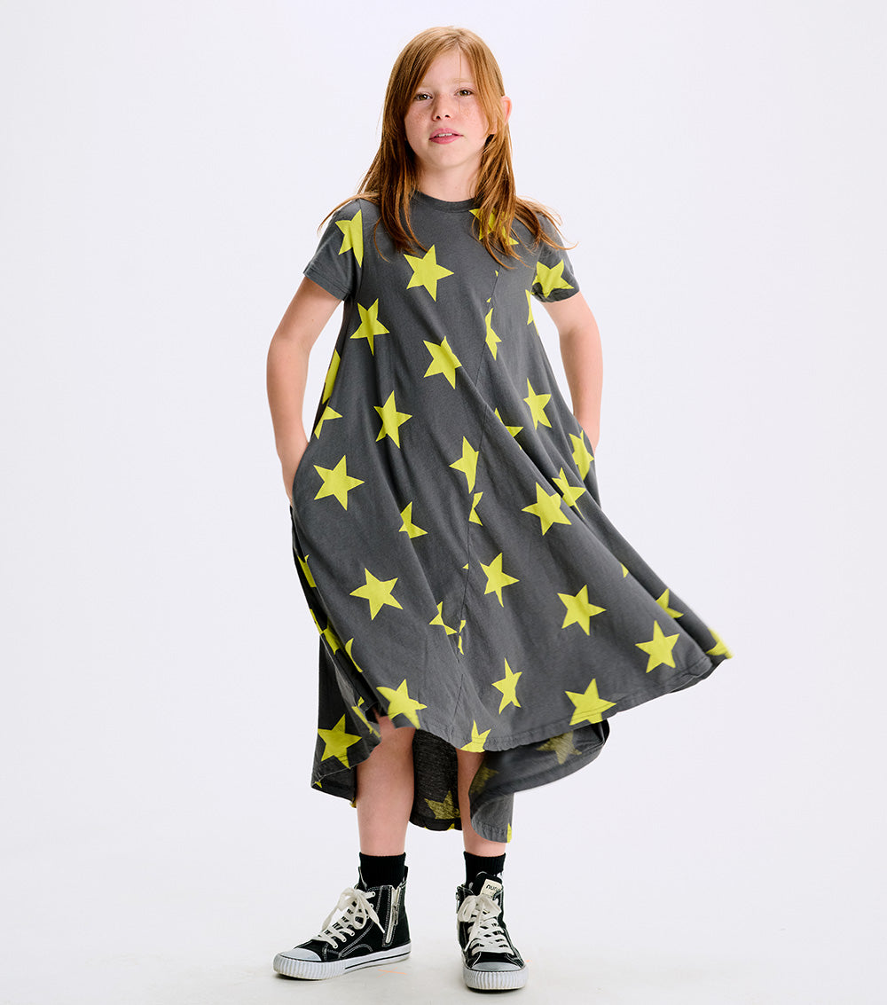 our signature star print is the perfect complement to this short-sleeve, drapey 360° dress in graphite. good for twirling around town, it’s longer in back for a hi-lo feel, but never bulky—super comfy for an all-day look. a beloved nununu classic.