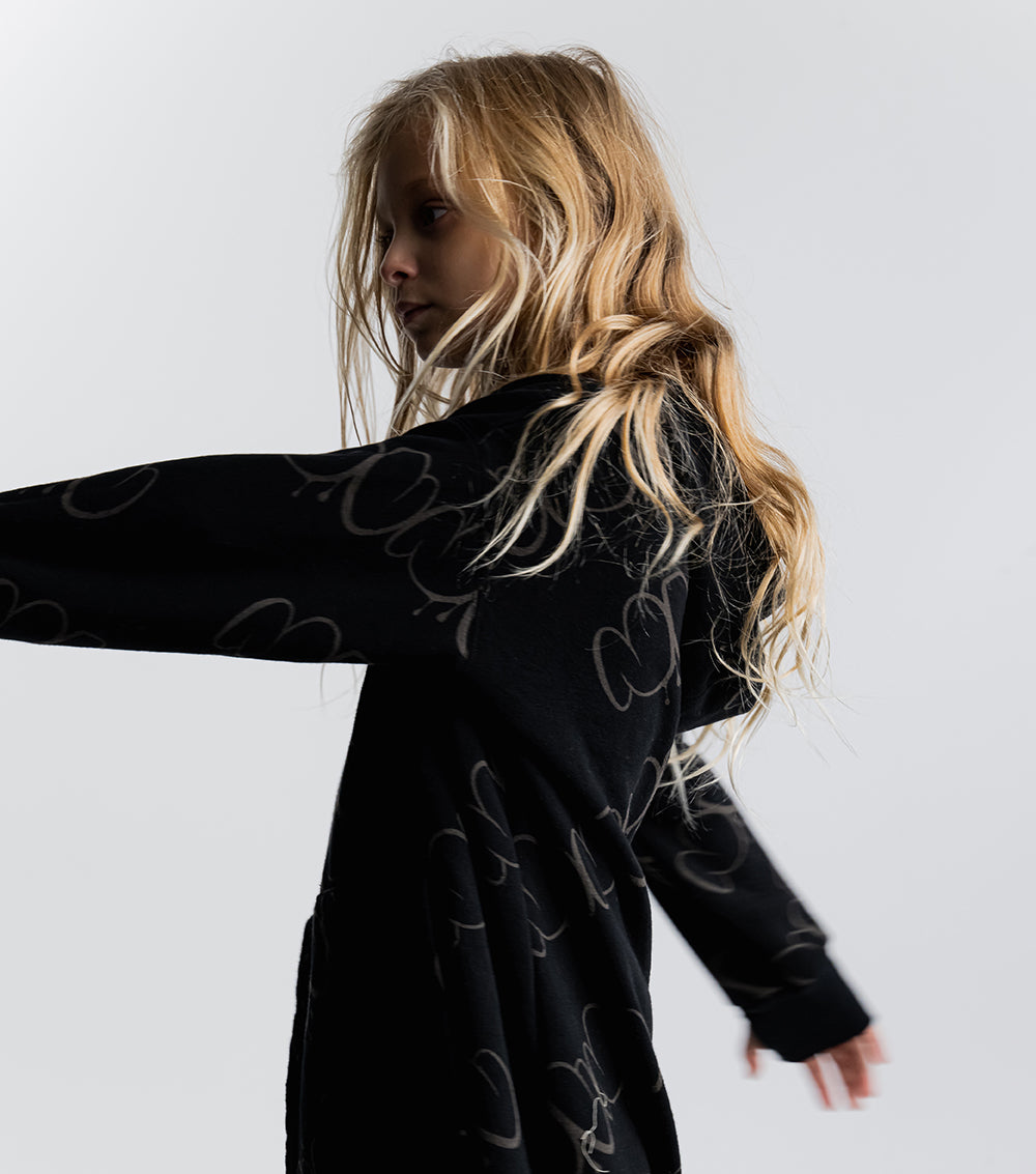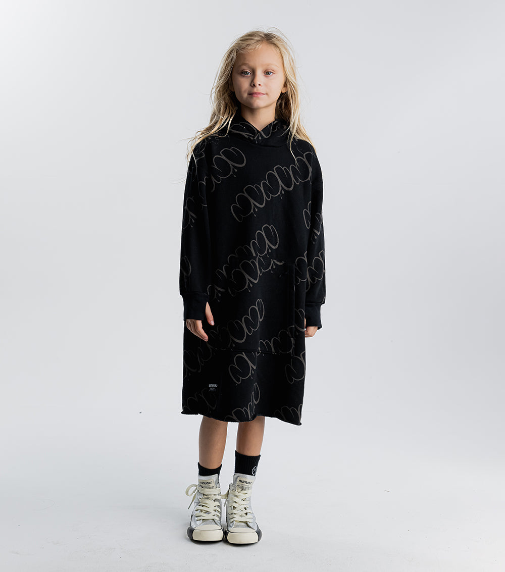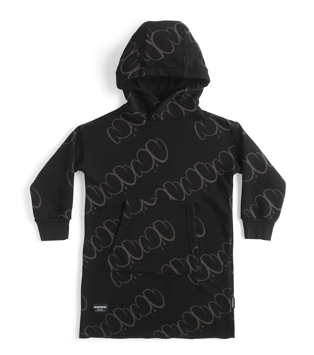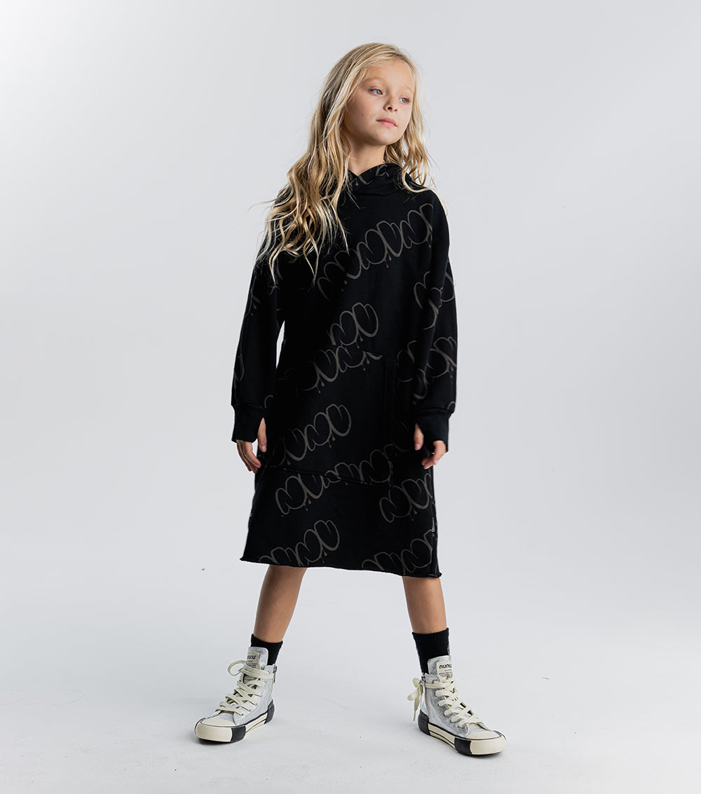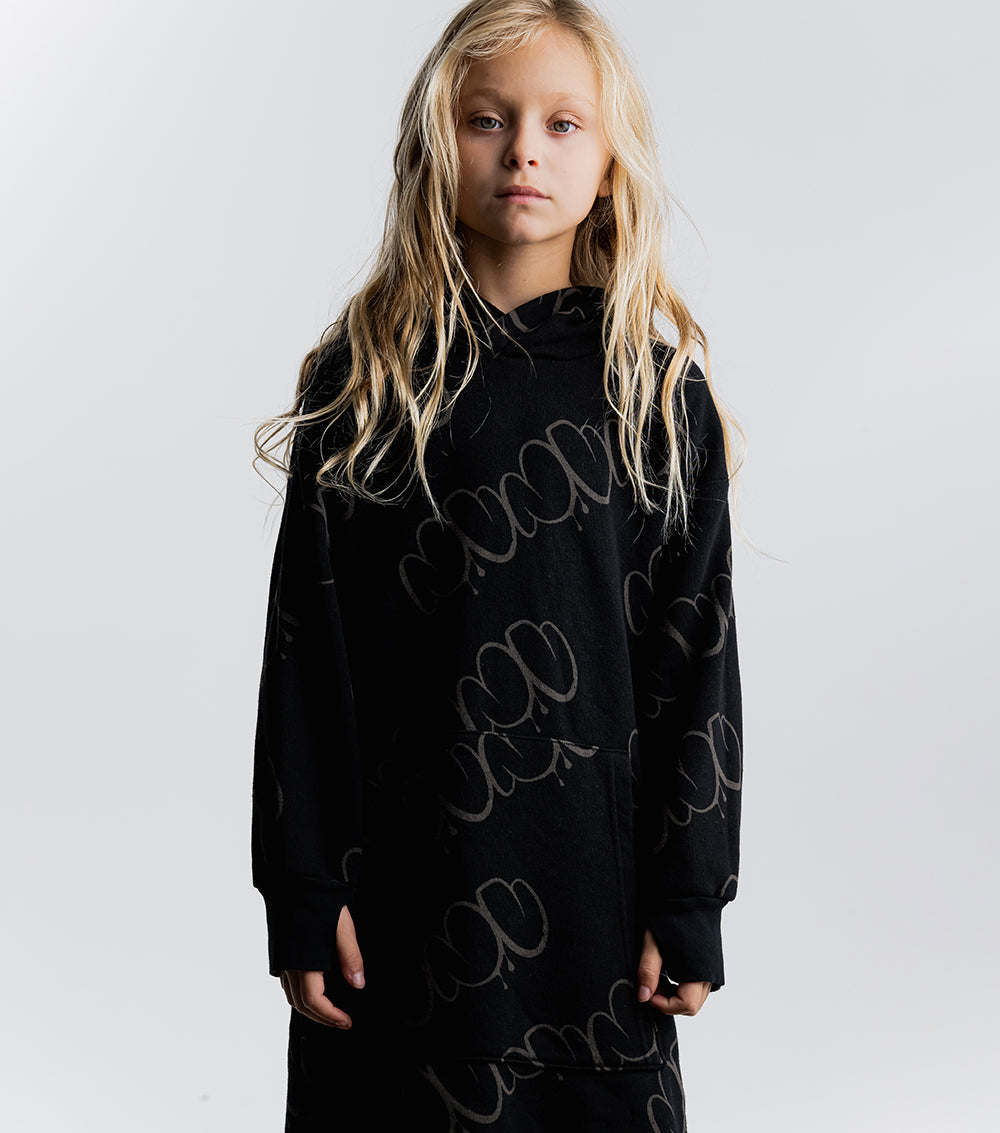 sometimes a kid can’t decide between that relaxed vibe or totally popping off. so why not have both? that effortlessly chic look is perfectly captured in this a cut hoodie-meets-dress combo. for the extra design twist it’s got a bubbly nununu print stripped diagonally across the chest, cool kid thumb holes, and a big old hood of course. perfect for dancing, singing, chilling or pouting — whatever mood your little rebel is in.