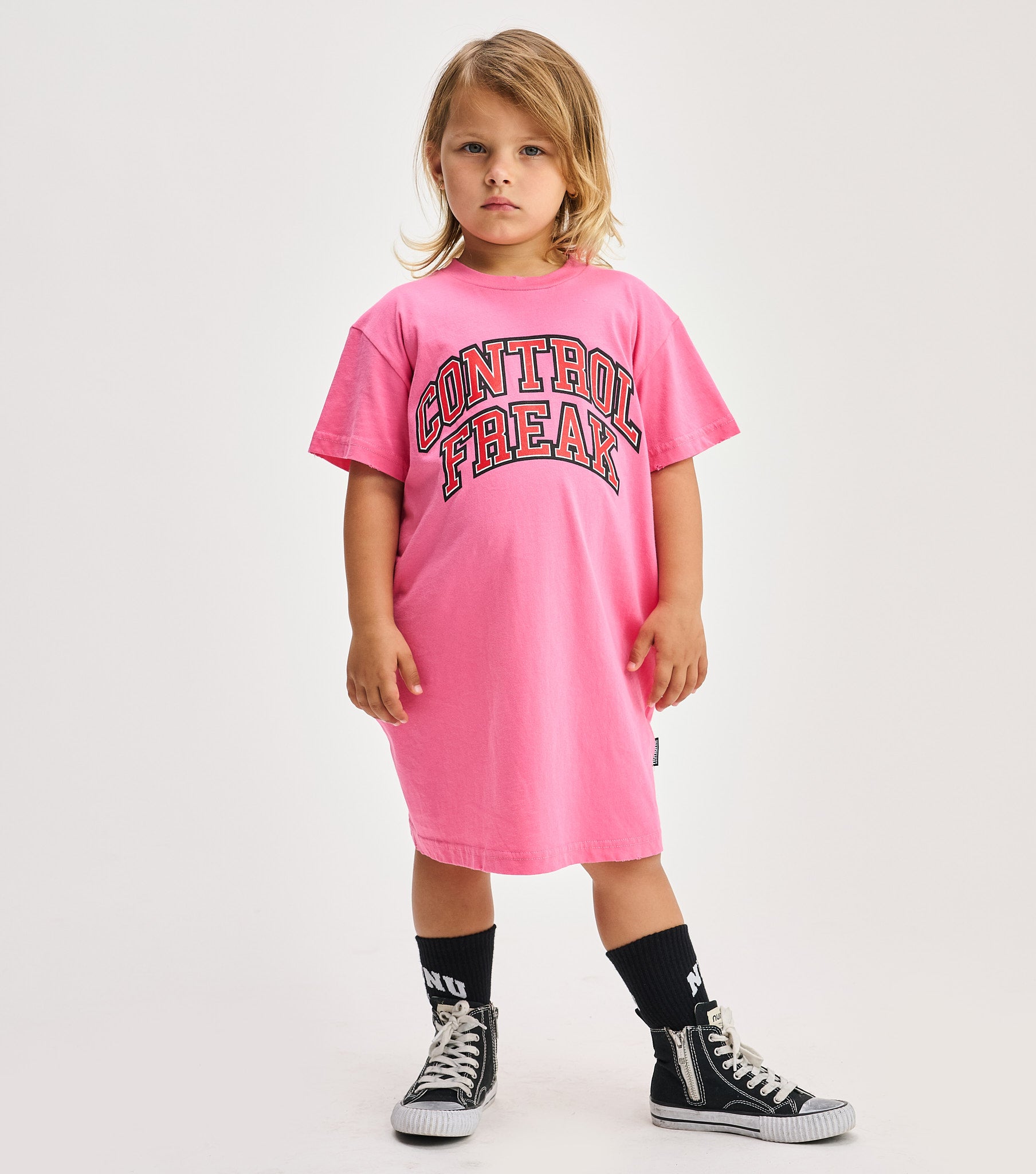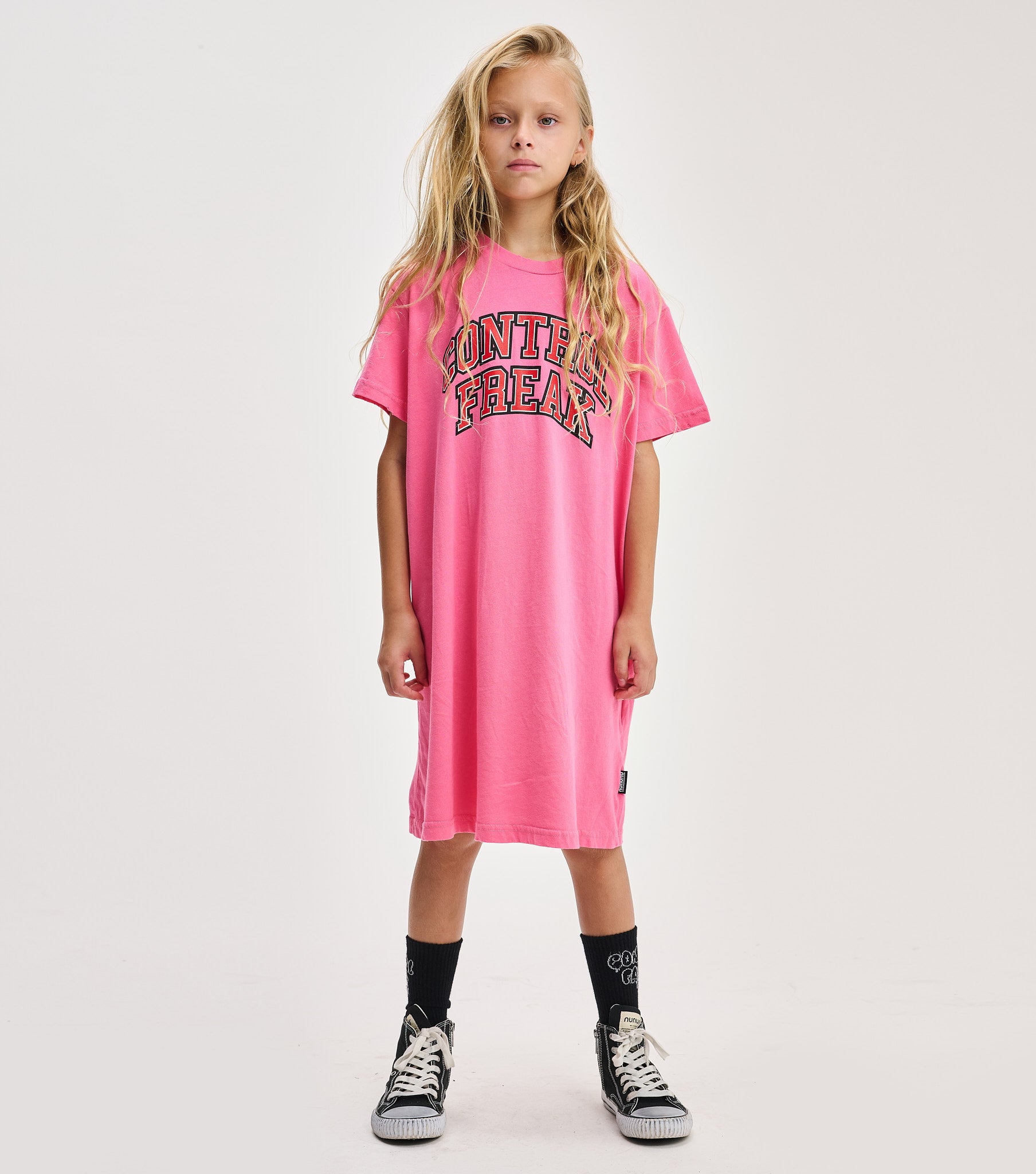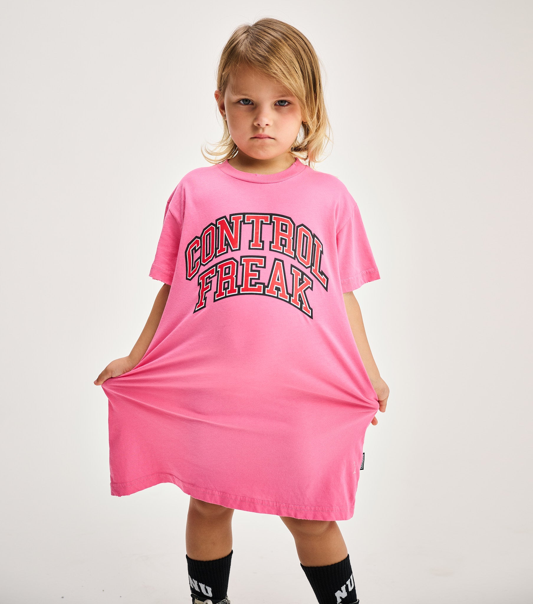 think you control the show? think again around the kid wearing this dress. it’s a hot pink single cotton fit with custom deconstruction and control freak written nice & big in red & black in our collegiate style font. it’s vibrant enough to fit your kid’s incredible personality & comfy enough for them to feel up for any adventure. plus, with a look this cool, they’re sure to get all the compliments.