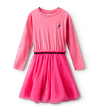 this dress is sure to strike up a conversation. it’s a super pink single cotton top & a flouncy skirt bound by a sequenced black waistband. of course, it’s got the perfect number of tulle layers for maximum twirl potential along with a single cotton layer underneath to keep it comfy.
