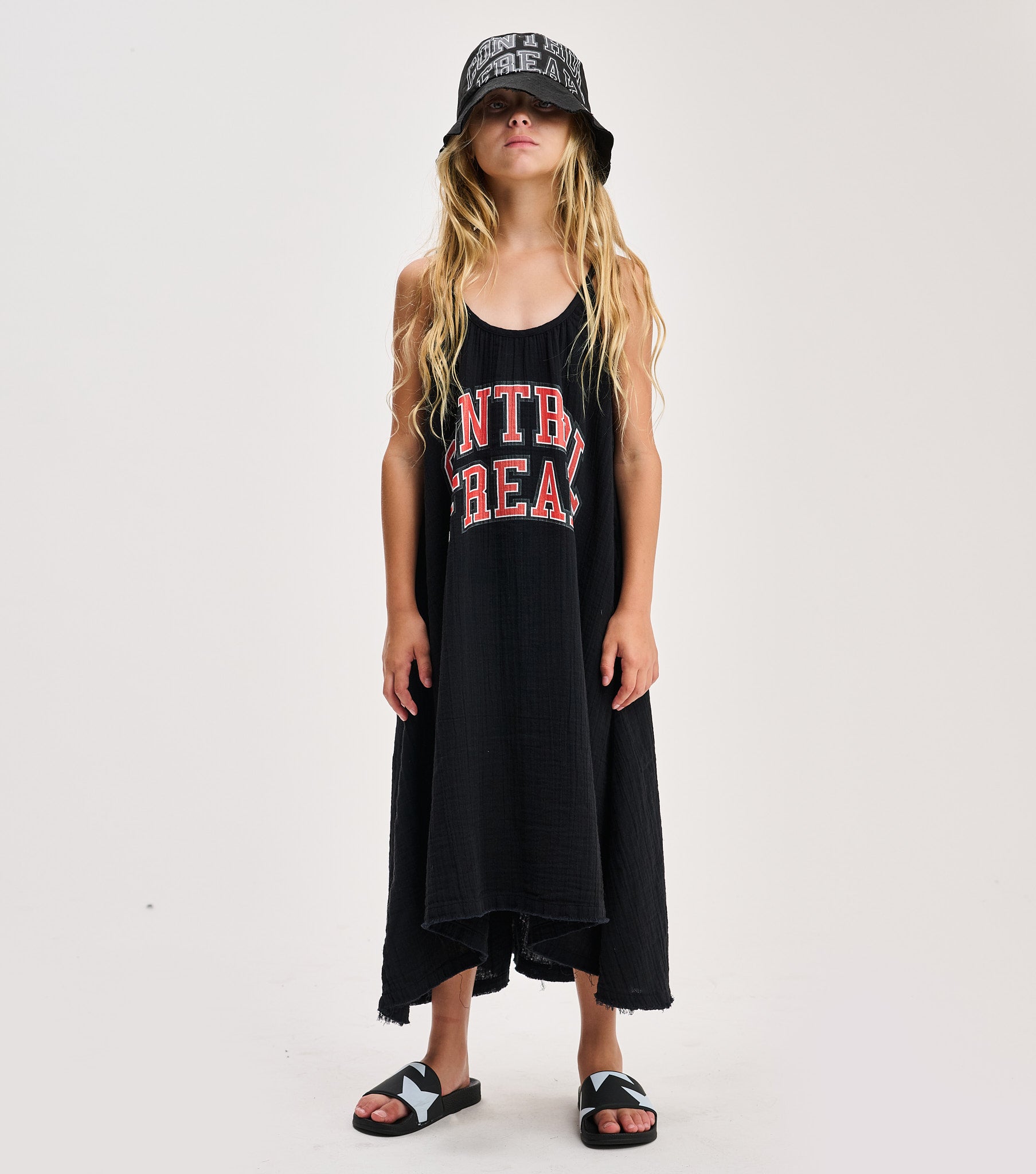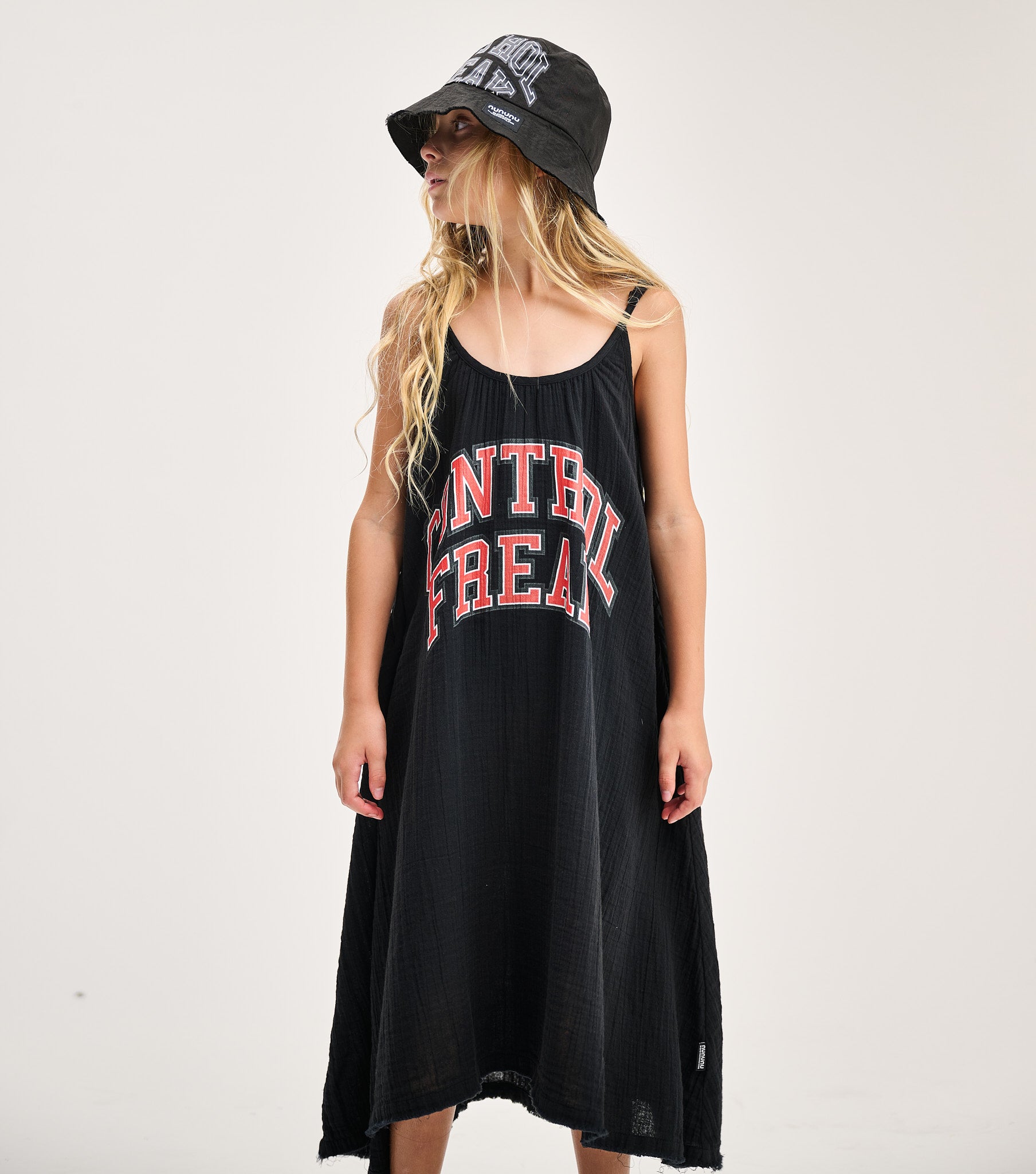 pov: it’s vacay time and you need to pack light. this dress is actually the only thing they’ll need & the only thing they’ll even want to wear. it’s breezy black muslin with a totally chill tie dye effect that’ll feel amazing even on hot summer days. it’s got a rounded neckline, adjustable spaghetti straps & a frayed bottom edge for that relaxed summer feeling. of course, control freak rages across the chest in red, white, & black letters that mean business. just like your kid when they’re planning their summer getaway.