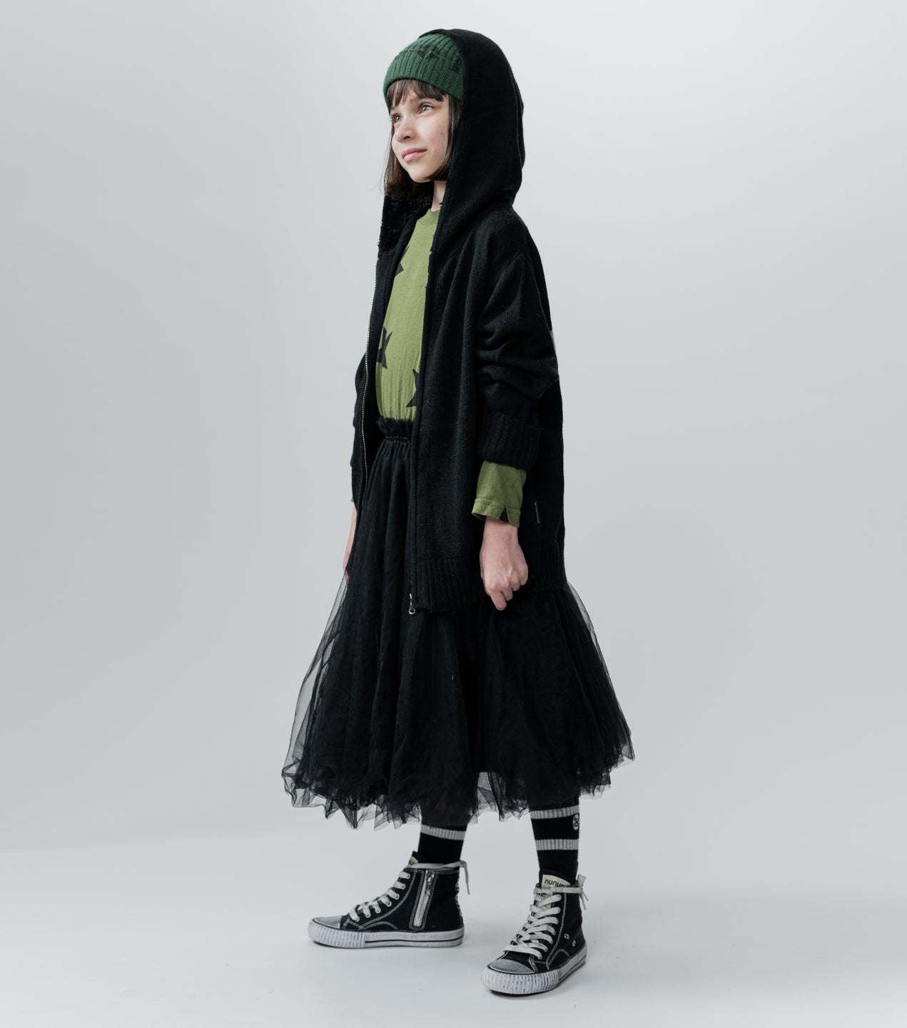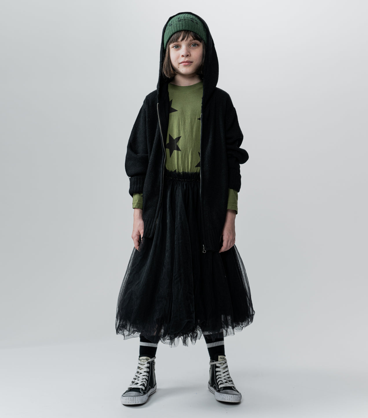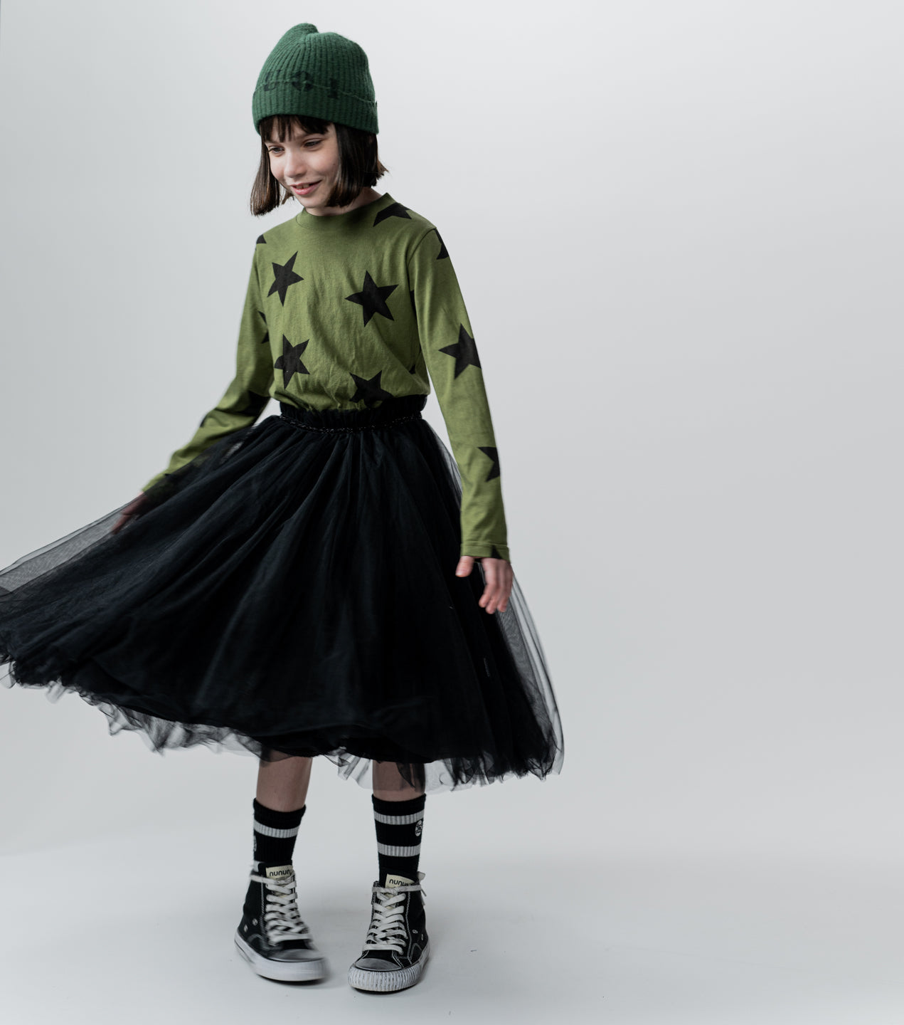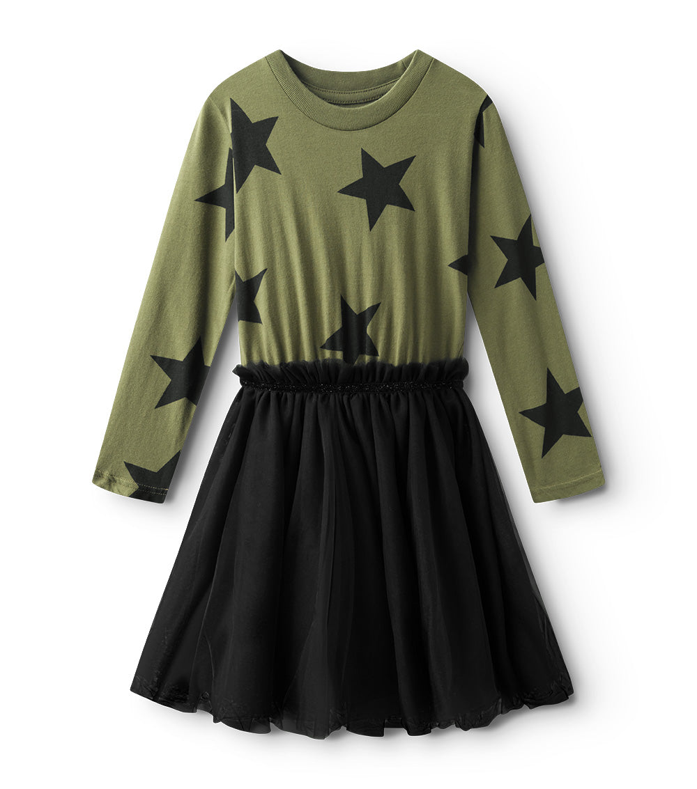 a dream in olive, this dress has real star power with an ethereal feel. our signature black star print spangles the long sleeve t-shirt top. on the bottom, a cotton liner pairs with a layered black tulle overlay that gives the whole thing a frothy feel. a band of black sparkly sequins adds a nice finish at the waist. comfy and dressy at the same time, it’s good for a special occasion or accompanying mom & dad to the supermarket when you’re feeling extra.