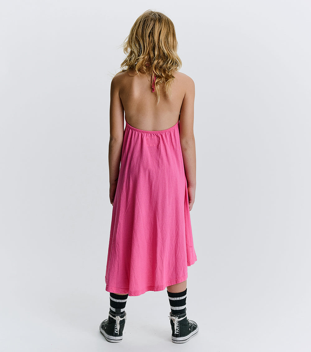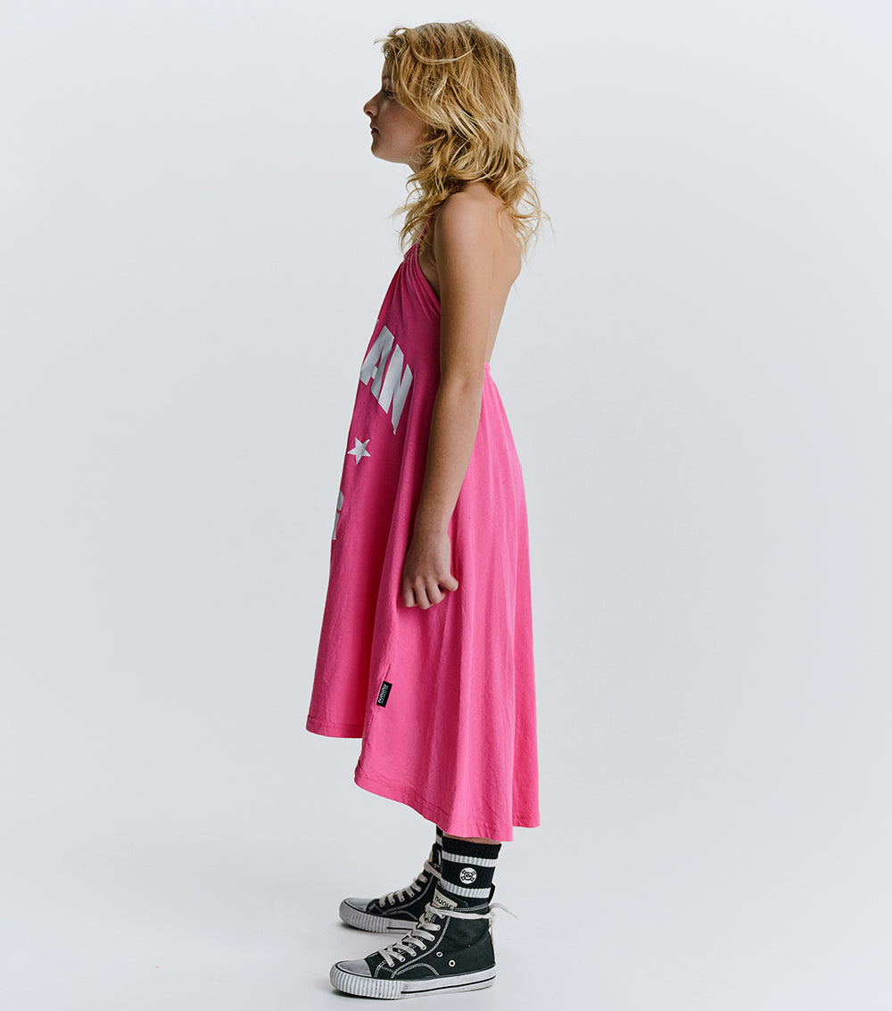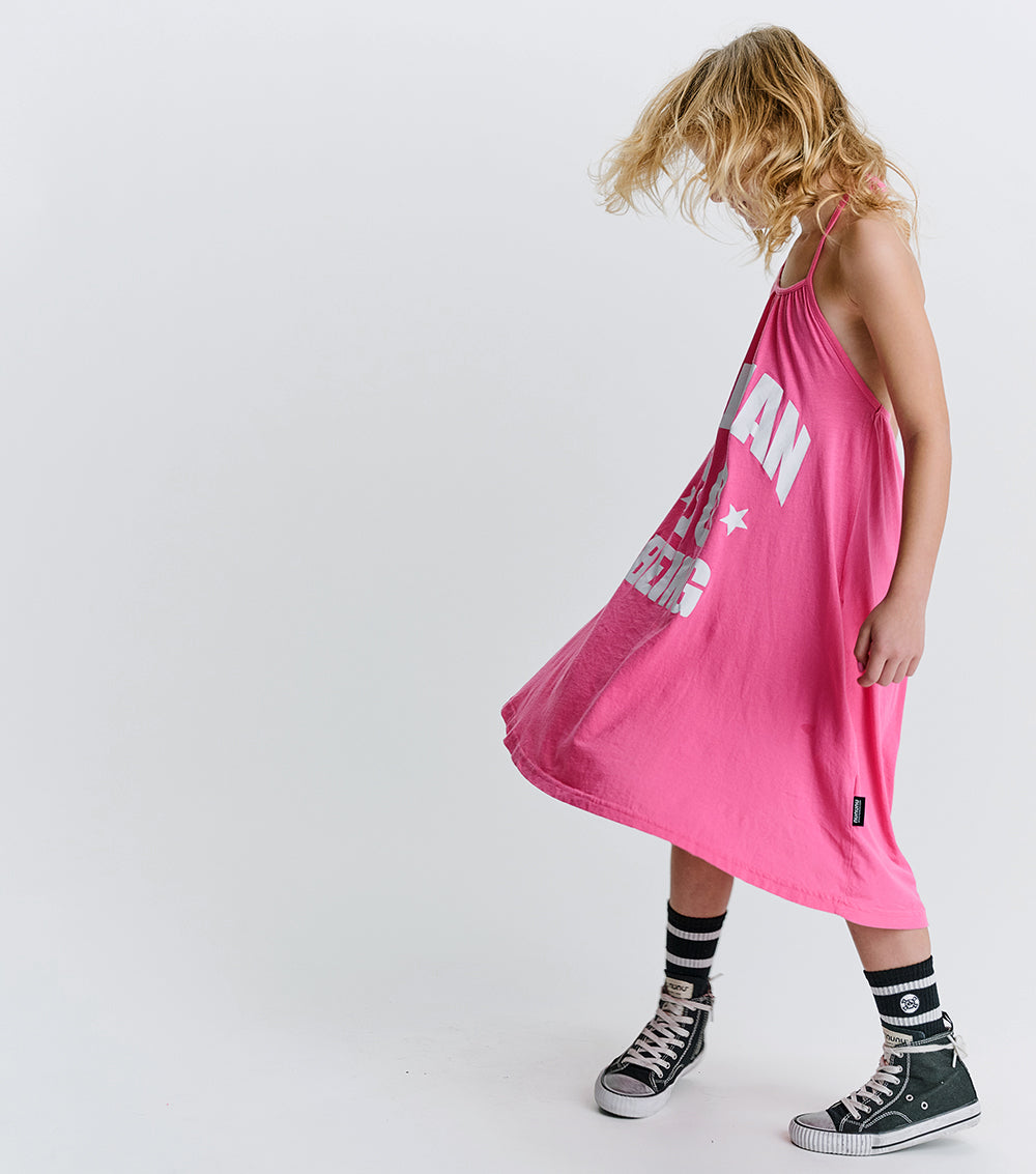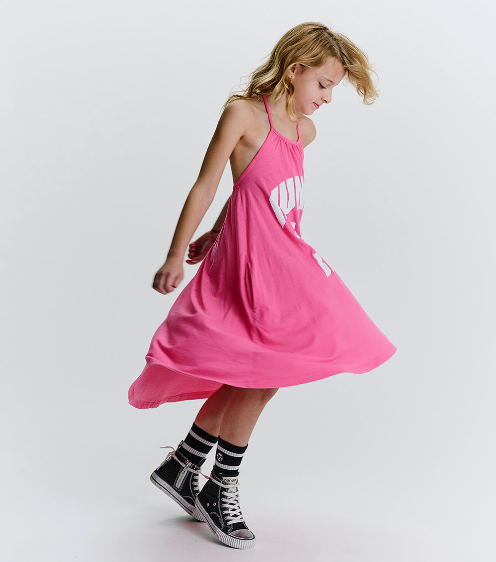 if your kid loves positive attention, this dress was made for them. it’s a single cotton halter dress in vibrant pink with human being printed in massive sporty lettering all over the front. it’s also got the number 10 in the middle surrounded by a star on each side because they’re always the star of our team. of course, the rounded hi-lo hem makes it ideal for school days, dance parties, and pretty much everything in between.