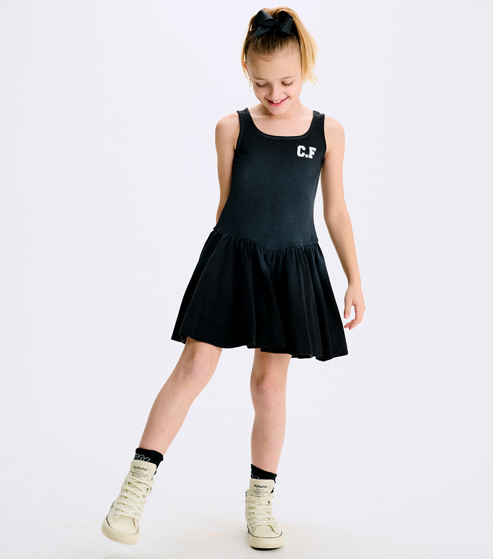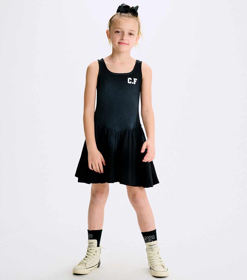 this dress is as ready to dance as your little one. it’s a black heavy single cotton sleeveless number with a little bit of a wash to it and a seam around the waist for total twirlability. it says c.f on the chest in white sporty print which obviously stands for control freak. because duh, the party doesn't start until the kid wearing this dress walks in.