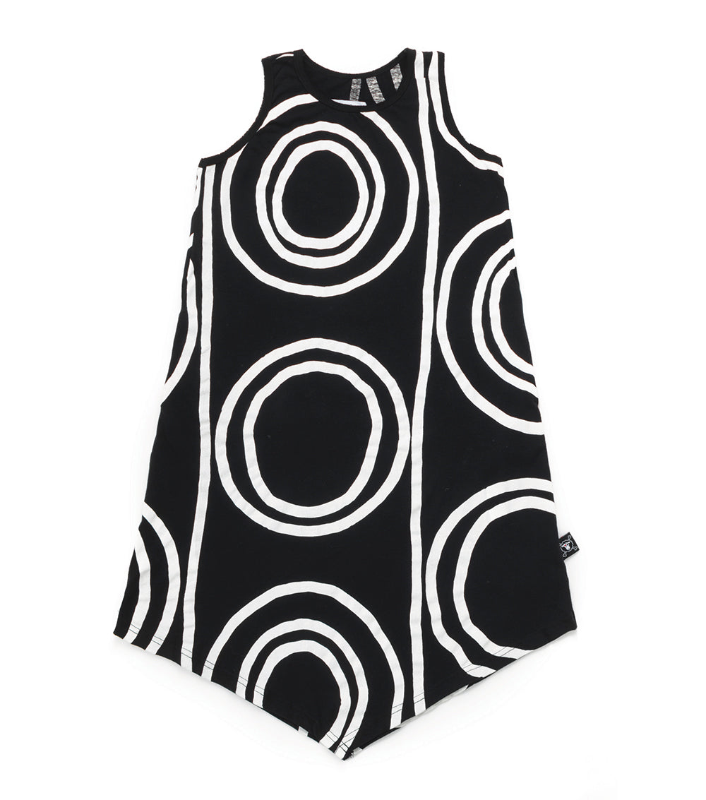 this ultra-cool black tank dress comes printed all over in our new concentric circle design—a collaboration with artist shay id alony. it makes for a good basic, but reads as so much more. the pointed hem pushes it over the top, stylistically. and it’s totally packable for vacay.