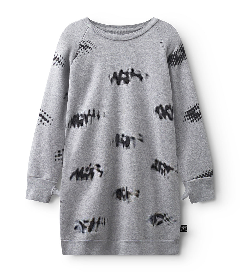 bring your “a” game. like a huge sweatshirt that morphed into the coolest dress, right down to the cozy thumb sleeves, the heather grey “a” dress is a nununu classic that keeps coming back. this season, it’s all about the vision, as our dot-pixel eyes peep out all over.