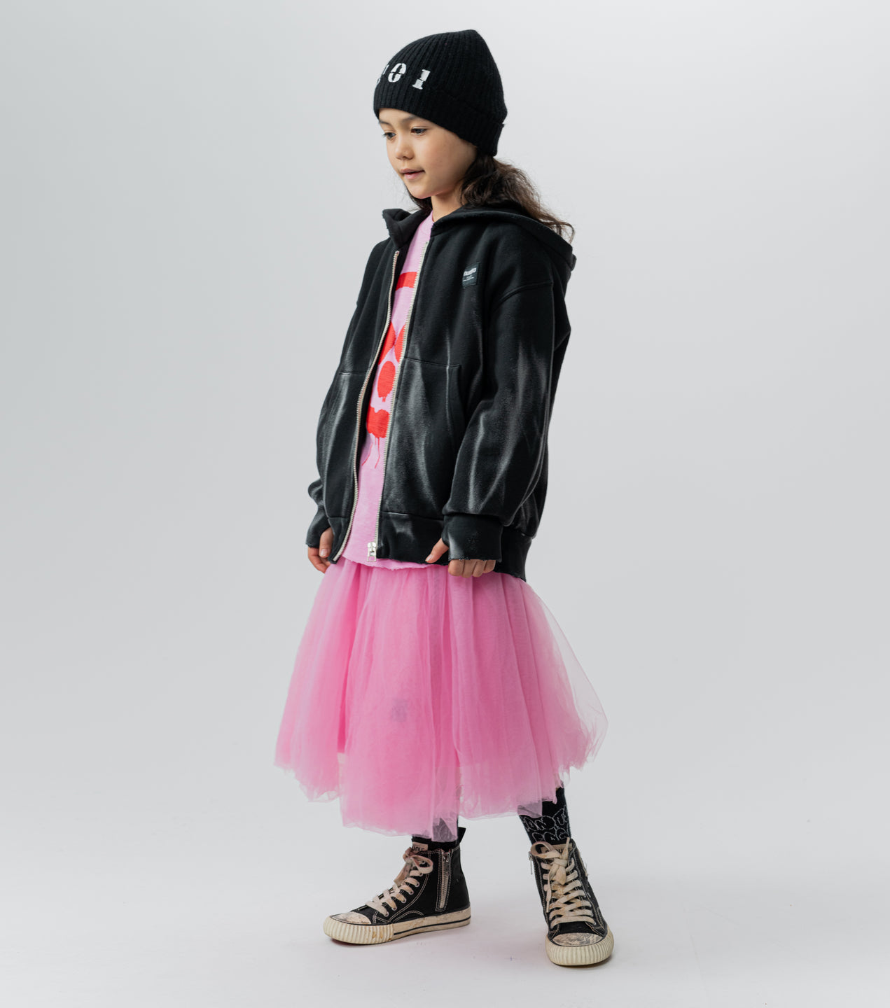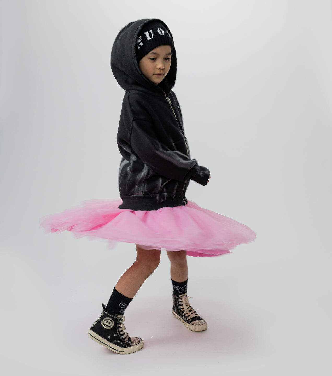when you’re in the mood to be just a little extra, this super pink tulle skirt does not disappoint. it’s giving madonna vids, courtney love magazine covers & carrie bradshaw street style. generous layers of tulle cascade down while a black elastic logo waistband keeps it snatched. pair it with tees & chucks to up the grunge factor, or go more literal with a leotard and ballet flats.