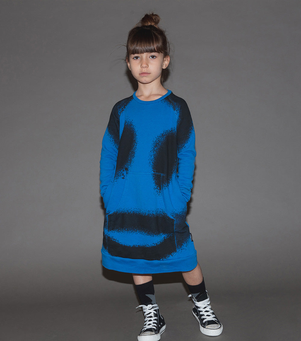 is it a smile? or is it a smirk? we’re not sure, but our new motif sure comes huge in a sprayed effect on this awesome vintage grey a-line jersey dress. slouchy & cool with a great fit, it has a simple crew neck on top & sweatshirt cuff on the bottom. then you’ve got these massive kangaroo pockets in an elongated effect on the front. oh, the things you can stash in there!