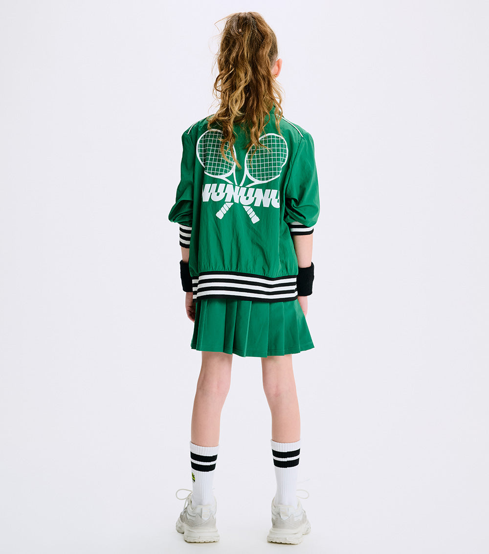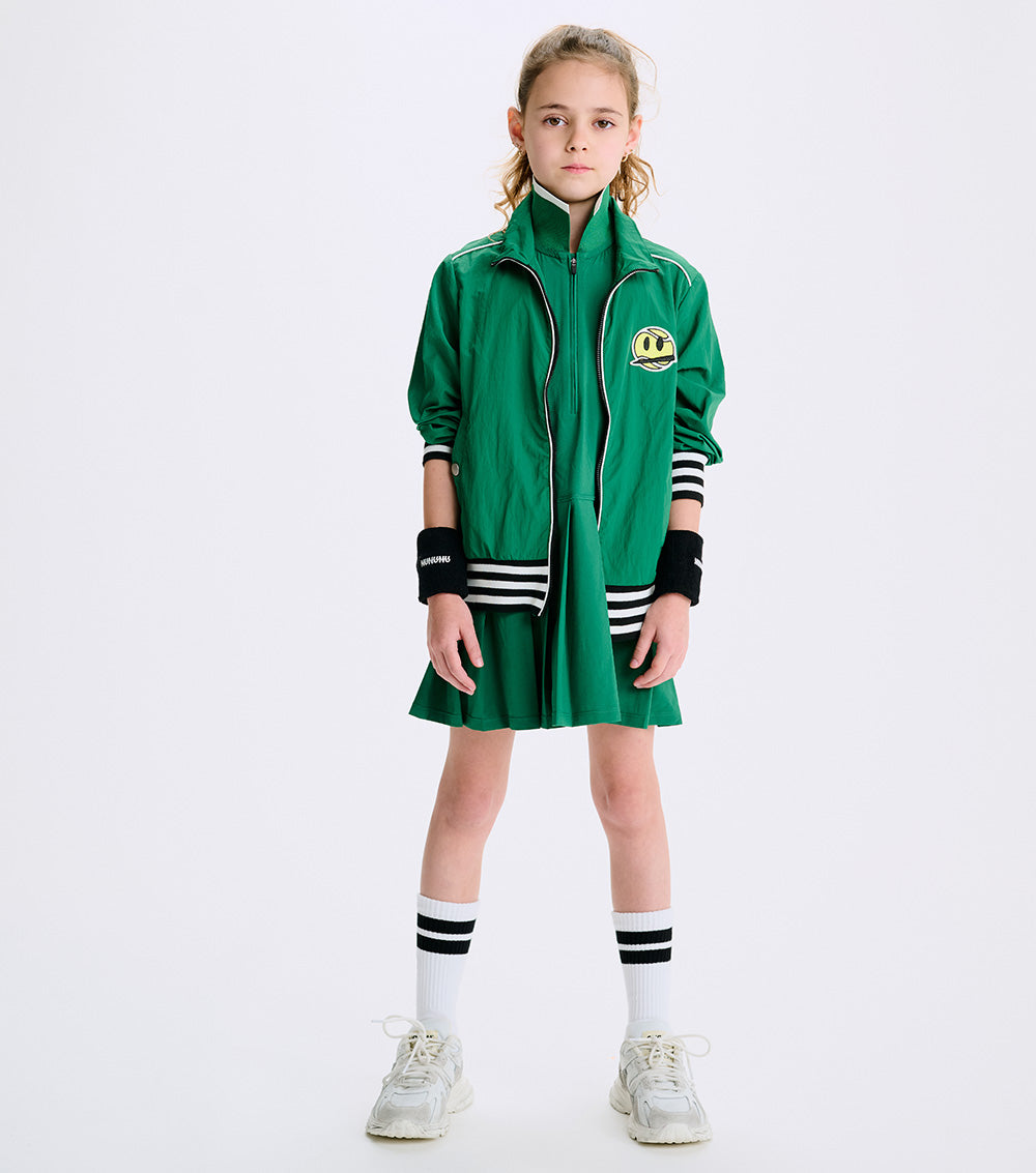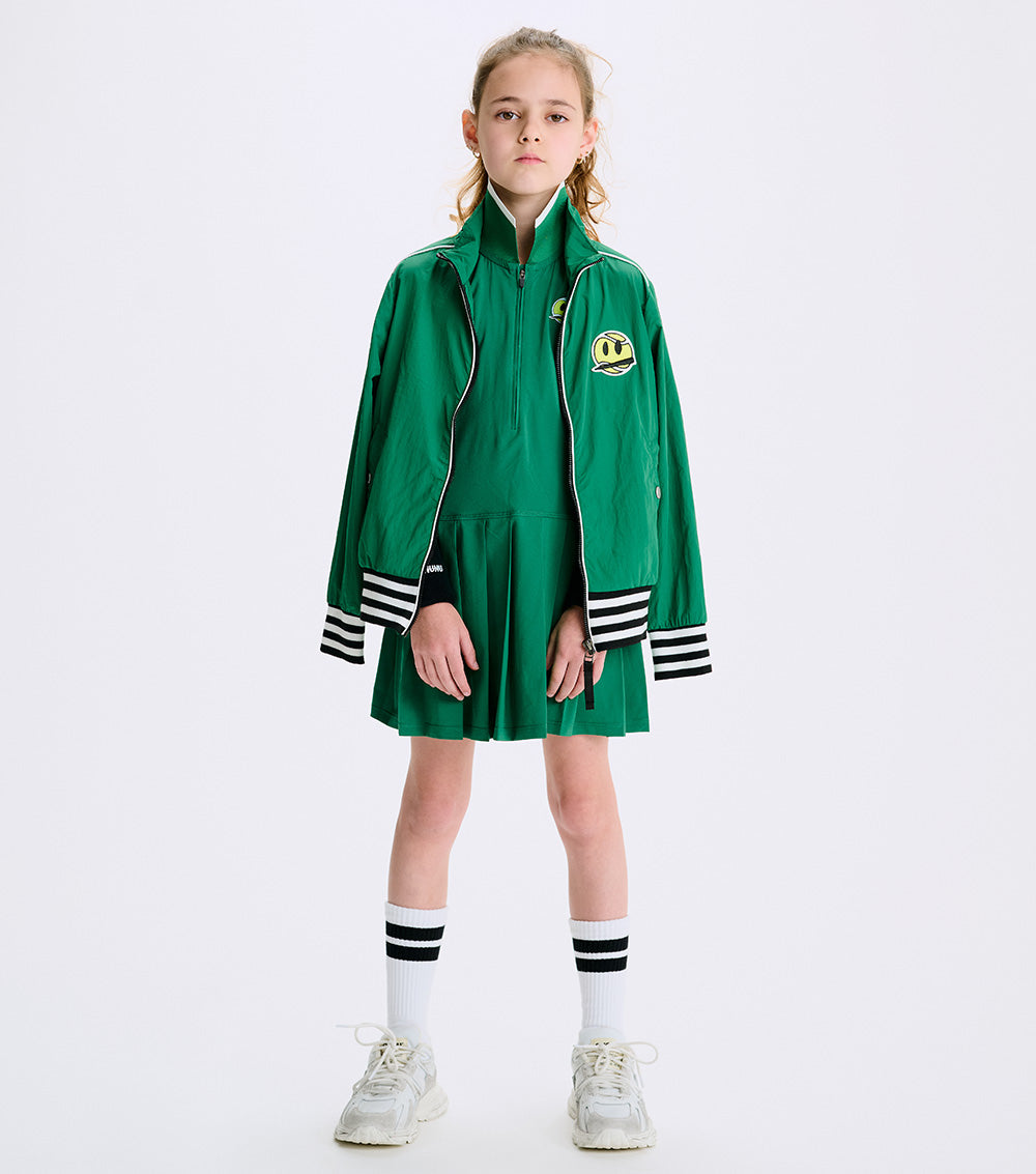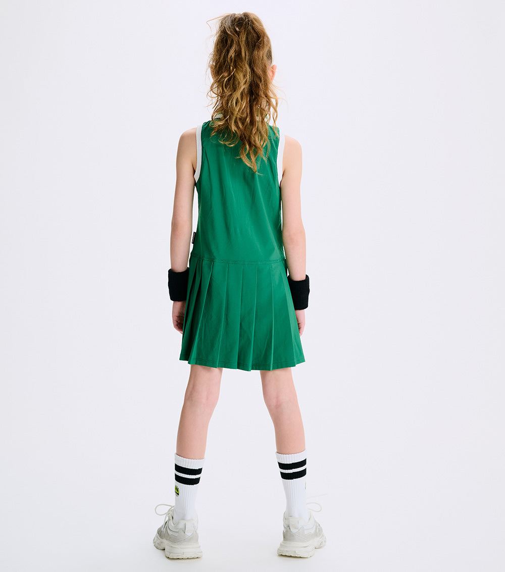 serve looks & aces in this court-inspired fit. it’s a collared tank dress with a wide pleated skirt that’s giving country club vibes but with an edgy flair. it’s made of an active material with a crepe feel and features a hidden half zip. the collar & the edges of each sleeve are outlined in thick white for sporty contrast and the front has our smirking tennis ball mascot in a smooth sticker print ready to cheer you on at every point.