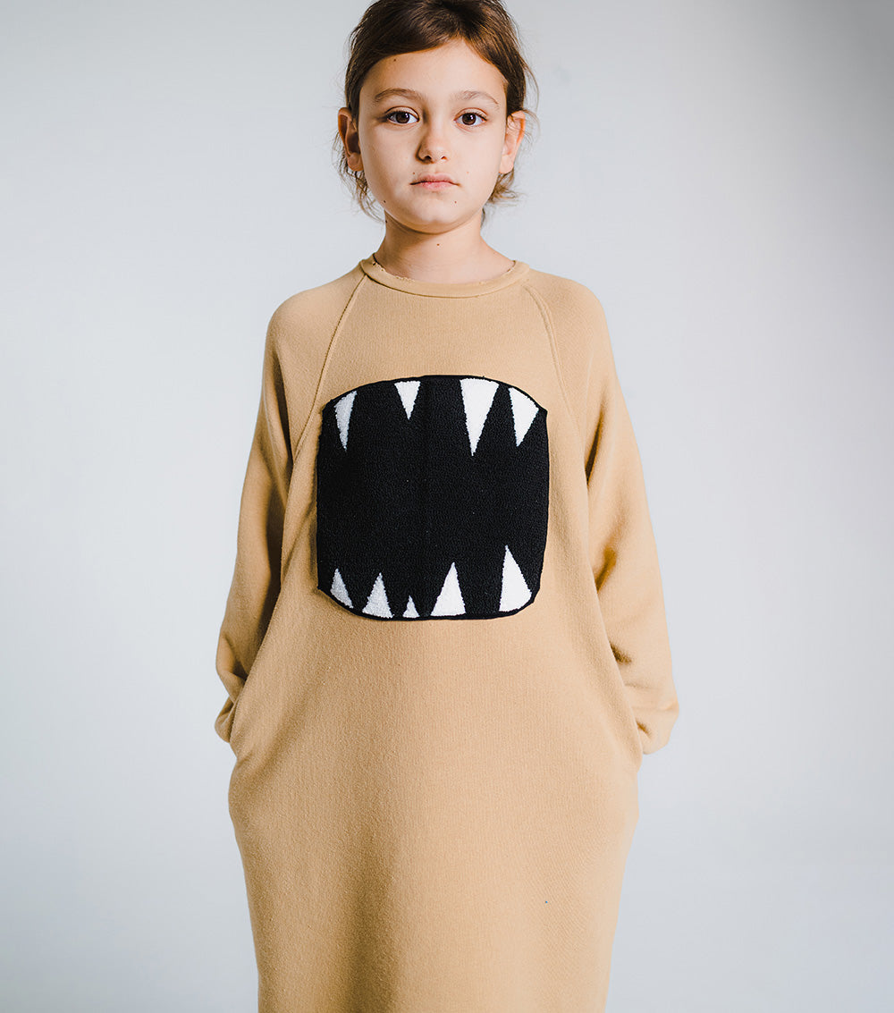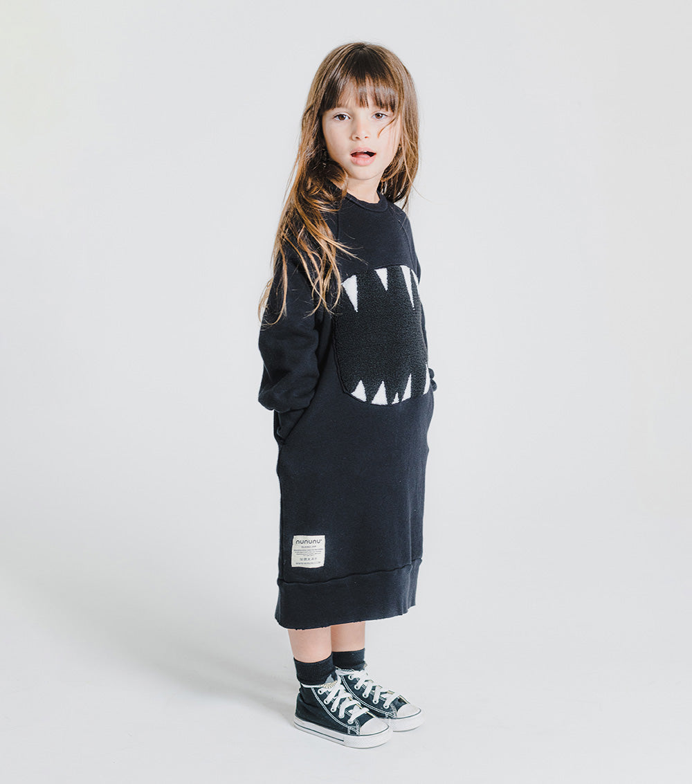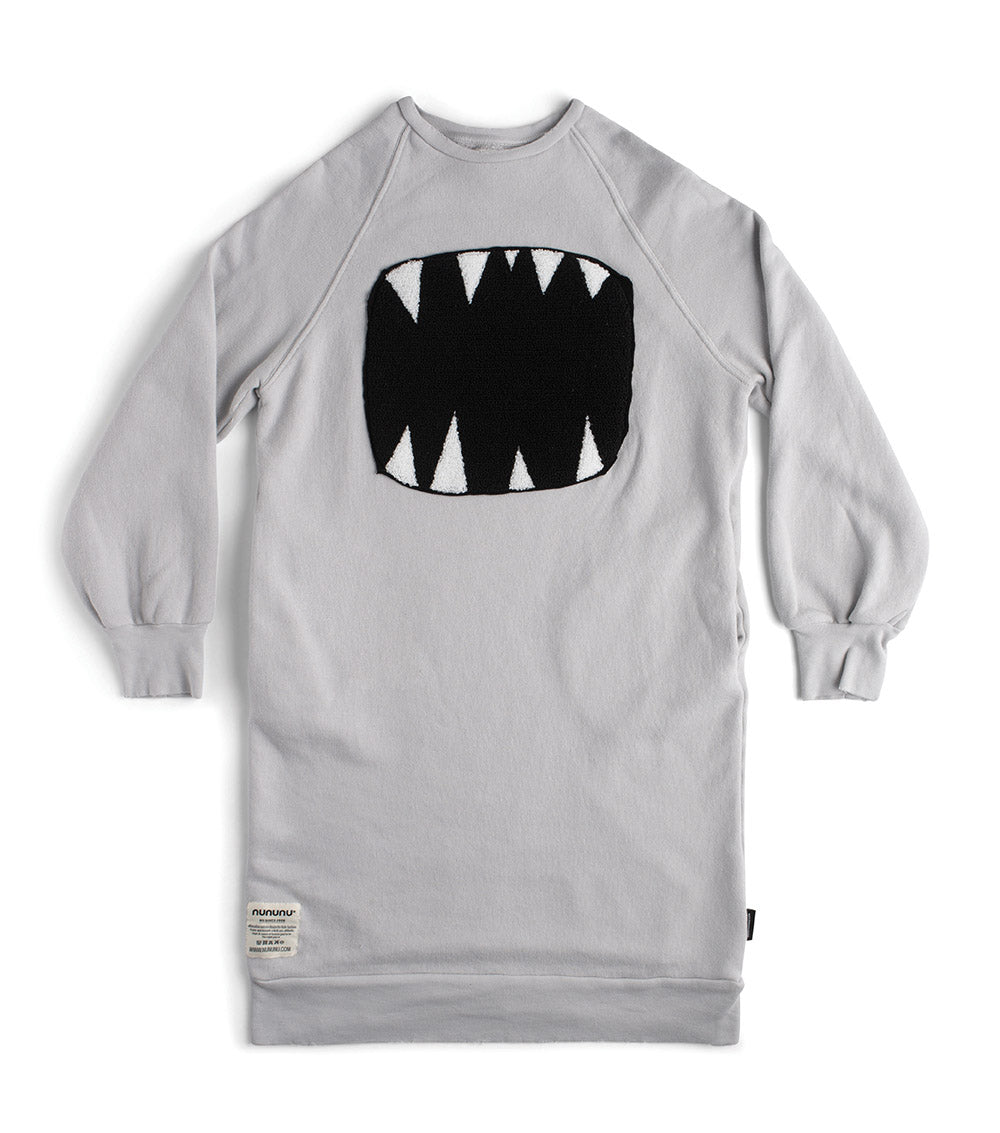 when is a sweatshirt not a sweatshirt? when it’s a dress. this showstopping piece in ice grey french terry combines the edgy coolness of an urban classic with the ease of a one-piece outfit in an a-line shape. on the front, our “roar” patch is big & fuzzy, representing the roar of a new generation, fangs & all. rawwr! thumbholes & side pockets are the dope details here. light distressing at the collar keeps it gritty.