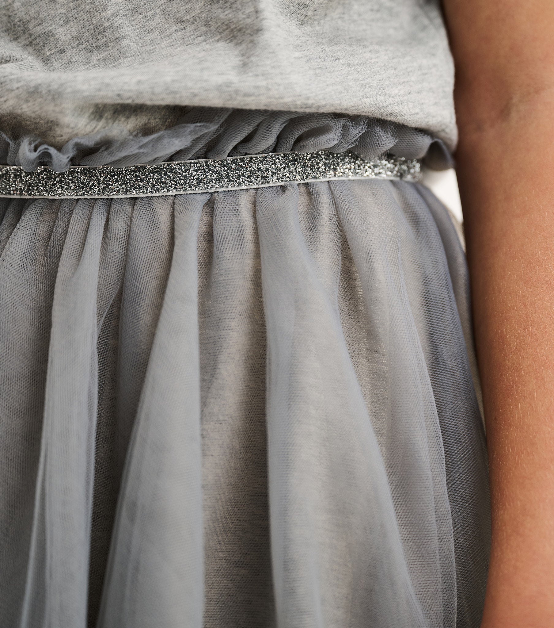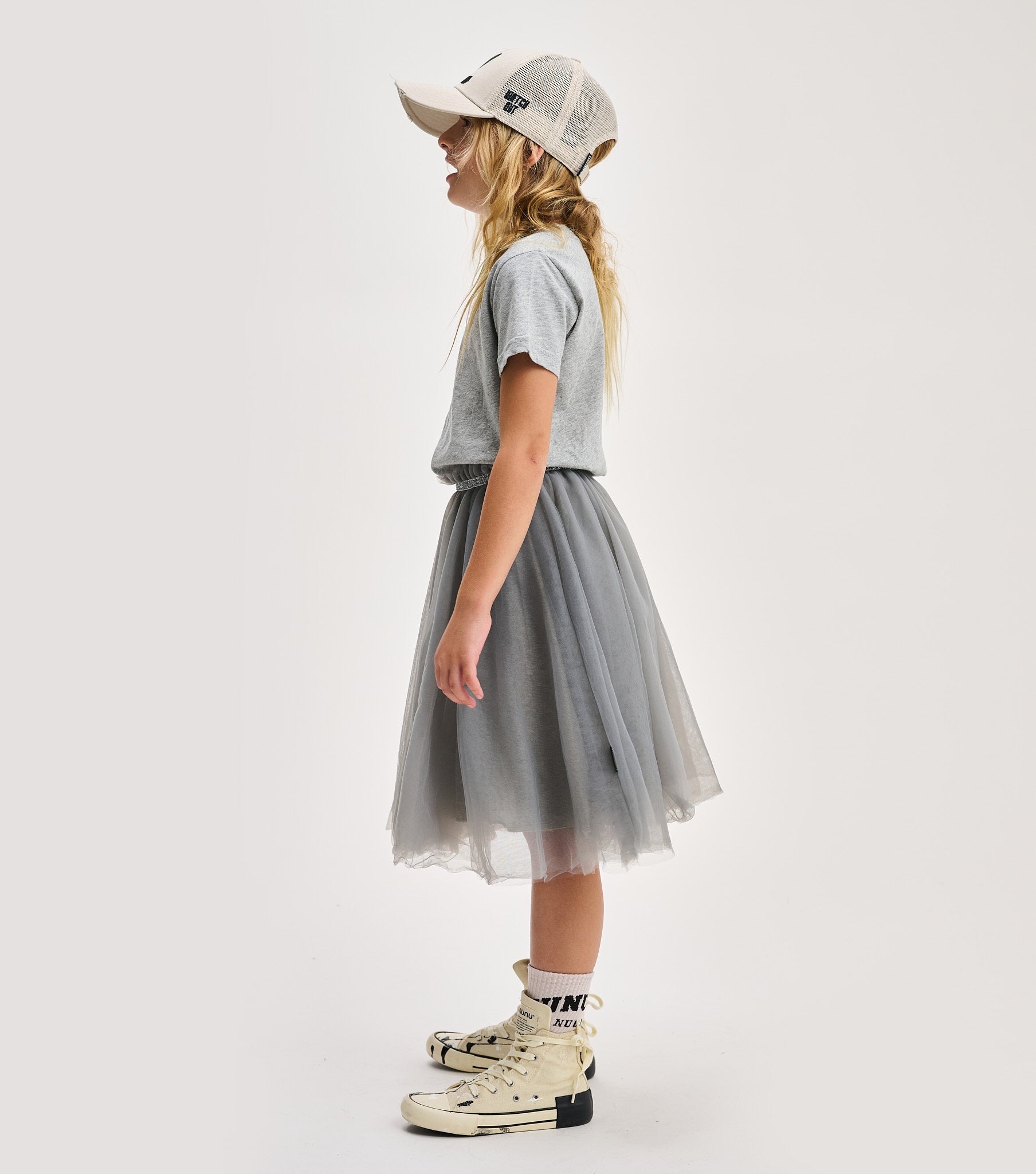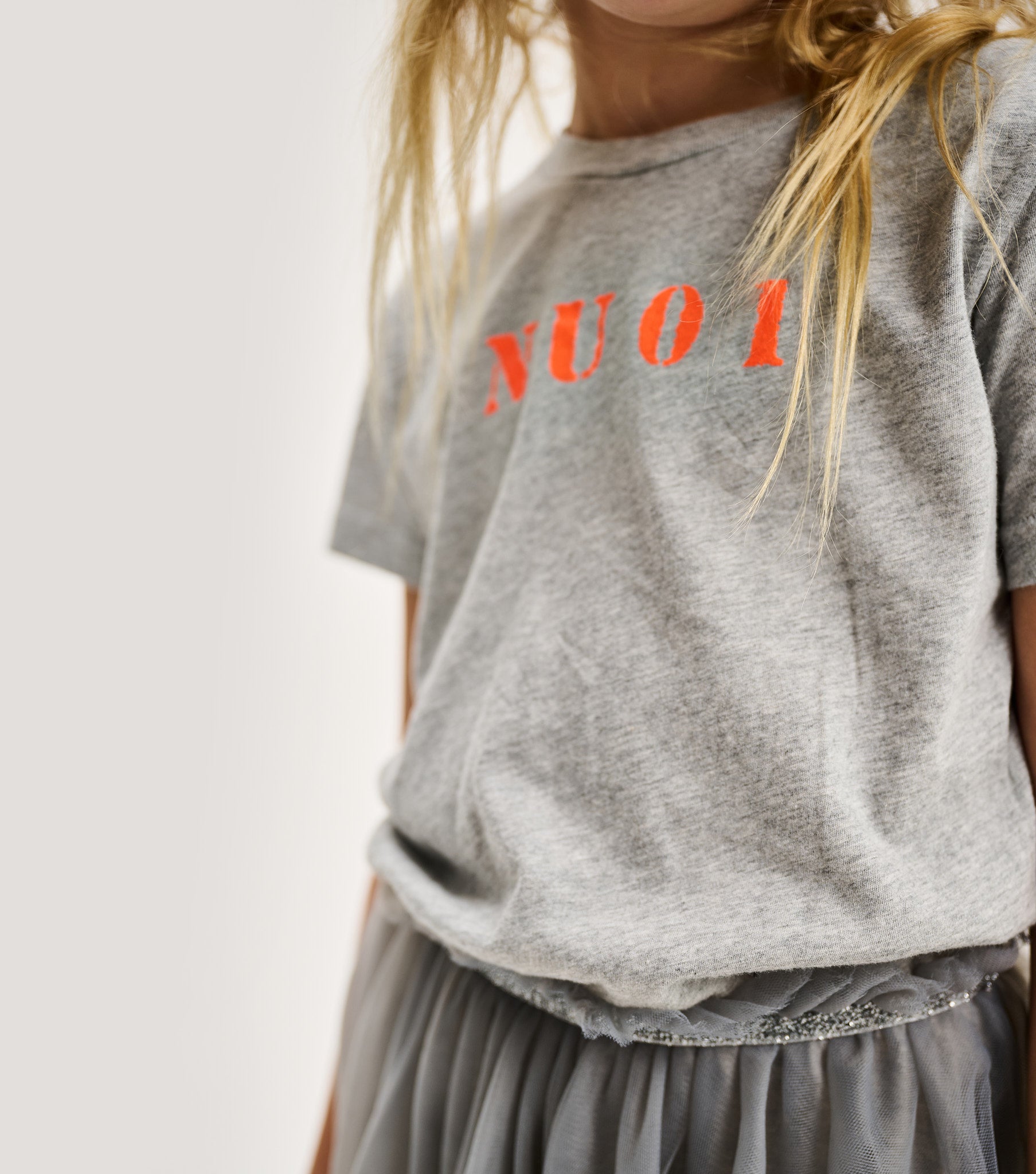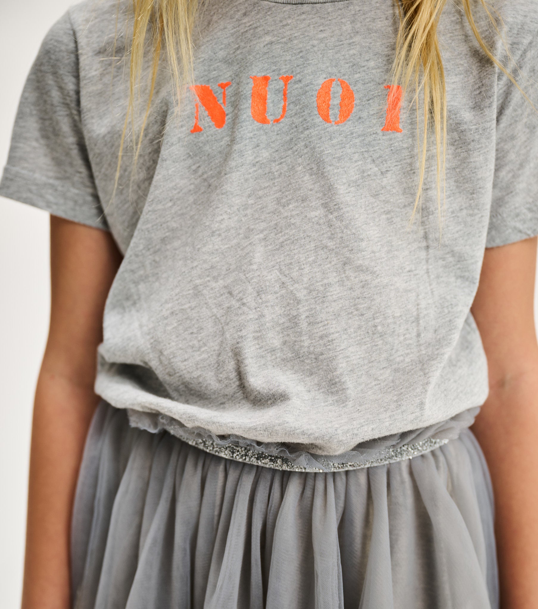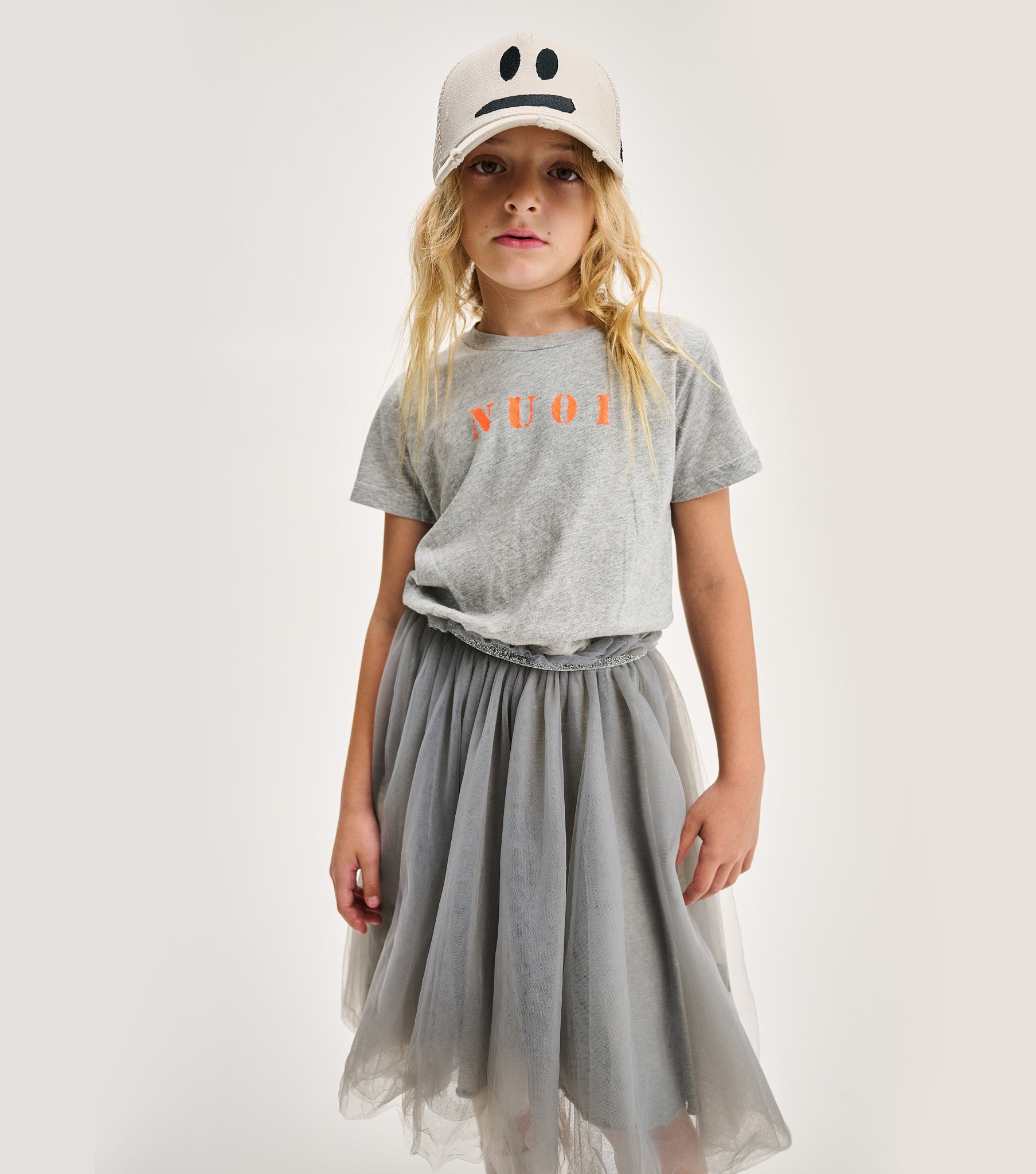 when it’s a dress to impress kind of day but your kid just feels like throwing on a t-shirt, this fit is the ideal way to have it both ways. on top, it’s a short sleeve basic t made of super soft heather grey single cotton with nu01 printed in bold, bright orange. because the world needs to know that this kid is always no 1. a sequenced silver waistband merges the top with the skirt, tying layers upon layers of tulle together so it’s ready to twirl until they’re dizzy. of course, it’s also got a thin cotton liner underneath to keep them comfy while dancing the day away.
