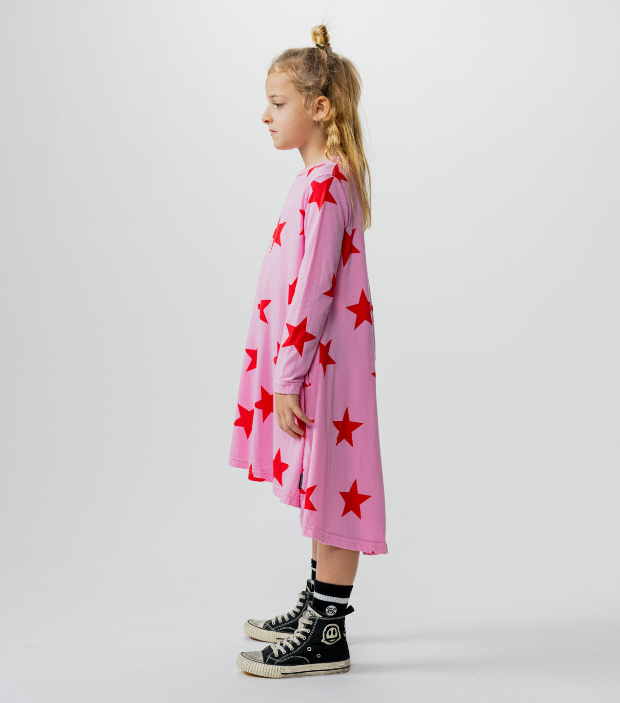 our signature star print is the perfect complement to this long sleeve drapey 360 dress in super pink. good for twirling around town, it’s longer in back for a high-low feel, but never bulky—super comfy for an all-day look. side pockets add function and the diagonal seam through the front adds flair. a beloved nununu classic.