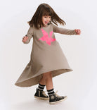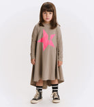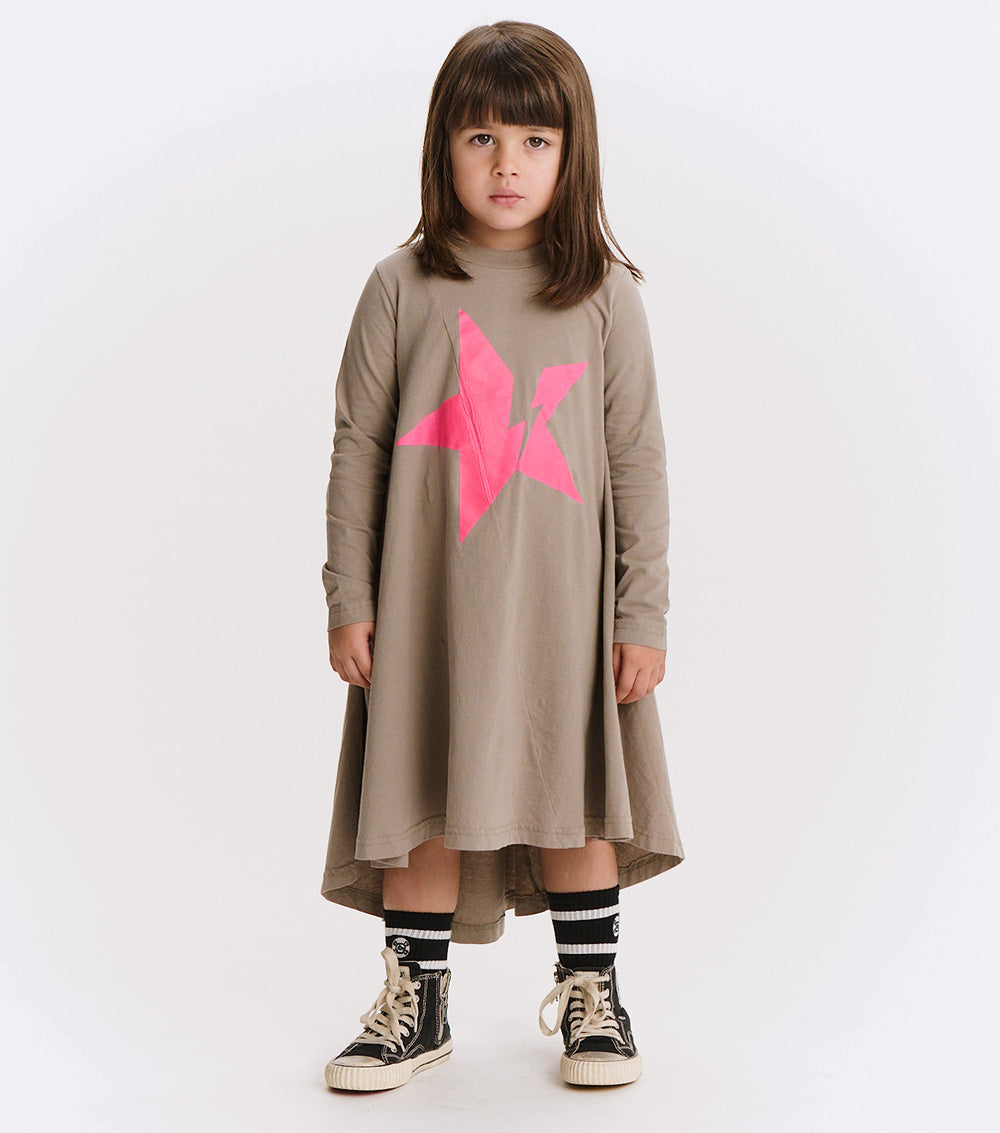 the iconic 360 dress is now fully charged. it’s made of soft, stone-colored single cotton with long sleeves and that flowy, twirl-ready silhouette that kids & grown-ups obsess over. the bold hot pink star gets hit with a lightning bolt for an extra energy surge your kid didn’t know they needed. a diagonal seam slices through the middle, upping the edge factor. feels like power. wears like a dream.
