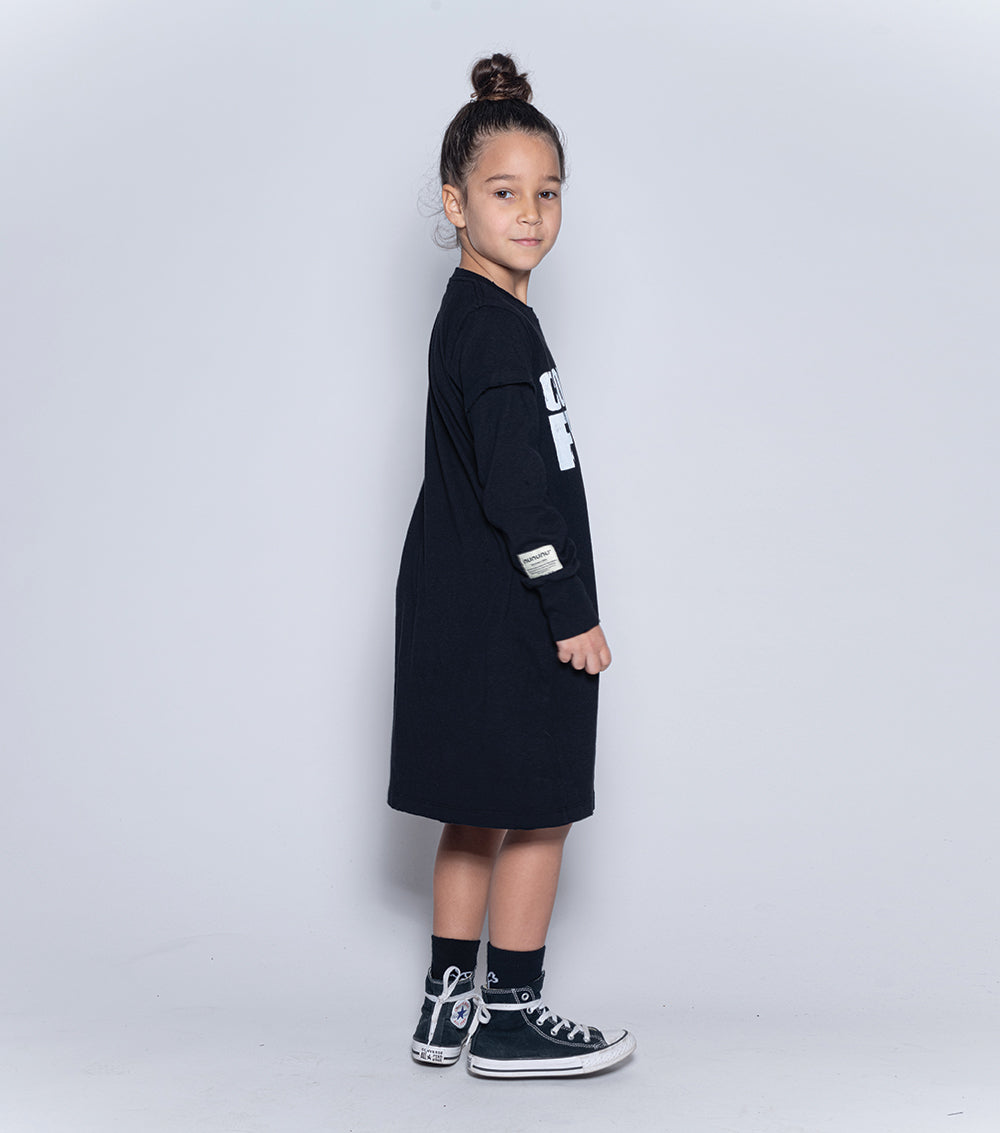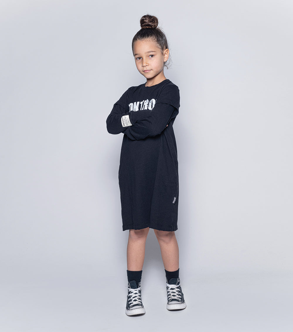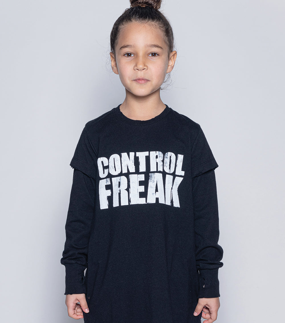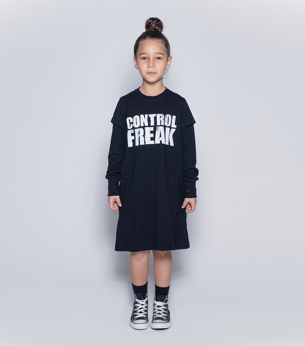 there are some major ‘90s vibes emanating from this black cotton a-line t-shirt dress for the girl who wants to act like she’s chill but still be totally in charge. it screams “control freak” across the chest in our cool, newsprint effect, but the shape is decidedly no-drama. the layered sleeve gives it that grunge feel we love so much.