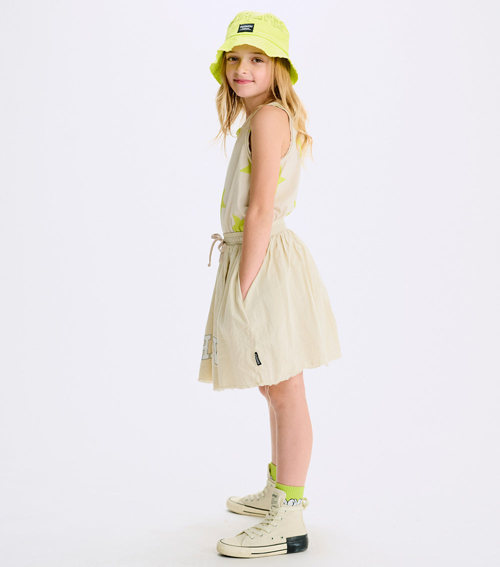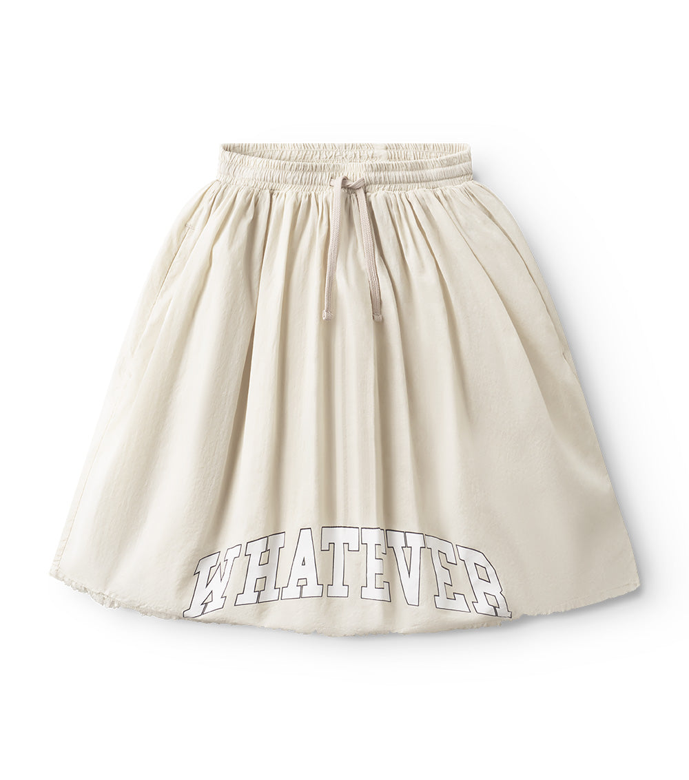 the perfect skirt doesn't exist… wait, this one is literally it. it’s a sporty look with secret pockets and a cinched drawstring waistband that ensures it stays put. it's made of soft, sheer white voile for those girlie vibes but of course we edged it up with a raw hemline on the bottom for that frayed look. oh yeah, and it says whatever arched across the bottom in a collegiate kind of font. because whoever wears this will look too cool to care about anything else.