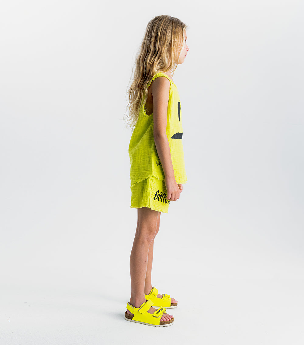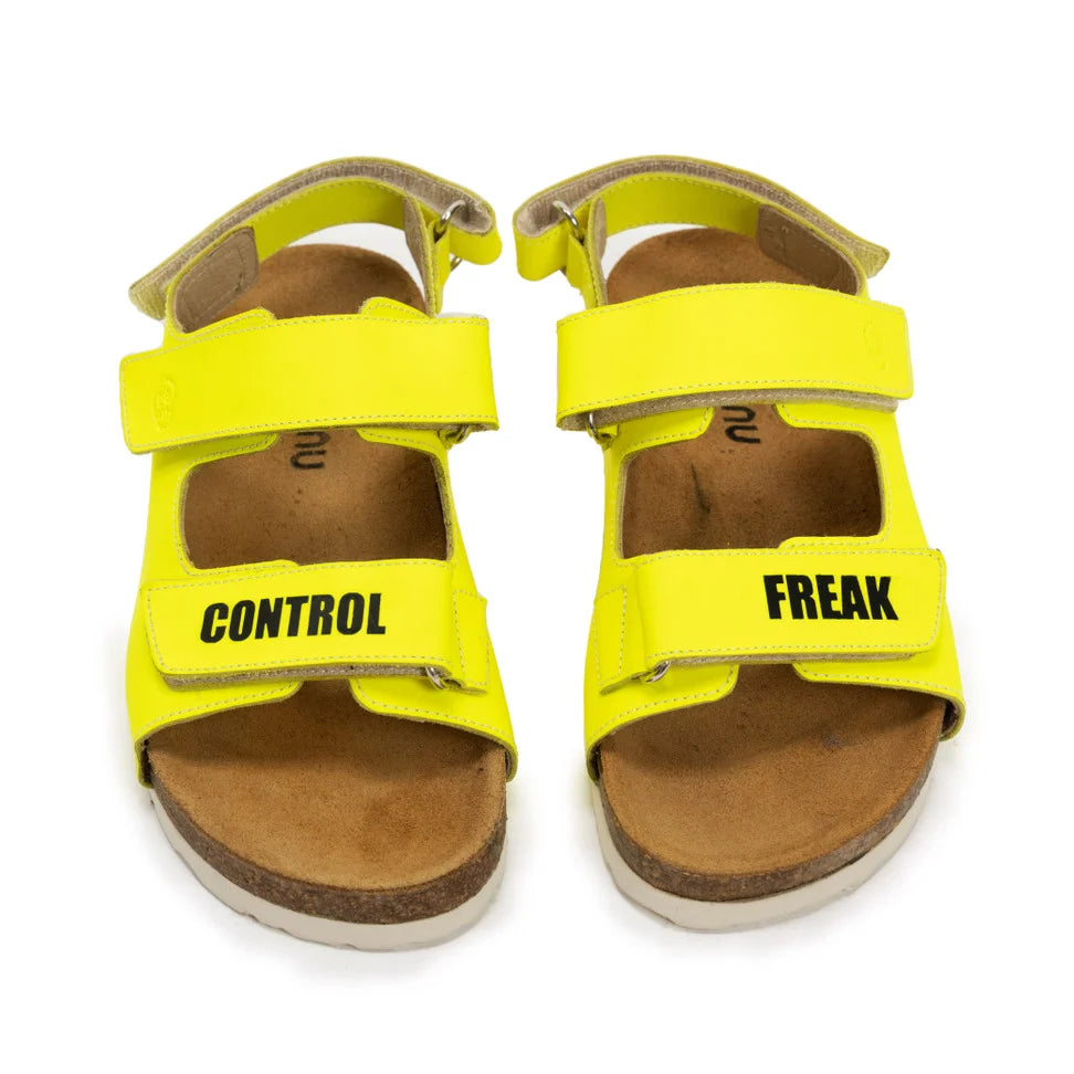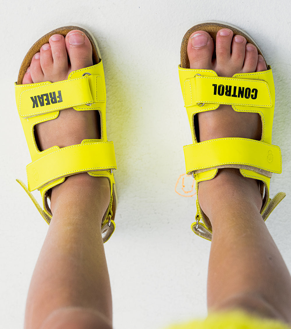 here’s what we’re seeing this summer. all of the velcro of our dreams. these hot lime leather sandals for boys & girls are so easy to get on & off but stay like a dream. made of a moldable cork footbed that starts out comfy but gets even better with wear. they scream out control freak right over the toes in bold black capital letters. look down, find out.