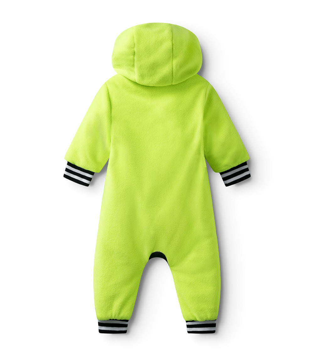 get ready to let your tiny human shine like they were always meant to with this super bright hot lime baby overall. it’s nice & warm, made of a totally comfy material they’ll love with black & white striped ribbed cotton cuffs that offer structure & a fashion-forward flair. an asymmetrical zipper situation closes up to a high collar to protect the neck, followed by a big cozy lined hoodie that keeps it ultra-functional. our bubbly logo print is on the chest in black & white like a cartoon balloon with NU01 just below to remind the world that this baby has been number one since day one. plus, it’s got snap pockets on the side to stash pacifiers that threaten to control the volume on the loud little being boasting this bold look.