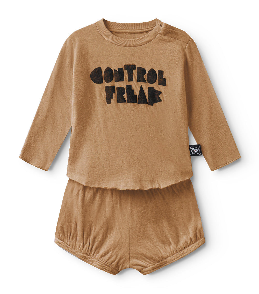 with a face as captivating as your tiny human’s, they’re sure to have all the control. especially if they’re wearing this totally chic gender-neutral set. that’s why we’ve got control freak printed across the top of the double single cotton long-sleeve in big, black letters that look straight out of a video game. the bottom hem is raw to show off that this baby might be playful, but they’re not playing about getting their way. plus, snap buttons are on the top shoulder so you can at least control the time it takes to change them. the bottoms are super comfy shorts with an elastic waistband & cinched elastic bottom hems so the legs can move free & unhindered, just like your kid’s rebellious spirit.