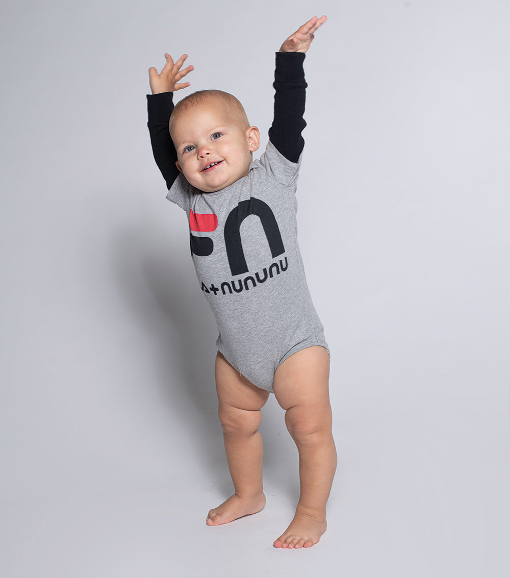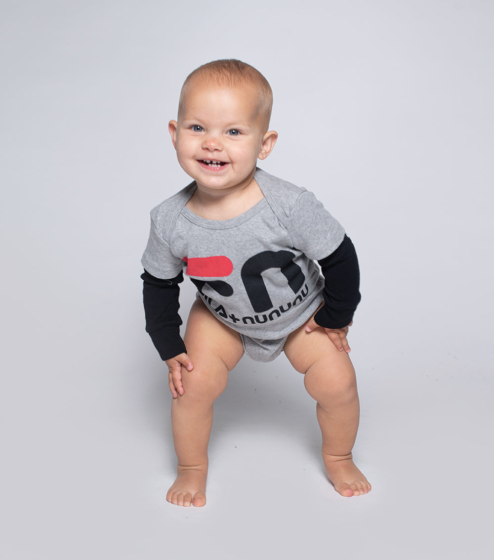 a wardrobe staple for the smallest person you know. this heather grey onesie features a double layered look to get that mid aughts rock & roll look early on. part of our collabo with FILA, this baby features our mashup monogram logo in black & red on the front, with more logo action on one sleeve. an extra wide neckline & crotch snaps make this cute piece functional.