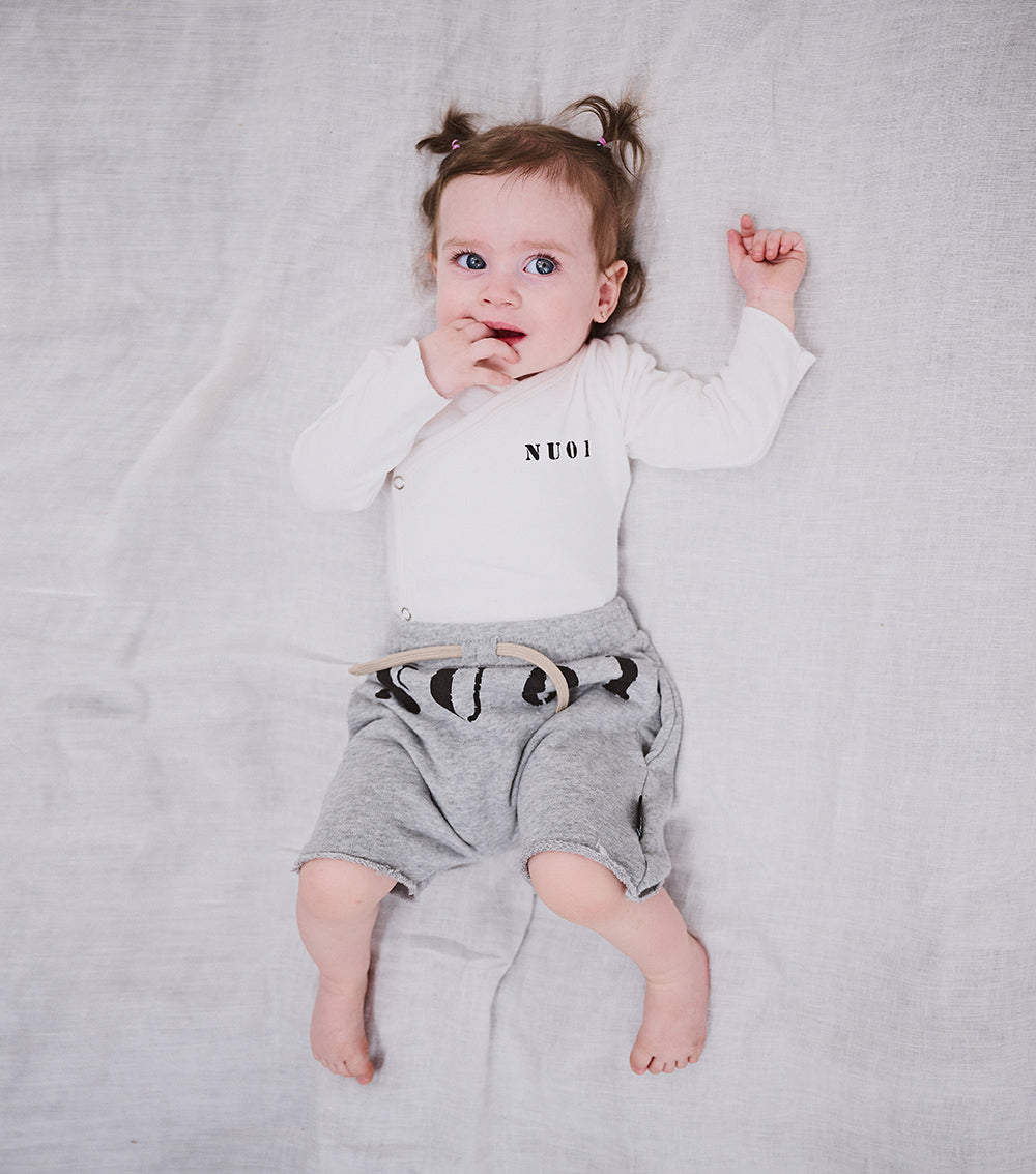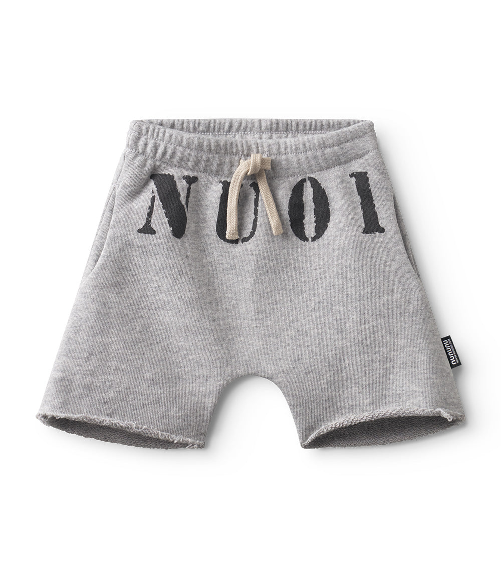 here’s a pair of sweat shorts that’ll never leave your kid’s top priority status up to interpretation. they’re a gender-neutral heather grey fit made of luxuriously soft french terry with nu01 printed write on the front nice & big in a serious kind of font. a stretchy and soft waistband keeps them up when you want them on & makes changing easy when you don’t. loose cut & raw edges keep the vibe tough and pockets are the perfect place to keep extra pacifiers, because you know your little rebel isn’t afraid to throw them.