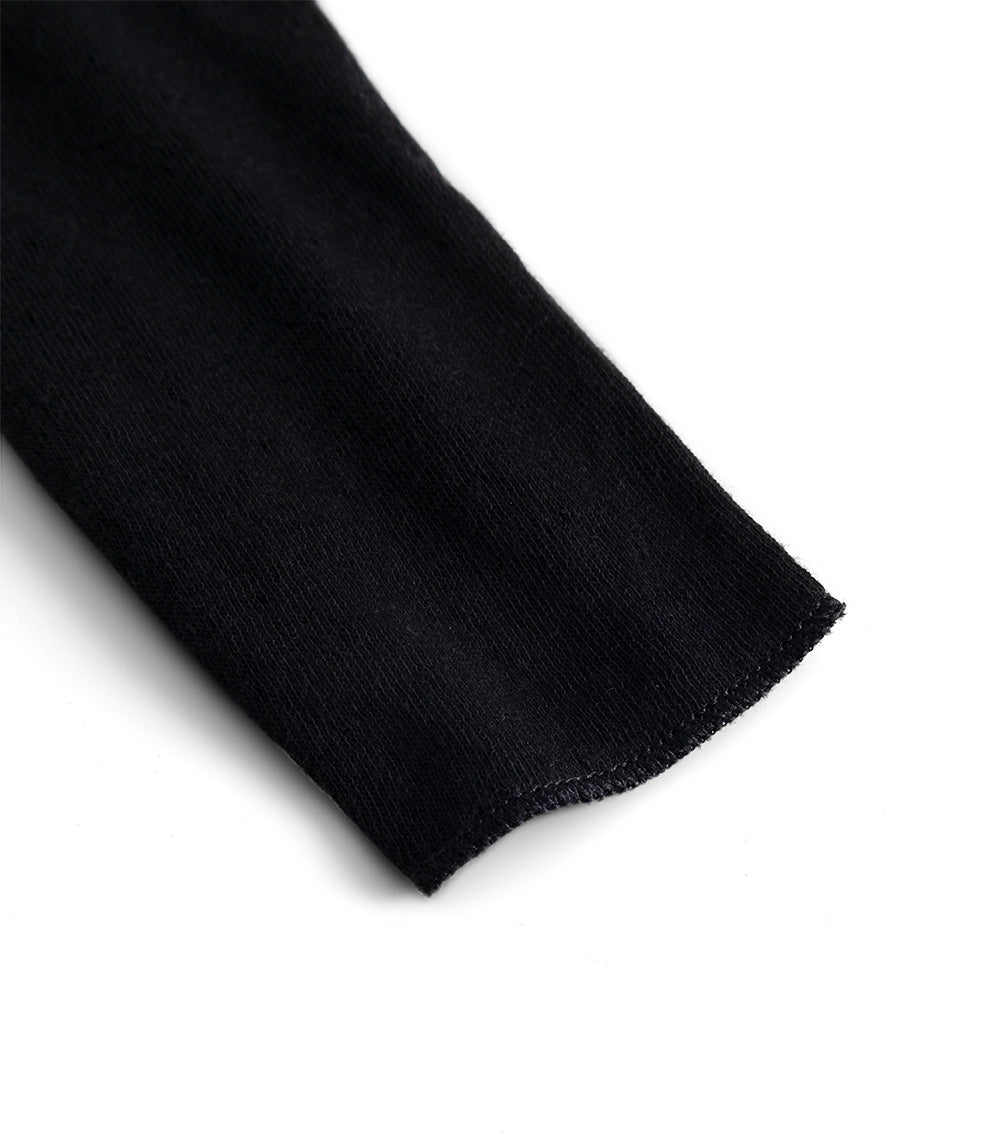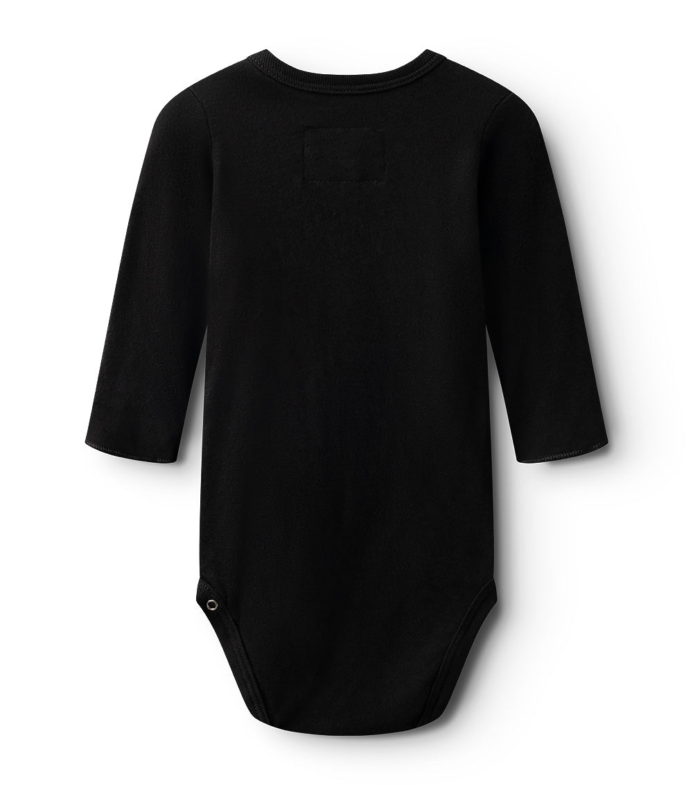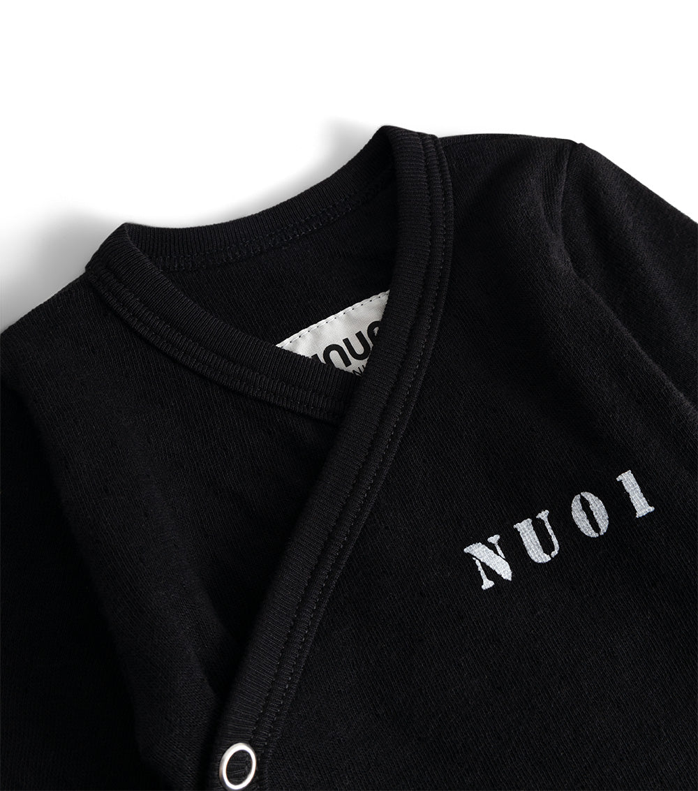 wrap your new addition in this perfect onesie. it says nu01 in a serious print that almost looks stamped on because we know the tiny human inside is top priority. so of course, we’ve designed this super comfy fit to ensure they’re bundled up just right for their travels. it’s a black gender-neutral piece made of soft double single cotton with an envelope front that wraps across creating a wide v neck and leaving the legs free. side & crotch snaps make for easy unwrapping, or as you call it, diaper changes