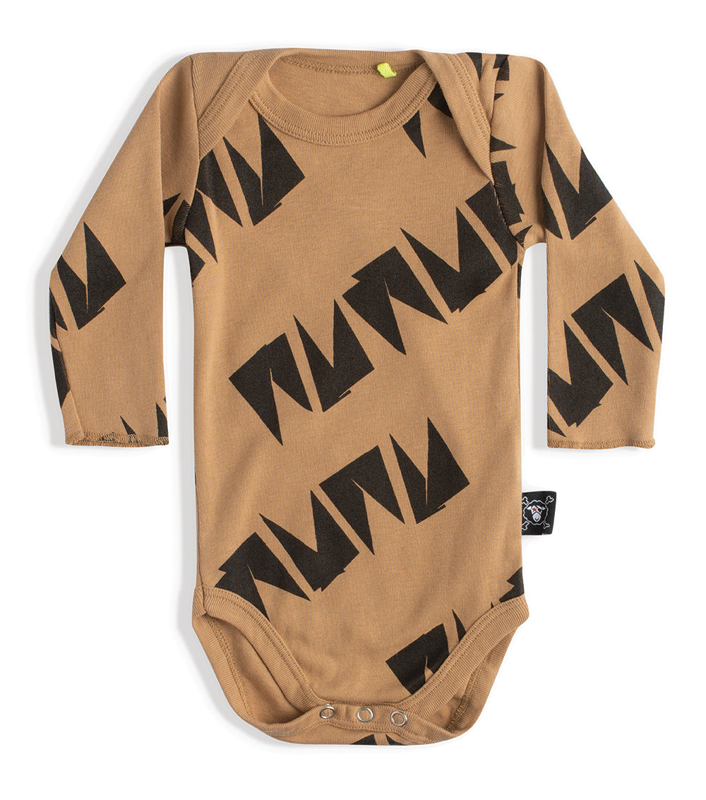 our sharp new “nununu” design in a diagonal all over repeat, an abstract representation of our logo. It happily dances all over this mocha, cotton-cozy long sleeve baby onesie. it’s a classic shape that goes on with zero friction. snaps at the crotch make diaper changes a no-fuss situation, and shoulder flaps let you pull it down from the top—whatever’s easiest in the moment.