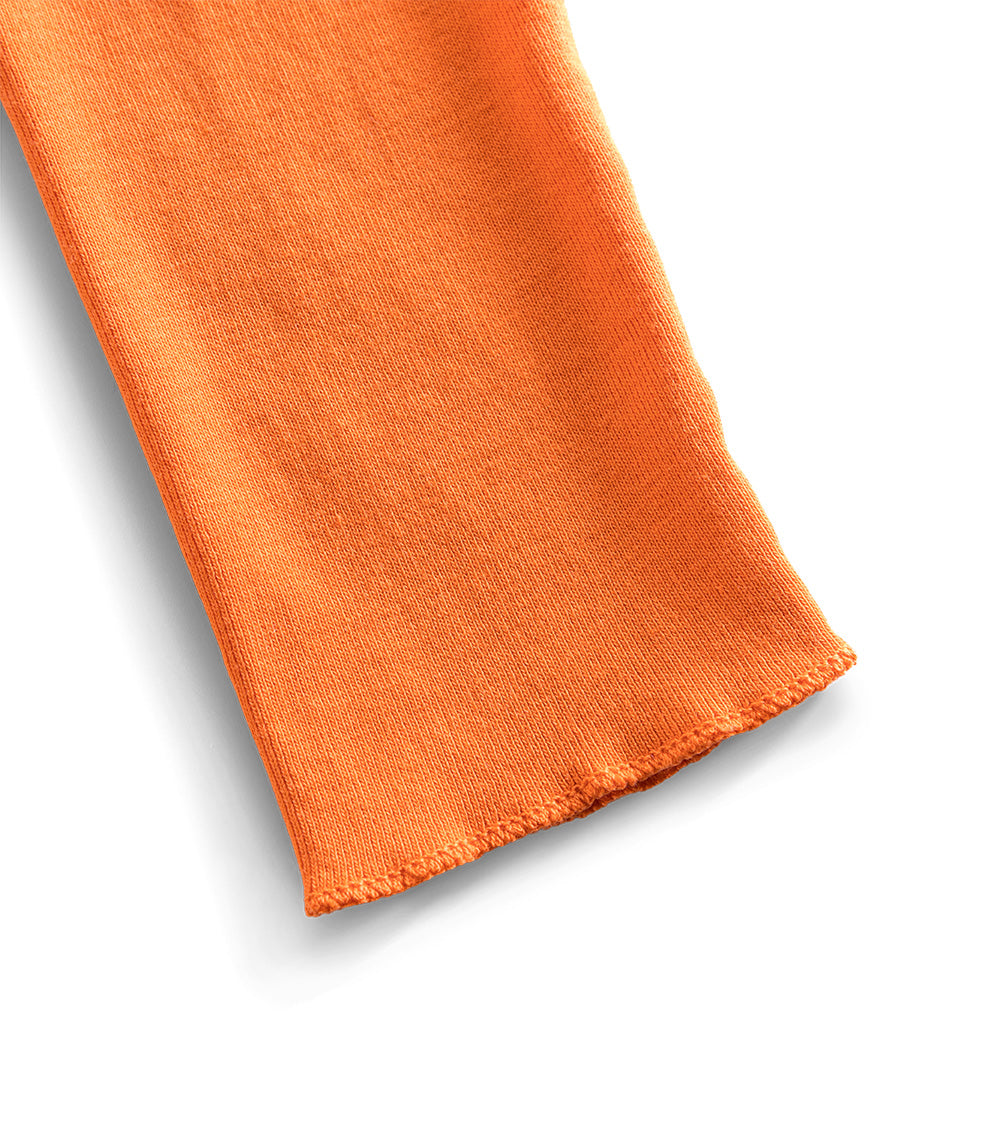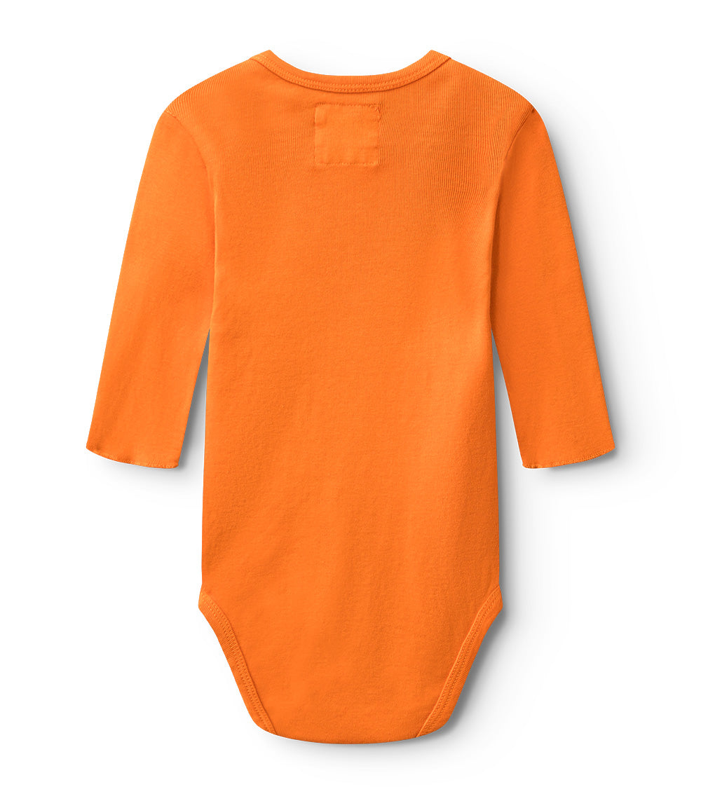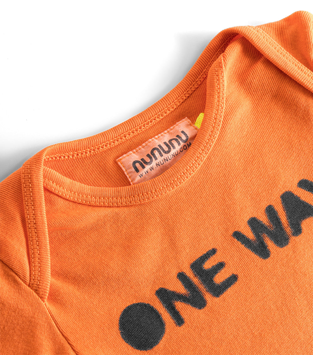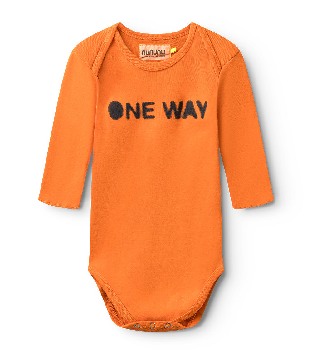 we’ve got our road-inspired one way print looking almost spray painted on this gender neutral orange baby onesie. because it shouts out the rules around this crib. it’s made of fine rib fabric with long sleeves and a classic shape that goes on with zero friction. snaps at the crotch make diaper changes a no-fuss situation, and shoulder flaps let you pull it down from the top — whatever’s easiest in the moment.