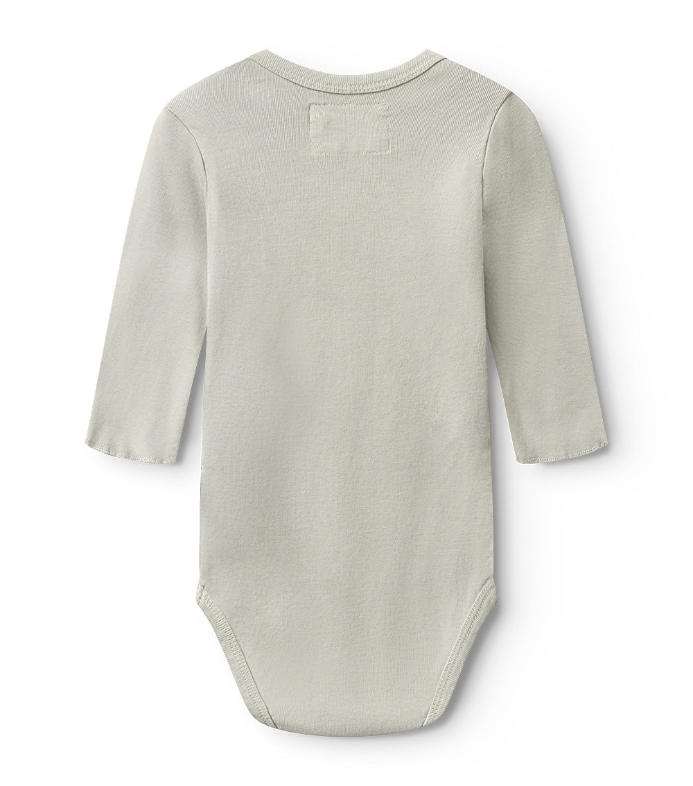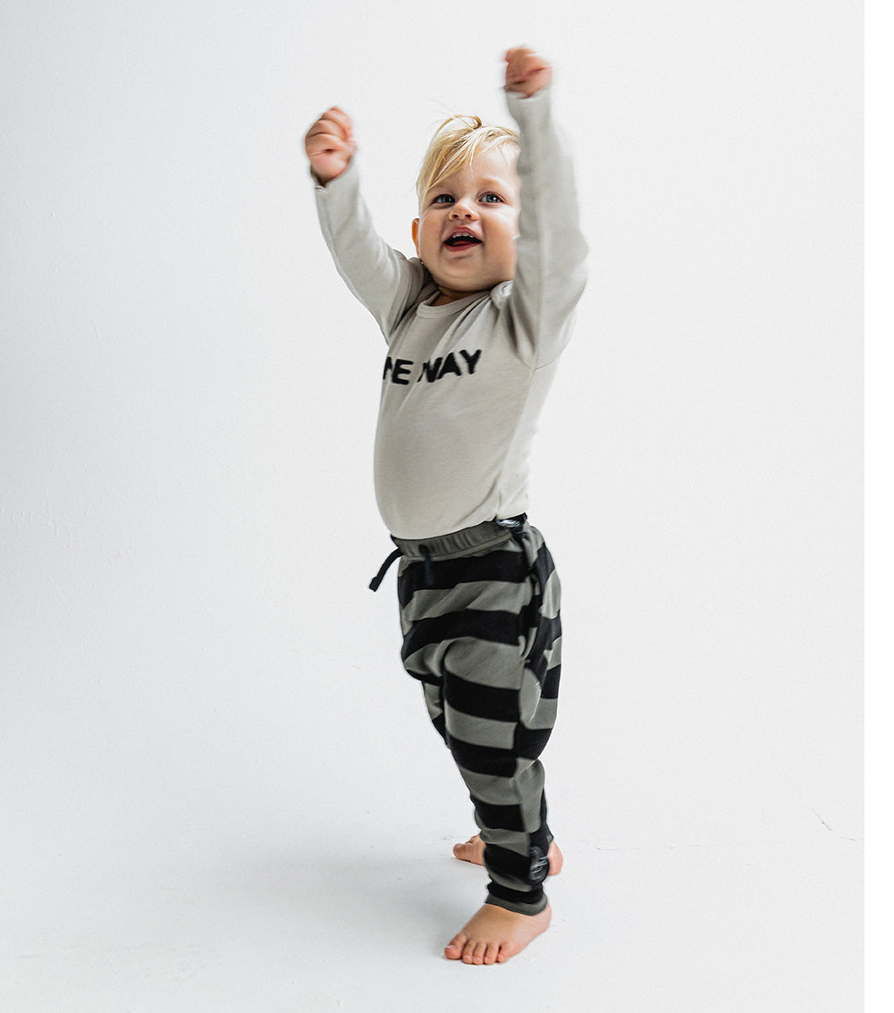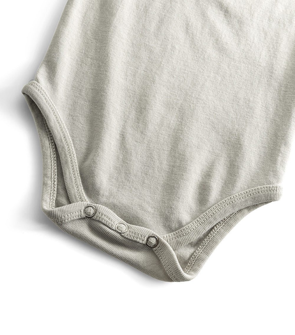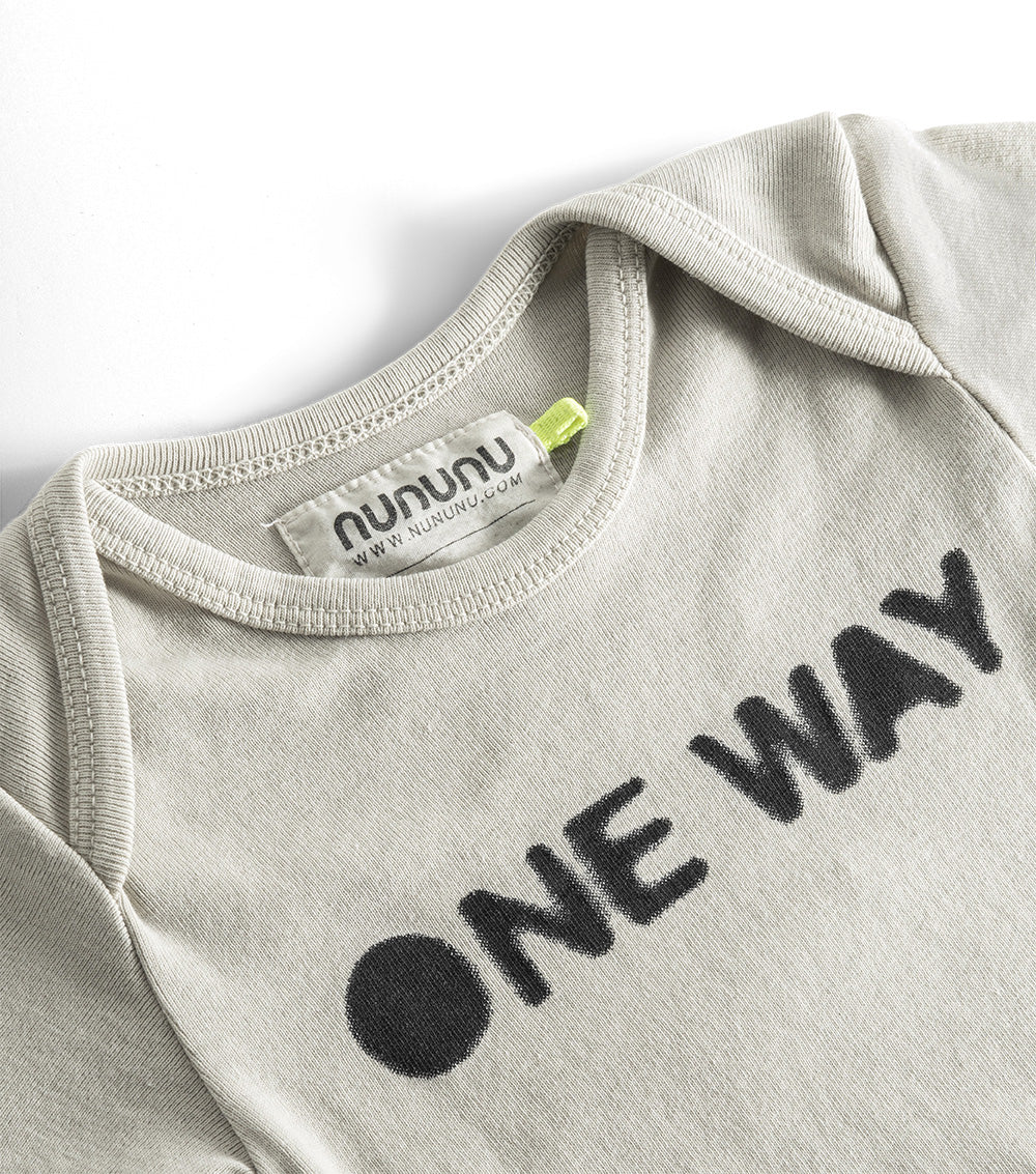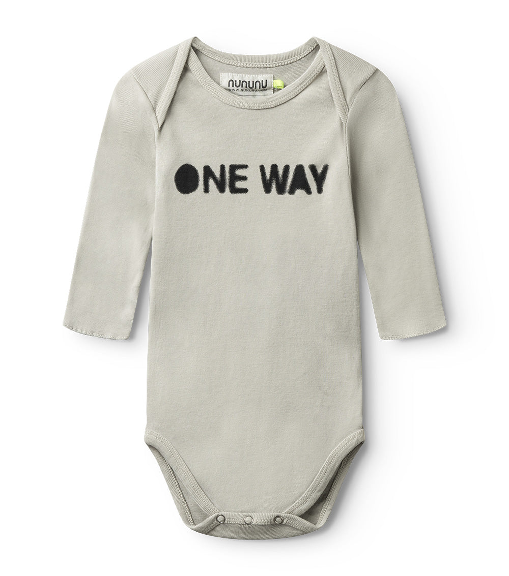 we’ve got our road-inspired one way print looking almost spray painted on this gender neutral smokey grey baby onesie. because it shouts out the rules around this crib. it’s made of fine rib fabric with long sleeves and a classic shape that goes on with zero friction. snaps at the crotch make diaper changes a no-fuss situation, and shoulder flaps let you pull it down from the top — whatever’s easiest in the moment.