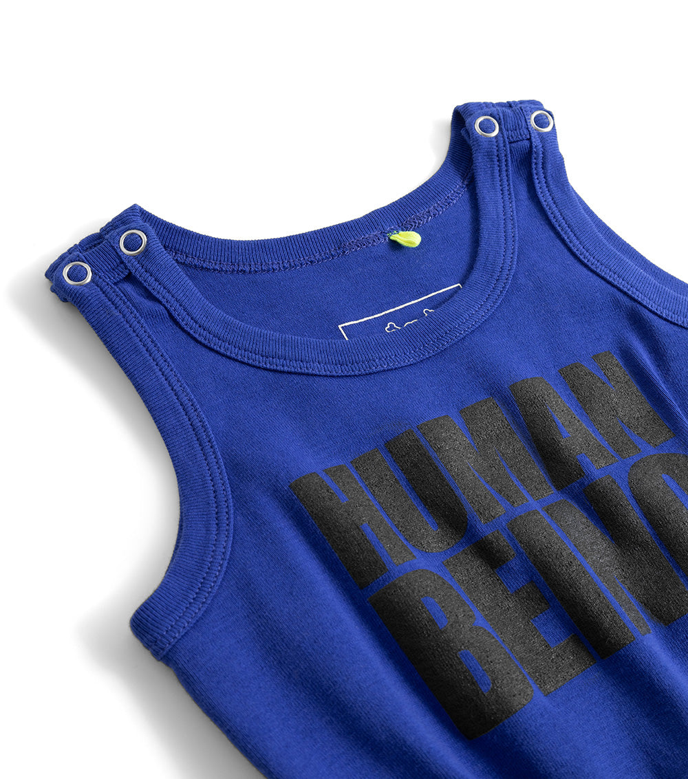 this blue one-piece sleeveless overall is the summer hit for babies. it says “human being” on the chest, in case there was any question lol. the top has a clean, high neck & the bottoms are just like our beloved yoga shorts with elastic legs & total freedom of movement. it snaps up all along the inside legs to make diaper changes fuss-free, and shoulder snaps let you pull it down from the top—whatever’s easiest in the moment.